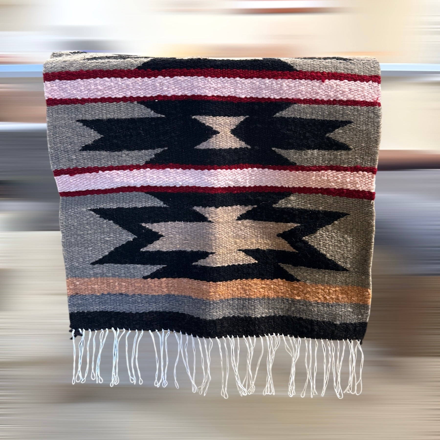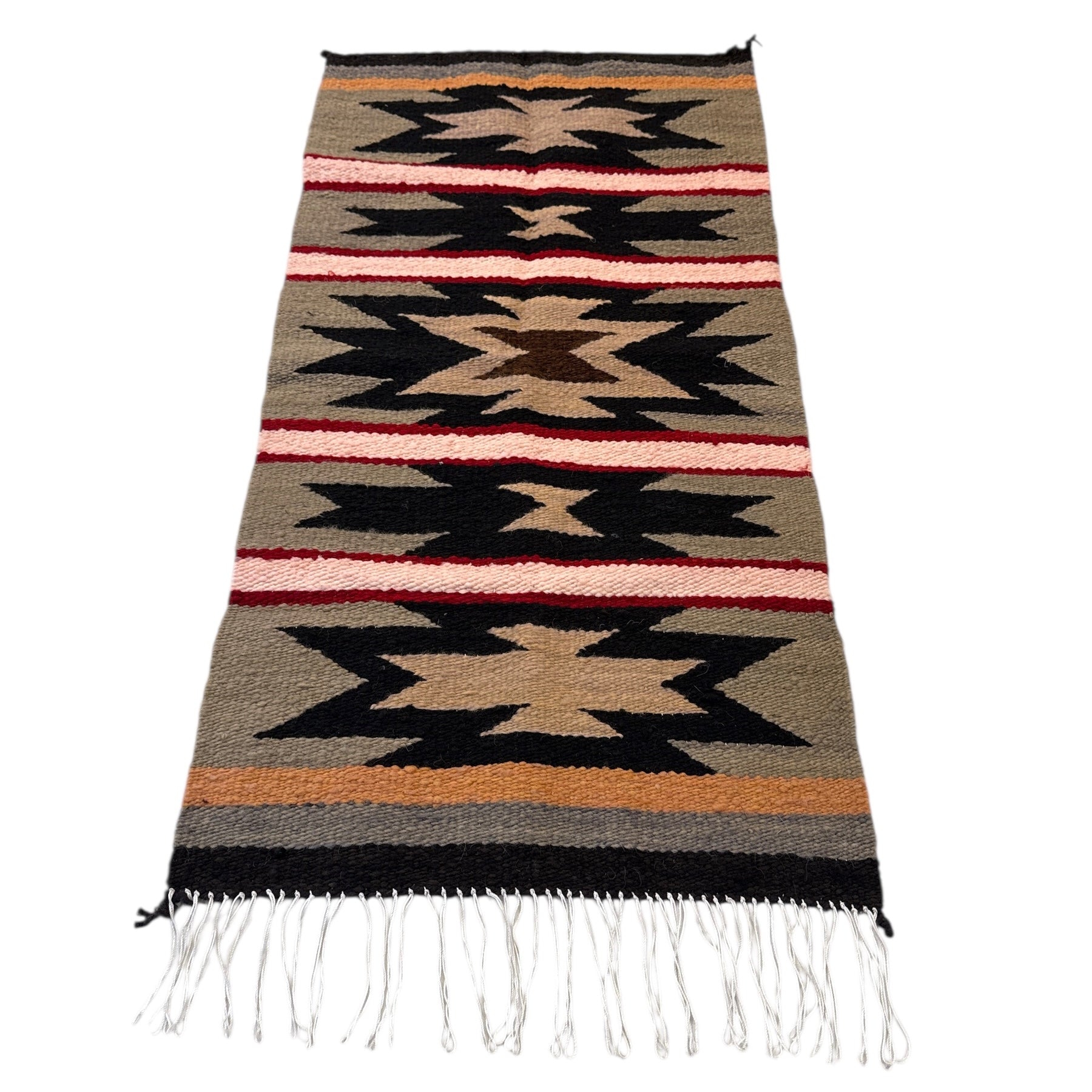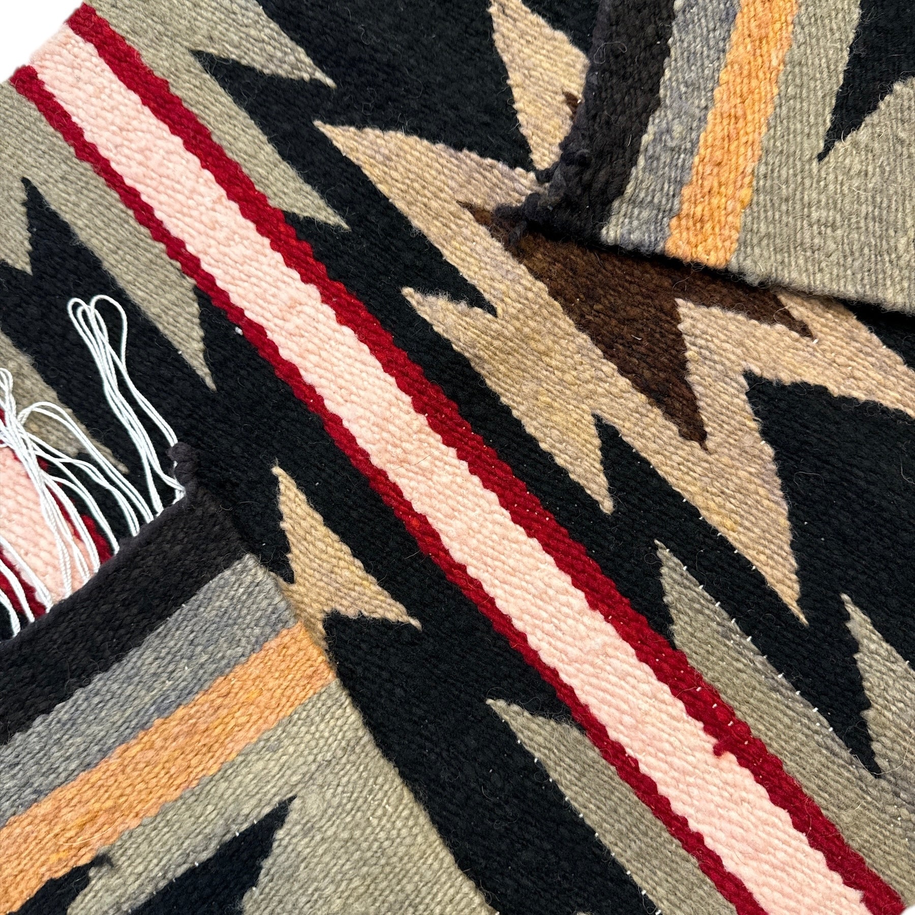 このナバホ族の手織りラグは、伝統的な技法で丁寧に織り上げられた美しい幾何学模様が特徴です。温かみのあるアースカラーを基調としたデザインは、空間にナバホの文化と手仕事の存在感を与えます。壁掛け、テーブル装飾、アクセントラグなど、さまざまな用途でお楽しみいただけます。