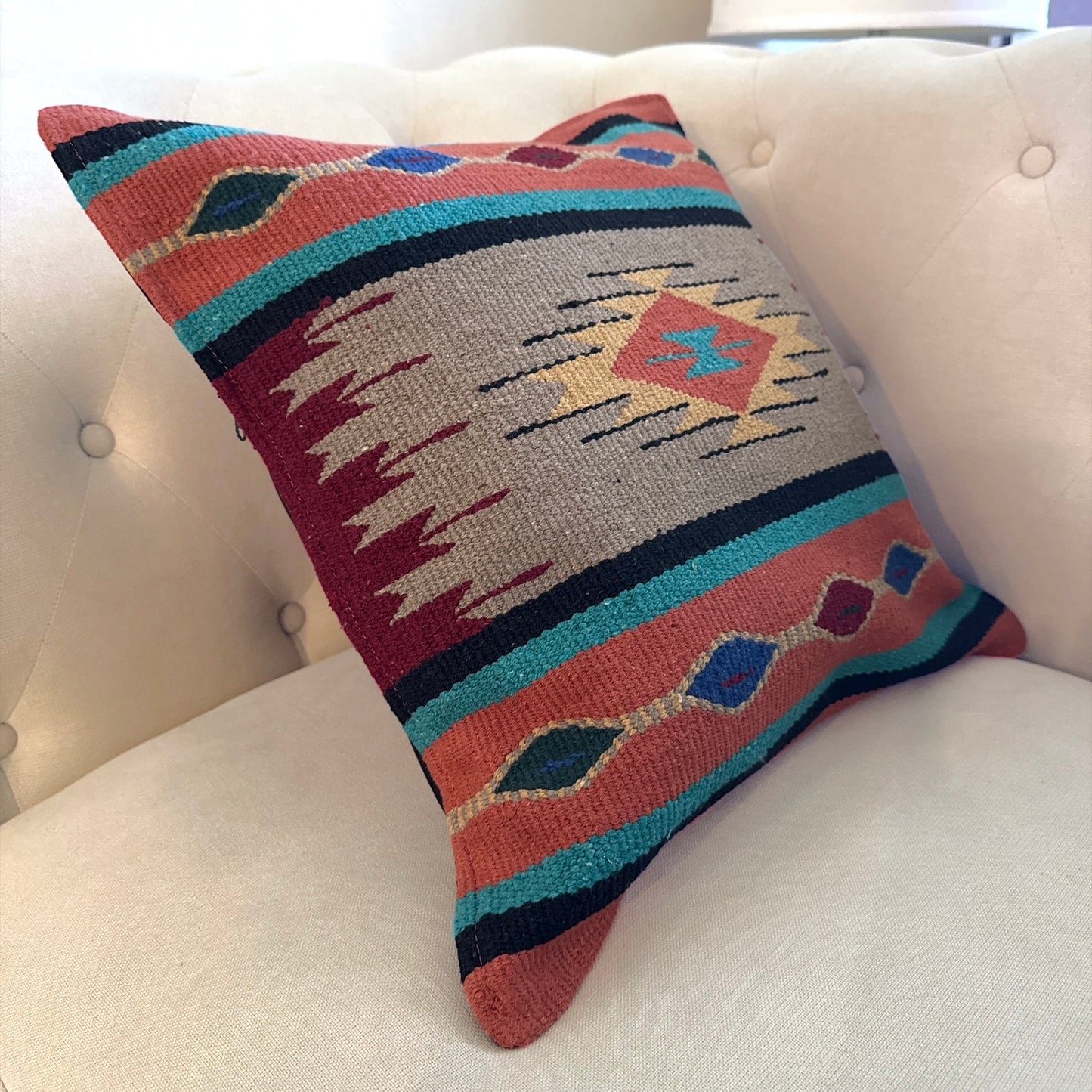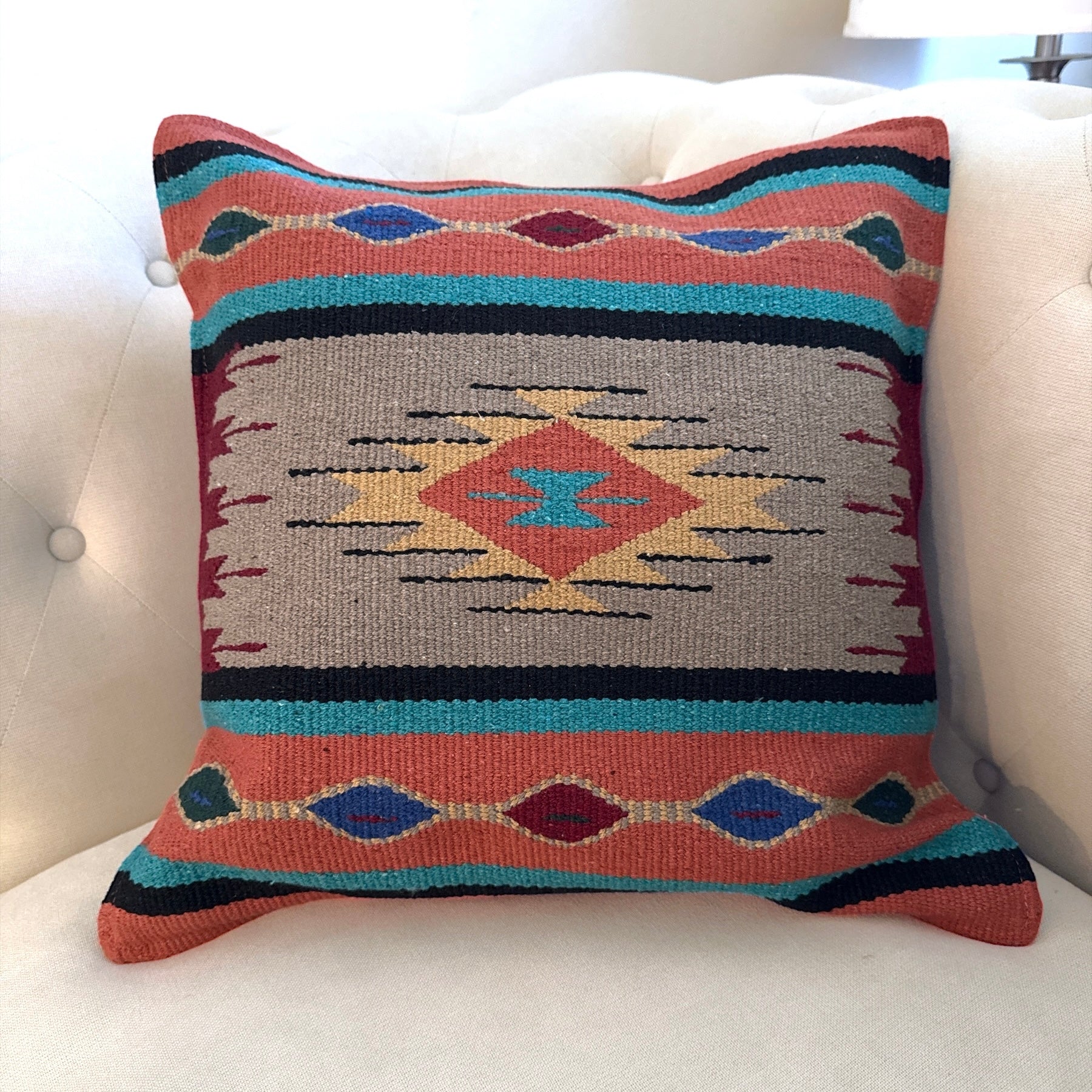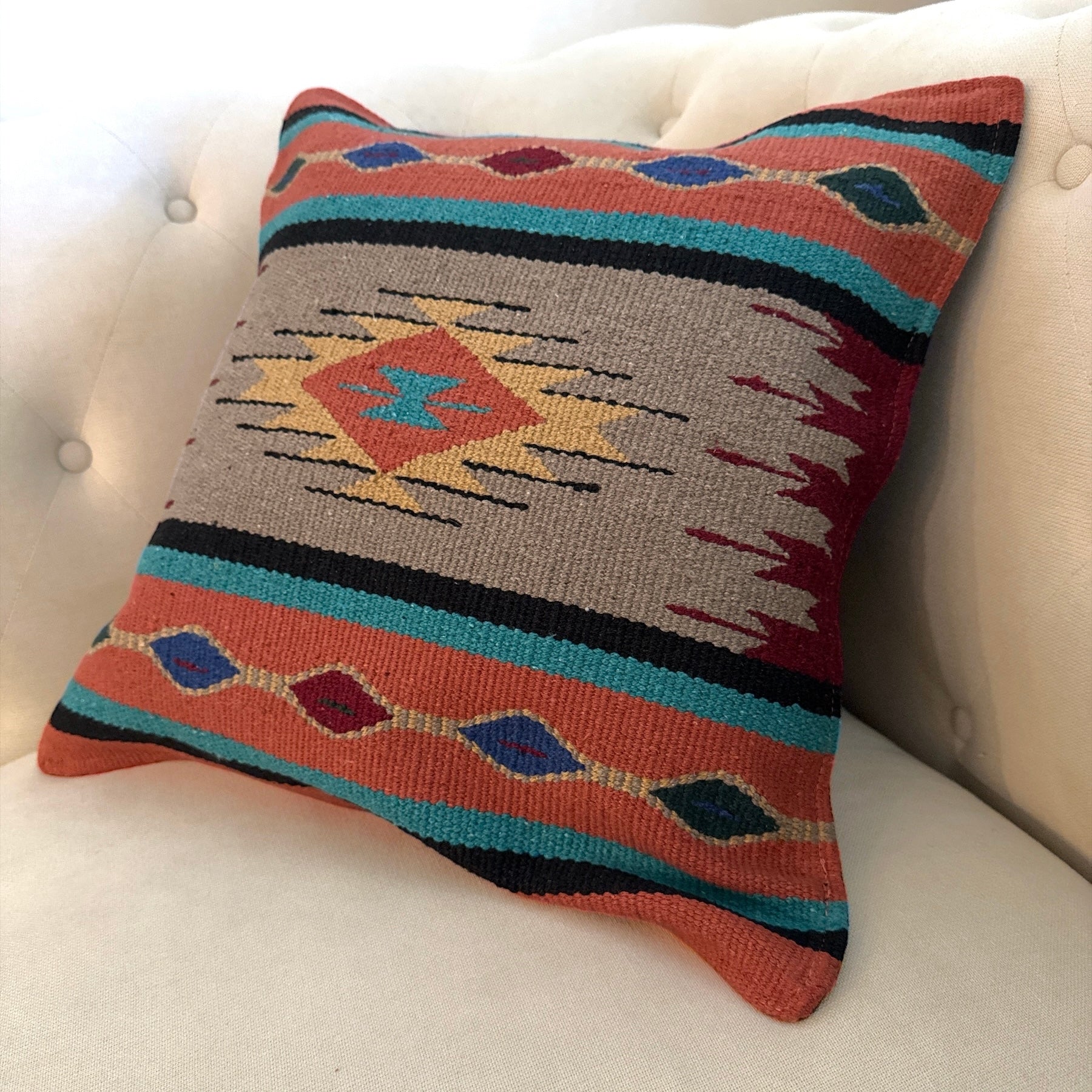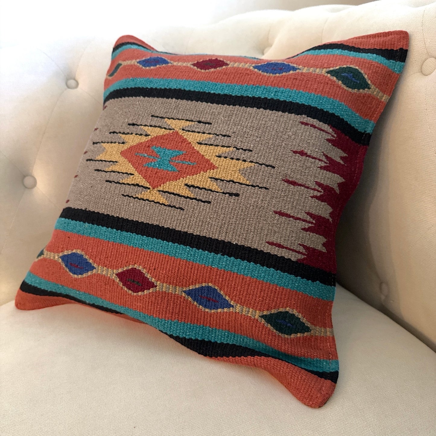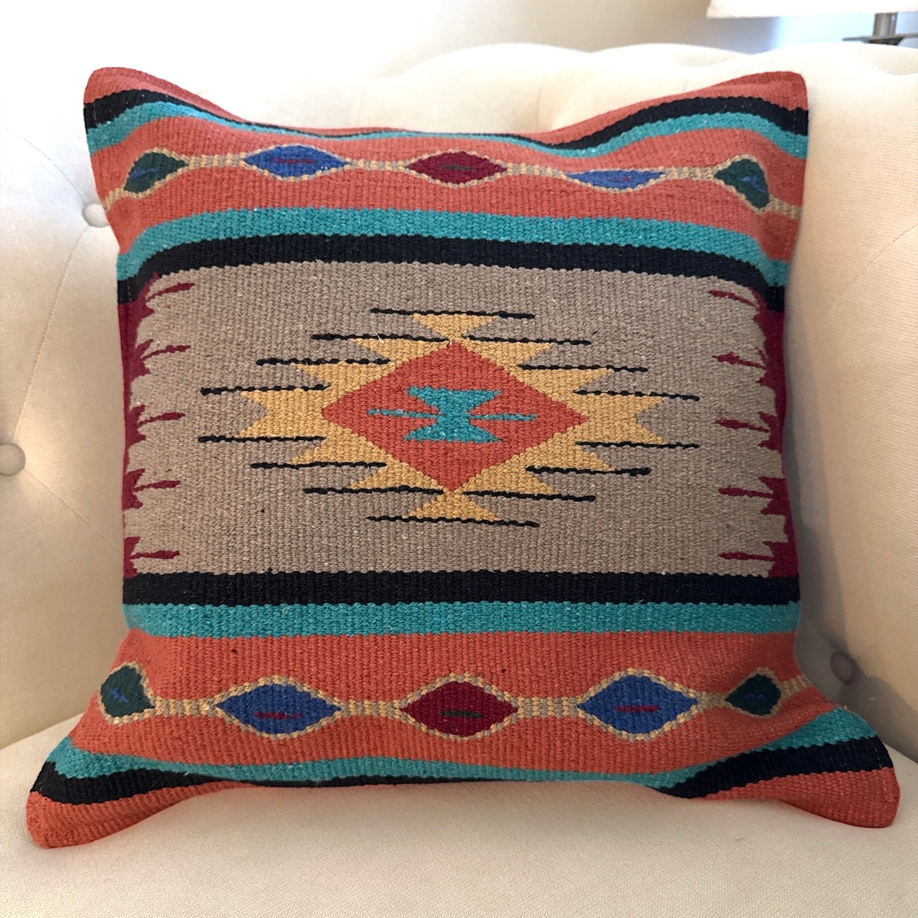 ザポテックスタイルのこの手織りクッションカバーは、サウスウエスタンな雰囲気をインテリアにプラスします。丈夫なキャンバス地の裏面とジッパー開閉で、実用性と美しさを兼ね備えています。