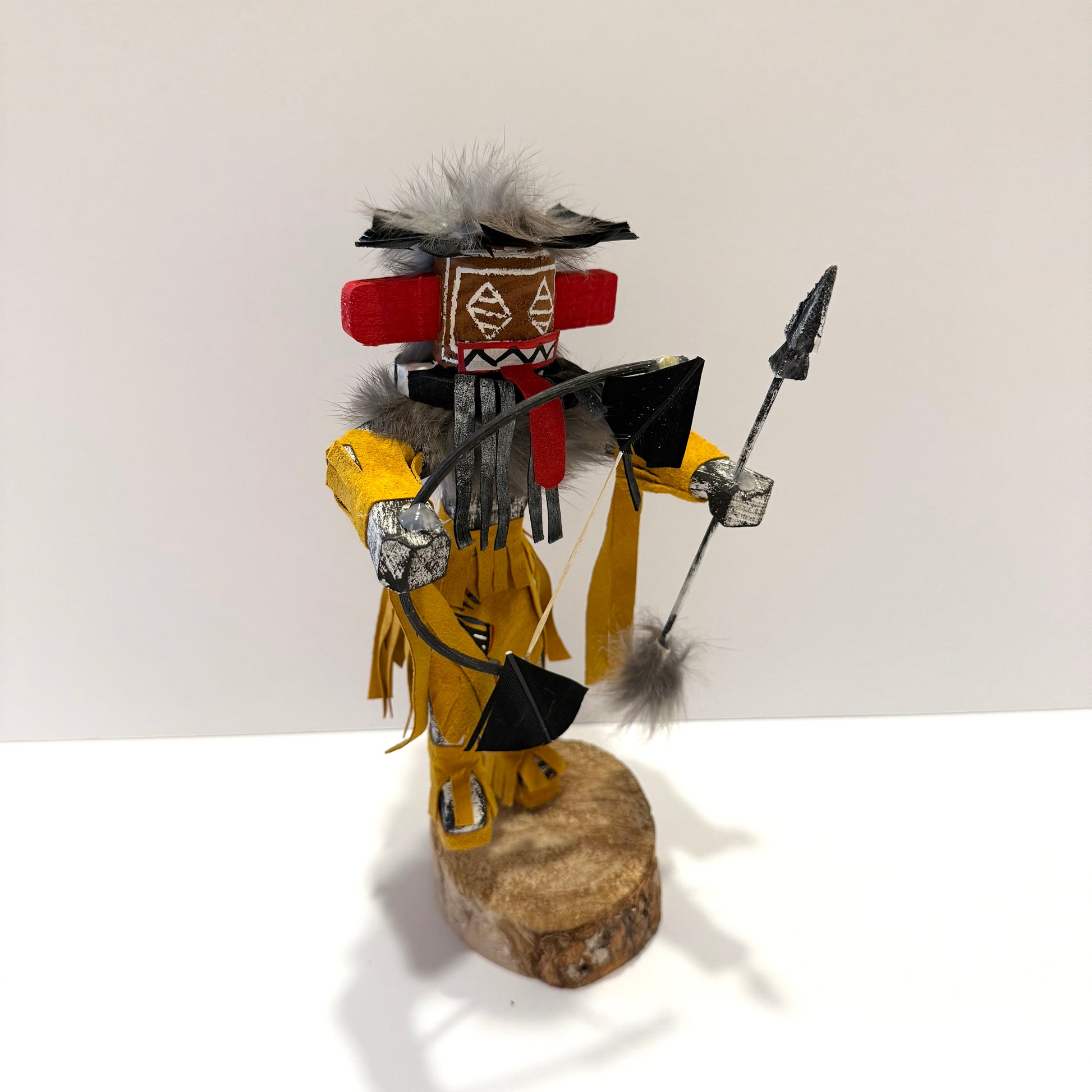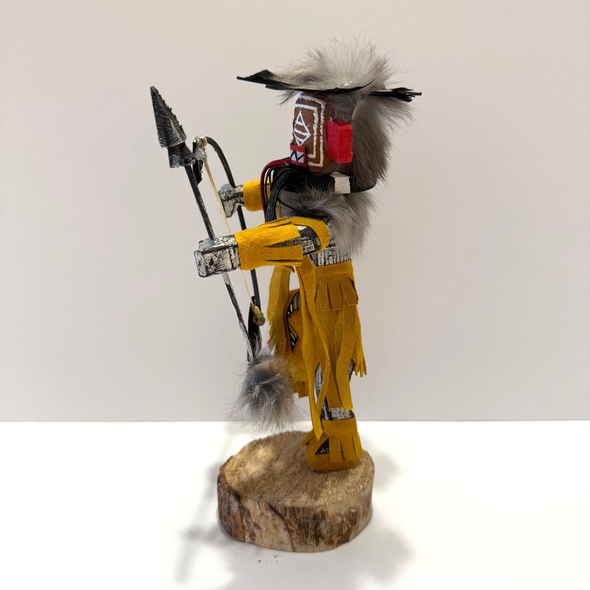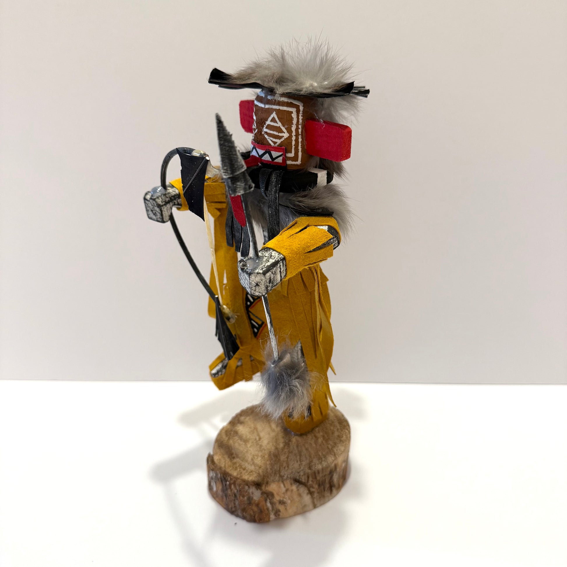 ナバホ族の職人による手作りのレフトハンデッド・ハンターカチナドール(ゴールド)。シャンゲフォヤとして知られ、左利きでありながら右手で弓を引き、狩猟を極めた存在です。