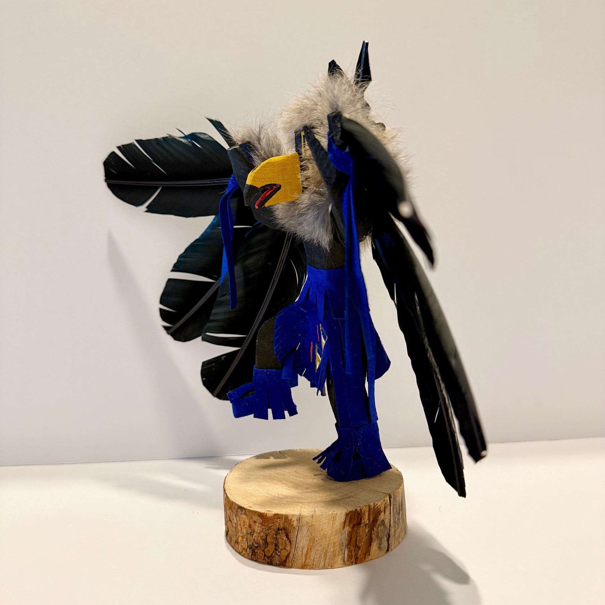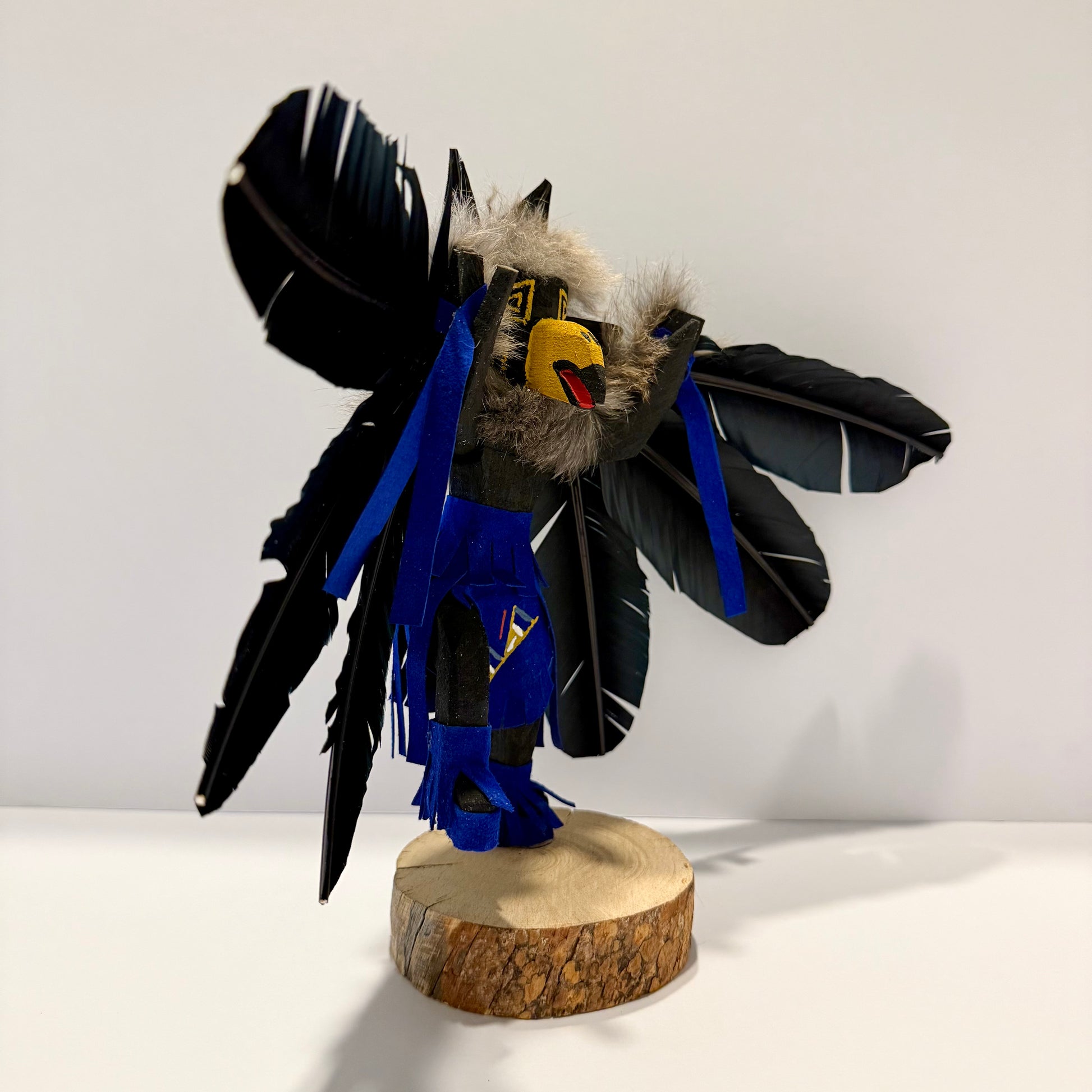 ナバホ族の職人による手作りのレイヴンカチナドール(ブルー)。創造主でありトリックスターとして知られ、ハイダ族を中心に重要な存在とされています。伝説によると、レイヴンは最初の人間を発見し、ベリーやサーモンを与えて生命を育みました。