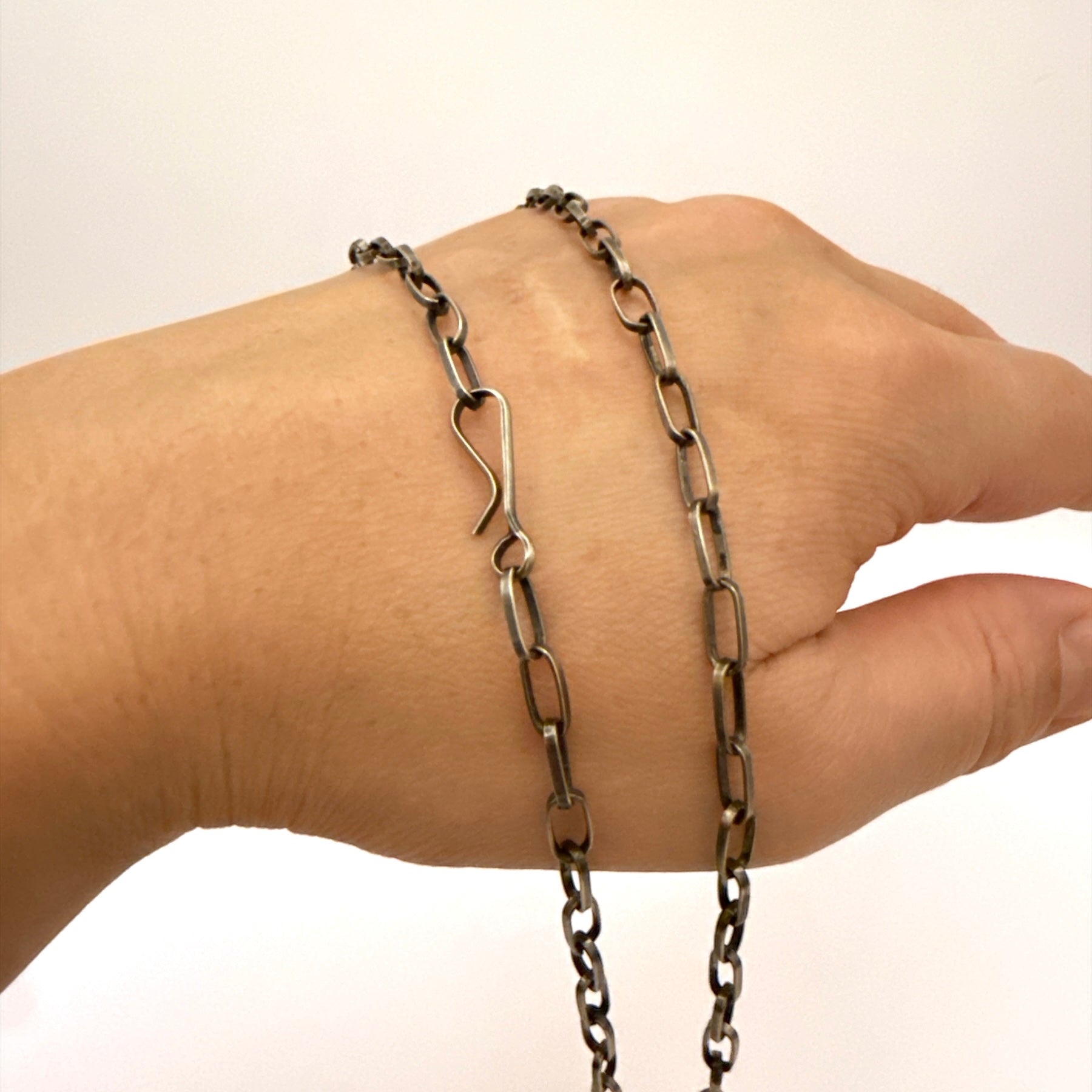 ナバホ族のアーティスト、サリー・シャーリーによるハンドメイドのスターリングシルバーチェーンネックレス(約60cm)。ヴィンテージ感のある酸化仕上げで、フッククラスプにより長さの調整が可能です。重ね付けにも、単品使いにも最適なアイテムです。