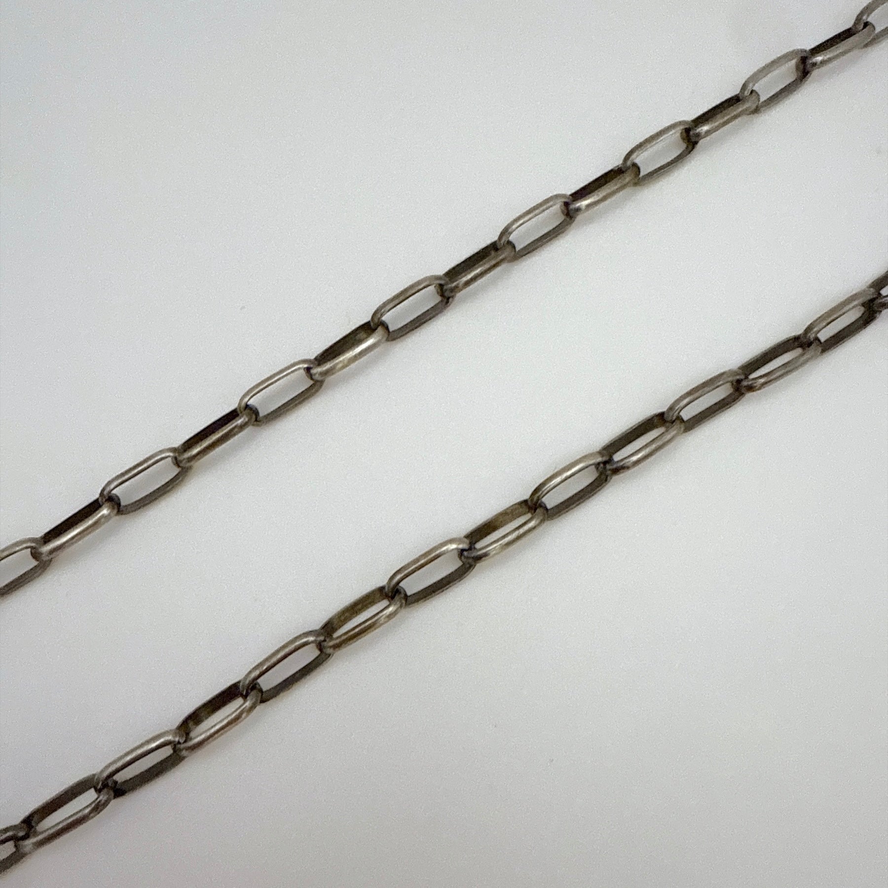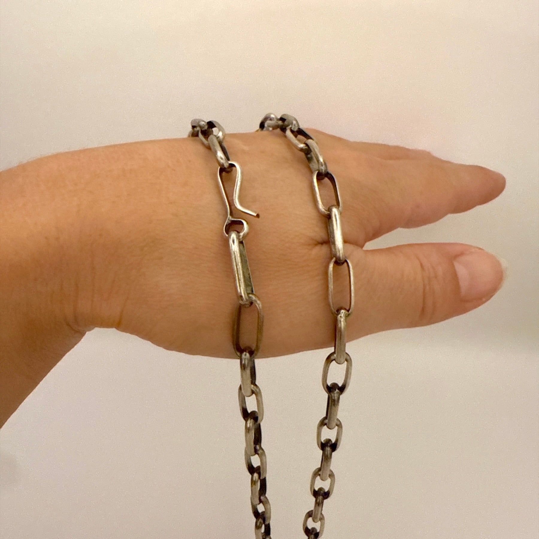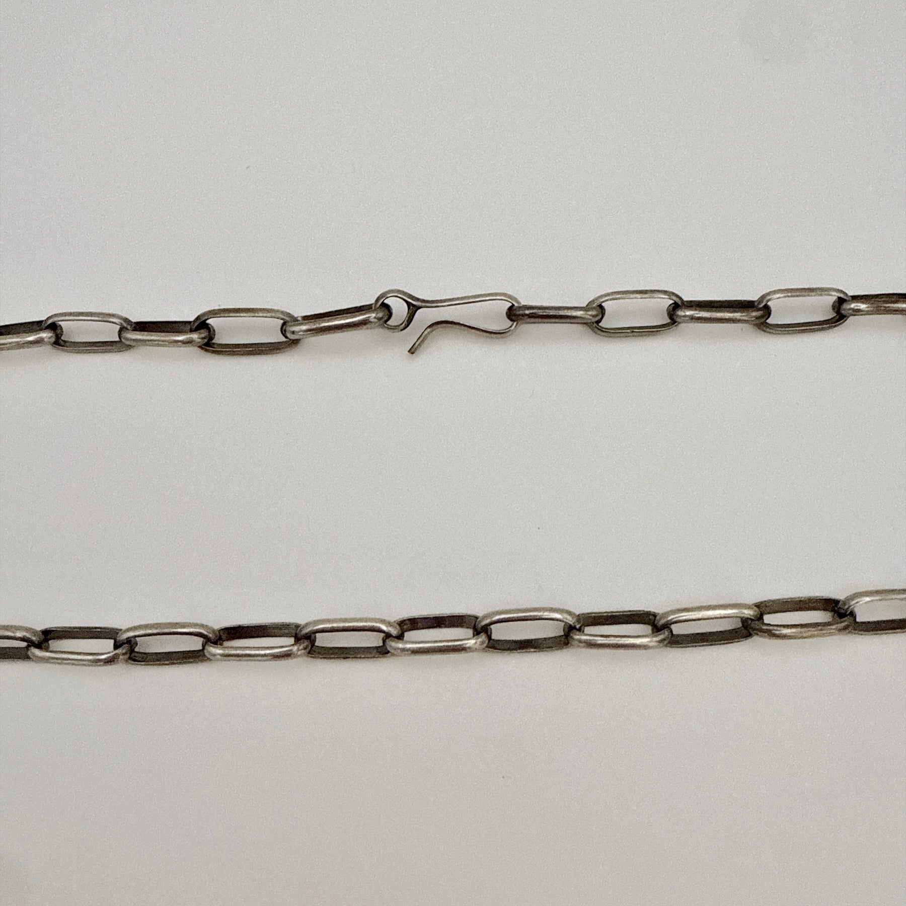 ナバホ族のアーティスト、サリー・シャーリーによるハンドメイドのスターリングシルバーチェーンネックレス(約60cm)。フック式クラスプを採用し、長さの調整が可能です。1/2インチ(約12mm)の大きめリンクが特徴で、単品使いにも重ね付けにもぴったりな存在感のあるアイテムです。