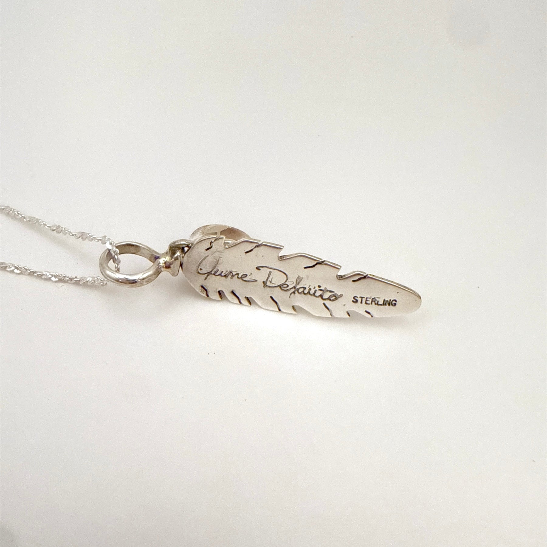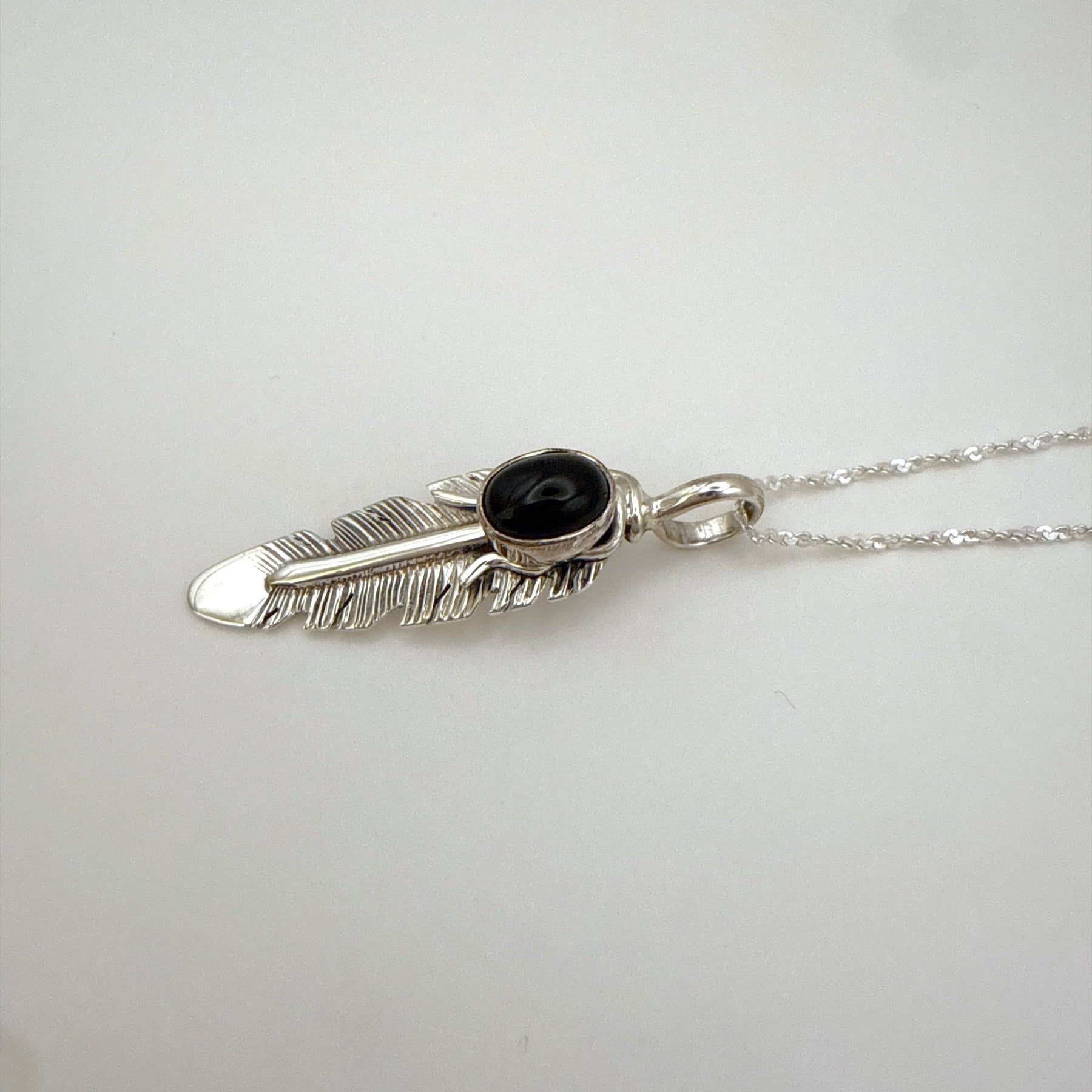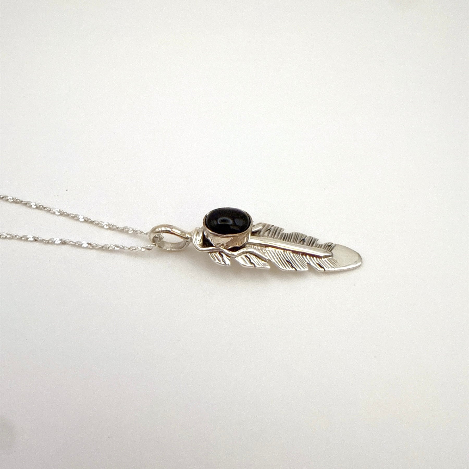 ナバホ族アーティスト、ジューン・デフォートによるハンドメイドのスターリングシルバーフェザーペンダントです。美しいブラックオニキスと細かなスタンプワークが特徴で、伝統と上品さを兼ね備えたデザインです。付属のチェーンはインド製スターリングシルバー4cm。お好みのチェーンに付け替えて楽しむこともできます。