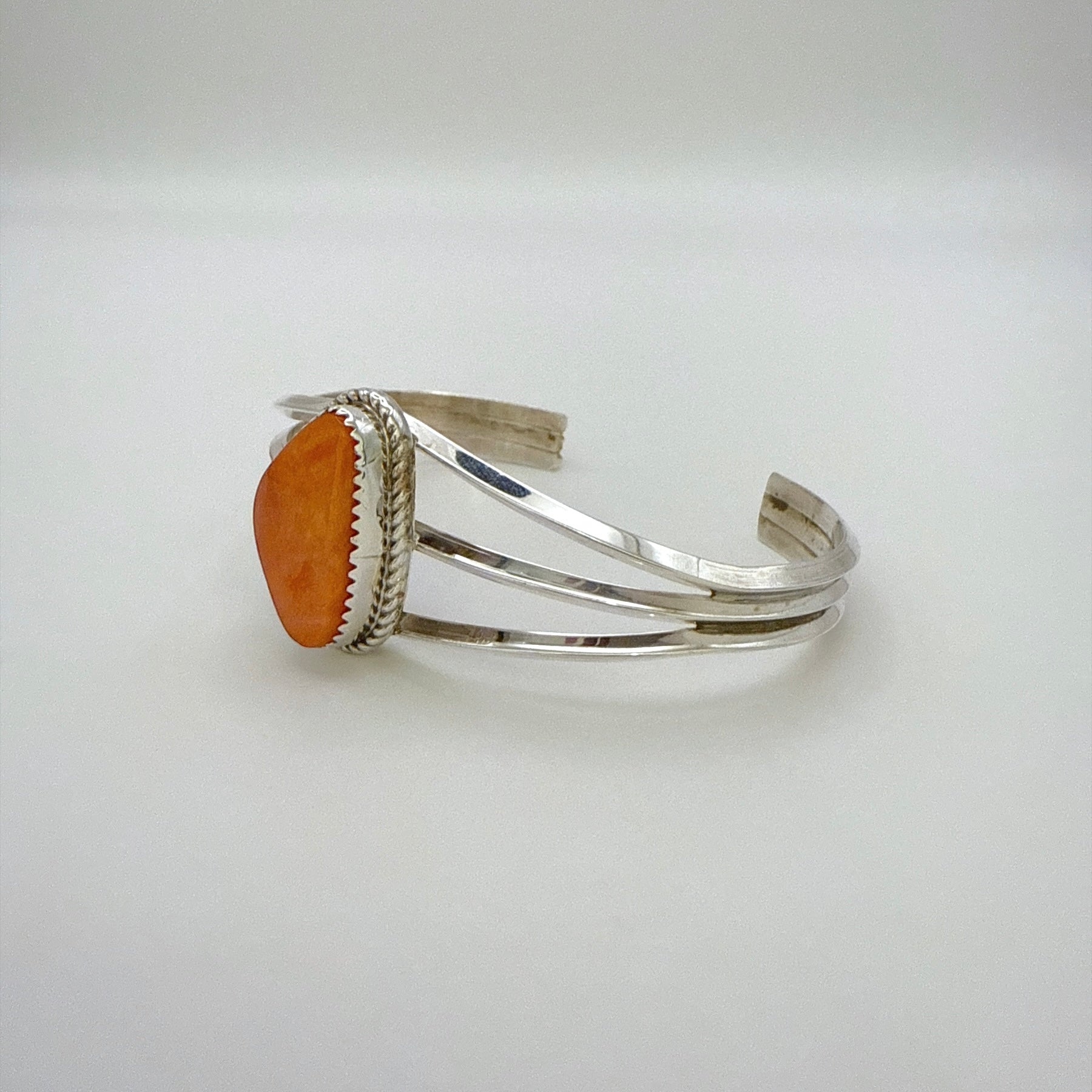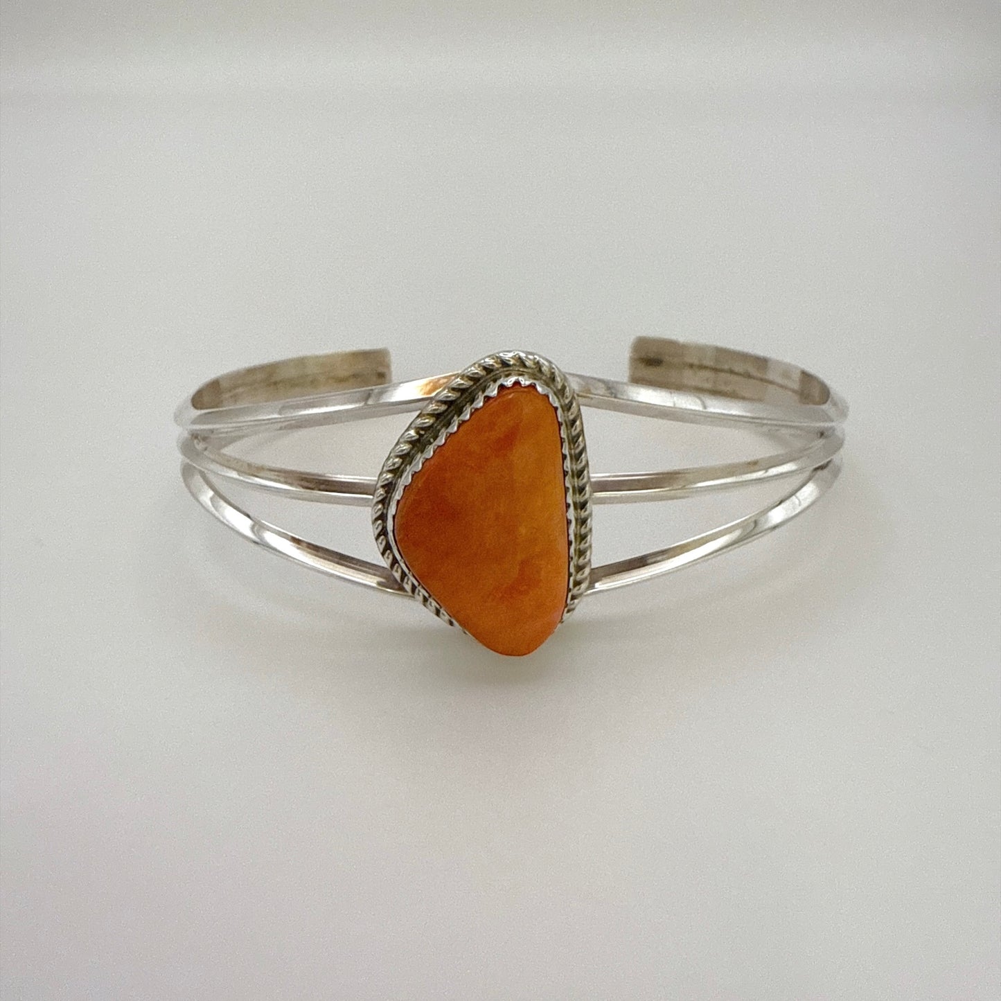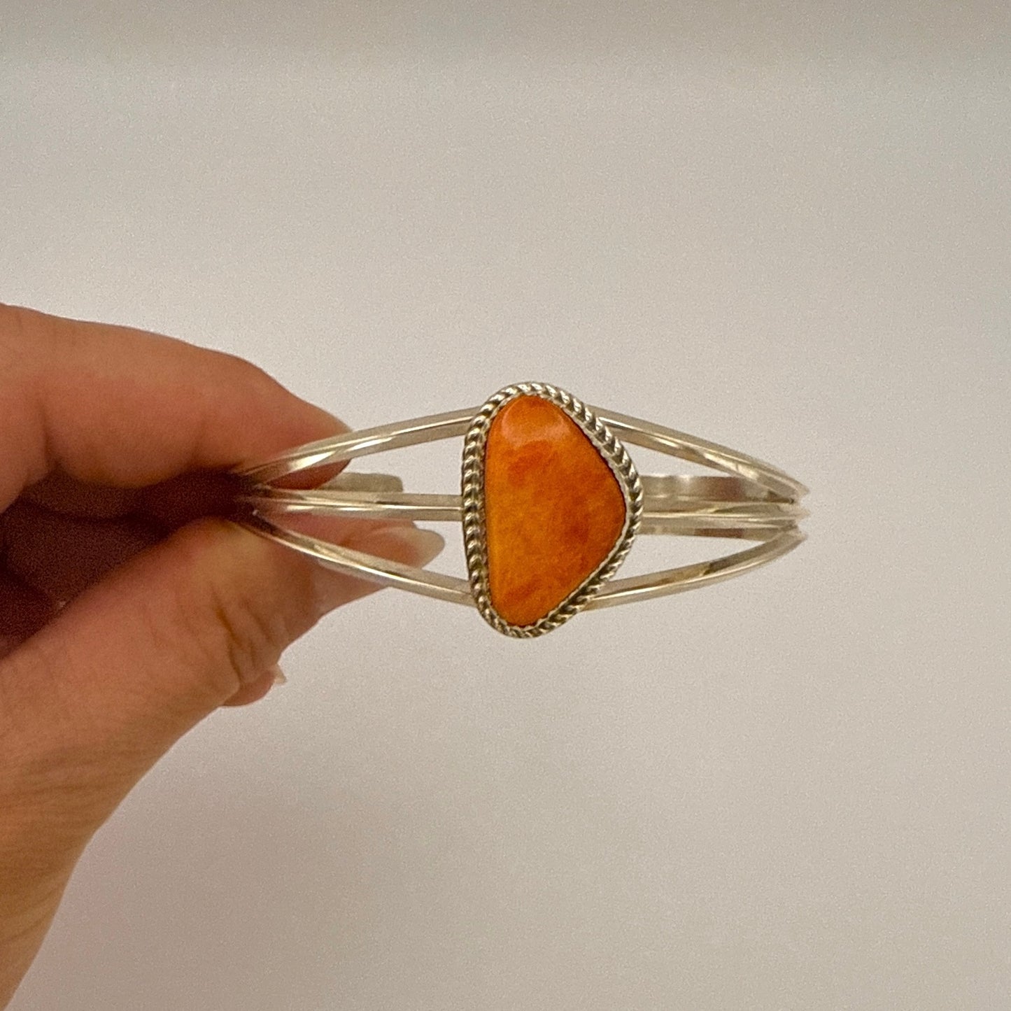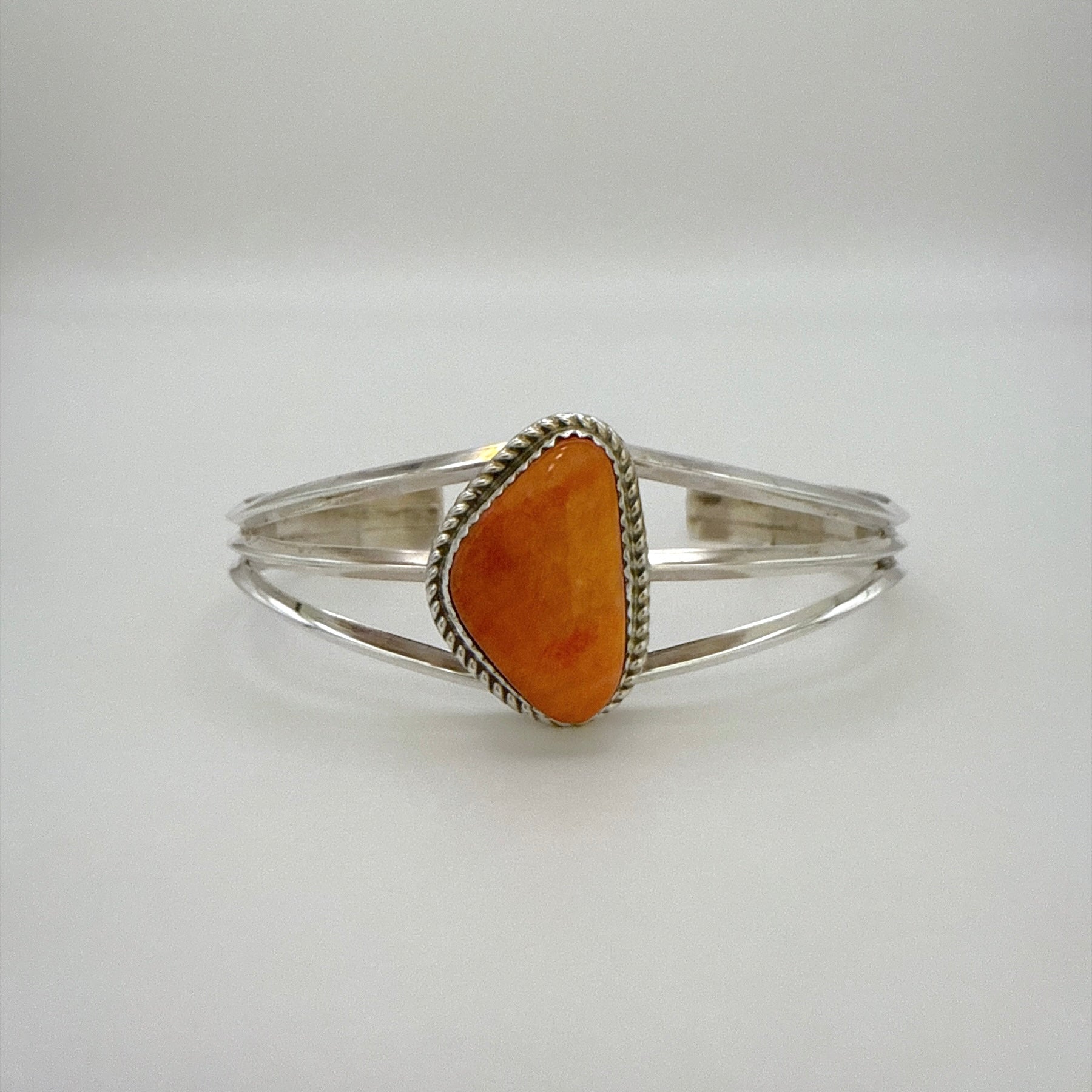トライアングルシェイプのオレンジスパイニーオイスターをセットしたシルバーバングルです。ナバホアーティスト、Julia Etsittyによるハンドメイドです。光沢仕上げのシャンクがエレガントで美しいワンストーンを際立て、まさにシンプルビューティー!このバングルは多少のサイズ調整が可能です。