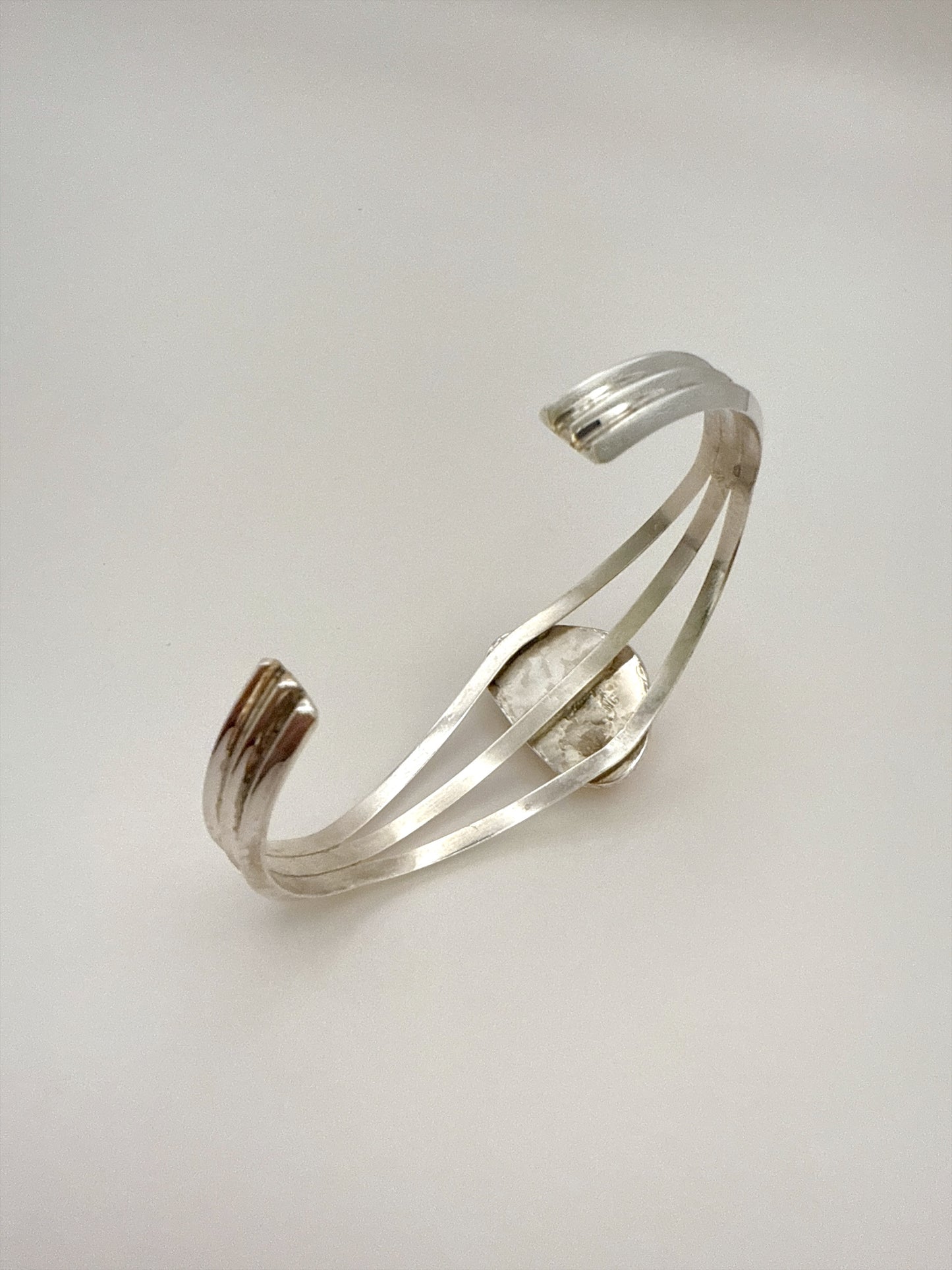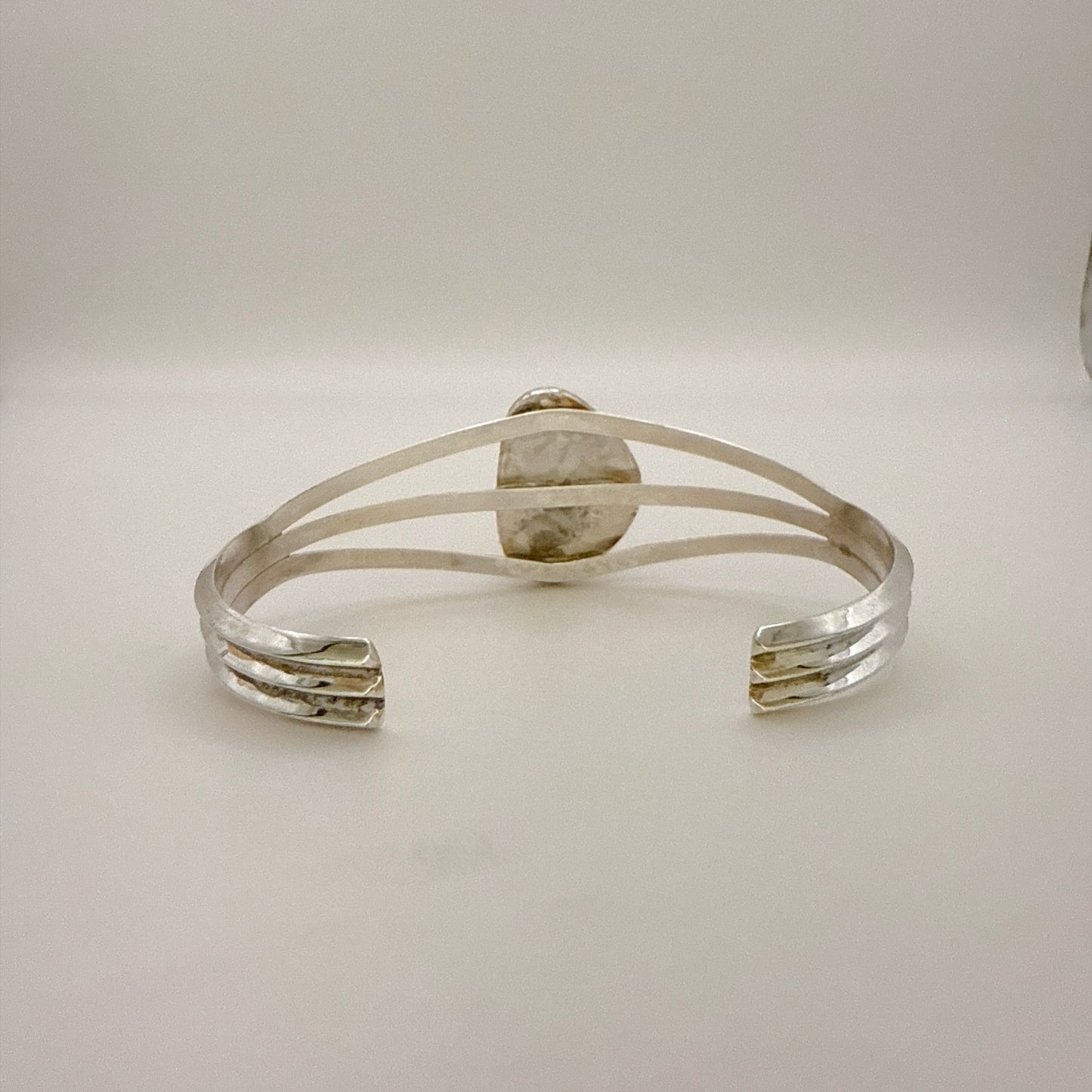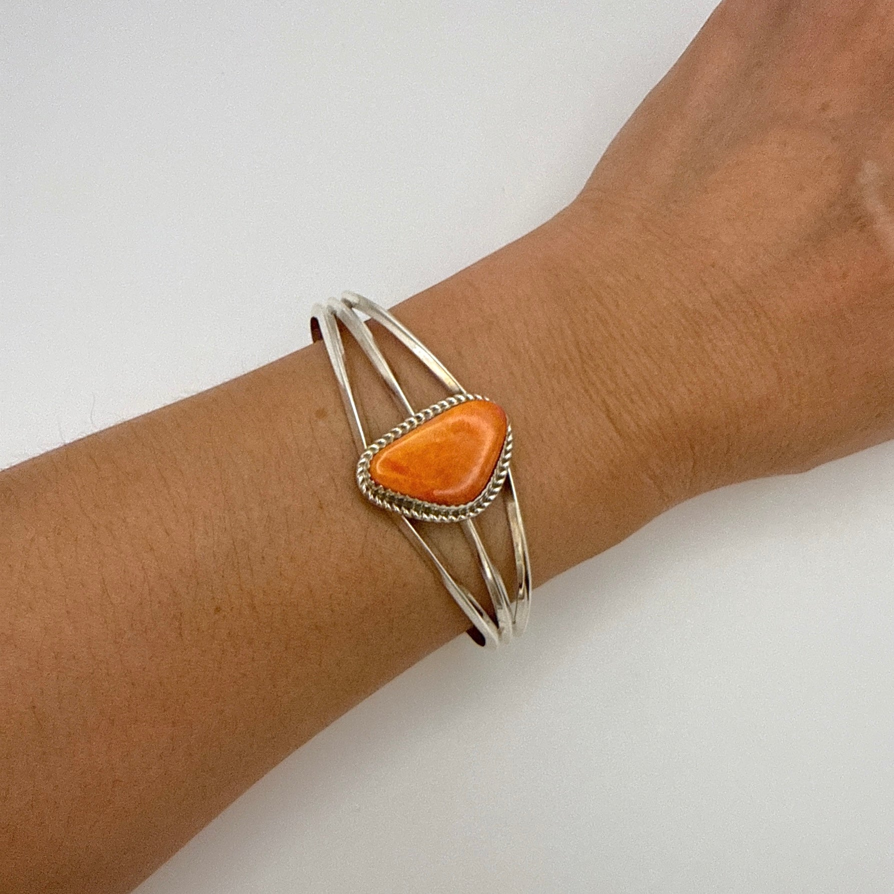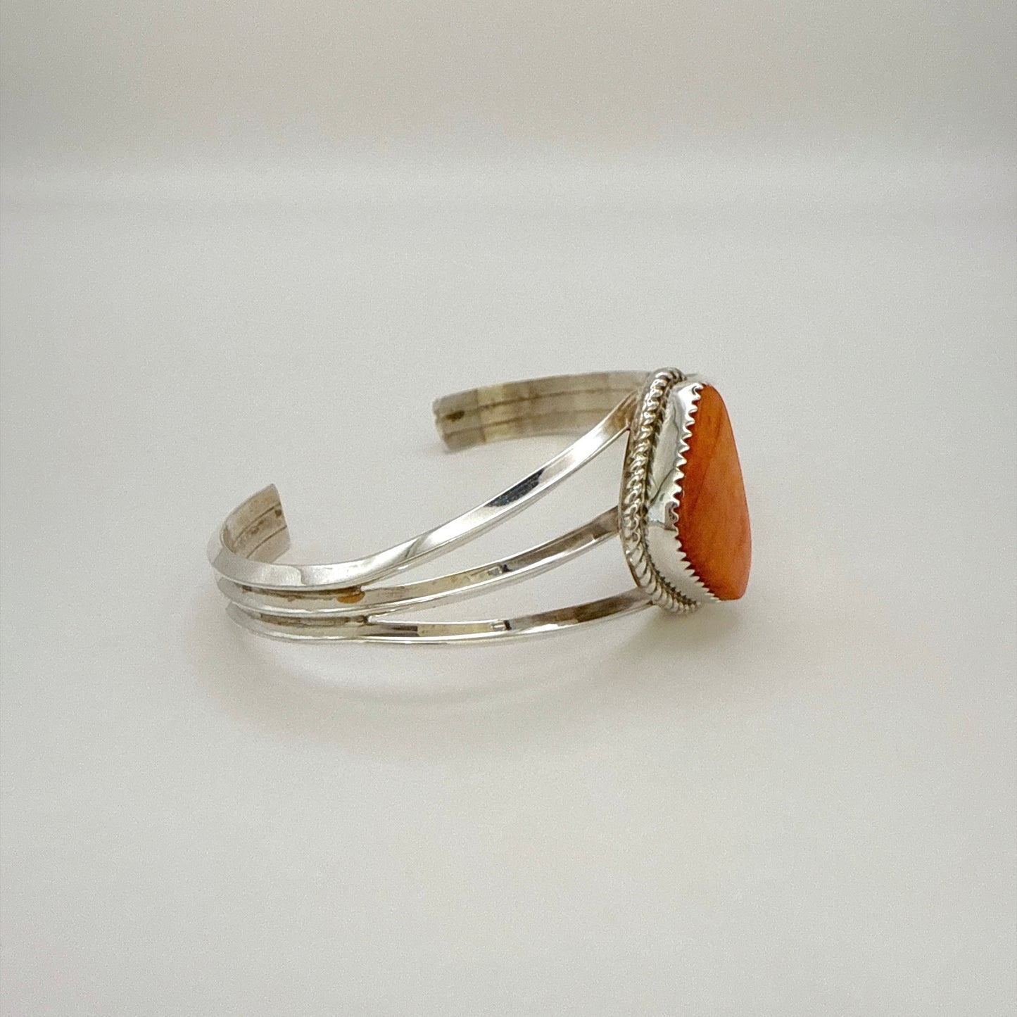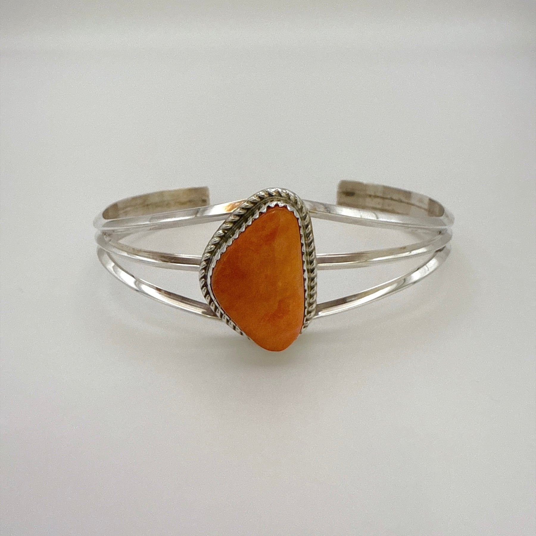 トライアングルシェイプのオレンジスパイニーオイスターをセットしたシルバーバングルです。ナバホアーティスト、Julia Etsittyによるハンドメイドです。光沢仕上げのシャンクがエレガントで美しいワンストーンを際立て、まさにシンプルビューティー!このバングルは多少のサイズ調整が可能です。