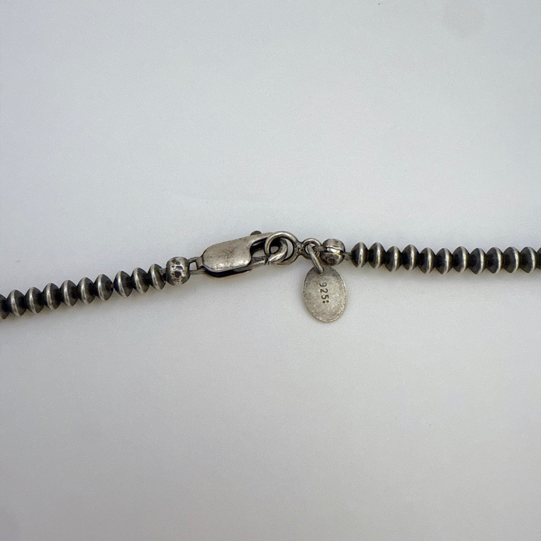 ナバホ族アーティストによって手作業で連結された、3mmのそろばん型ナバホパールを使用したスターリングシルバーのネックレスです。美しい酸化仕上げが施され、単体でも重ね付けでも楽しめるシンプルで上品なデザインです。ロブスタークラスプで着脱もしやすく、日常使いにも最適です。