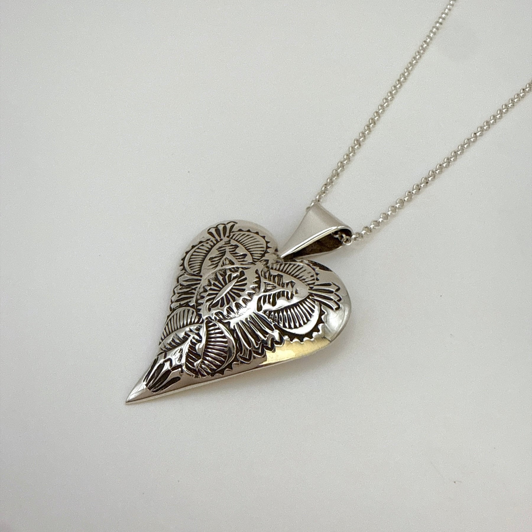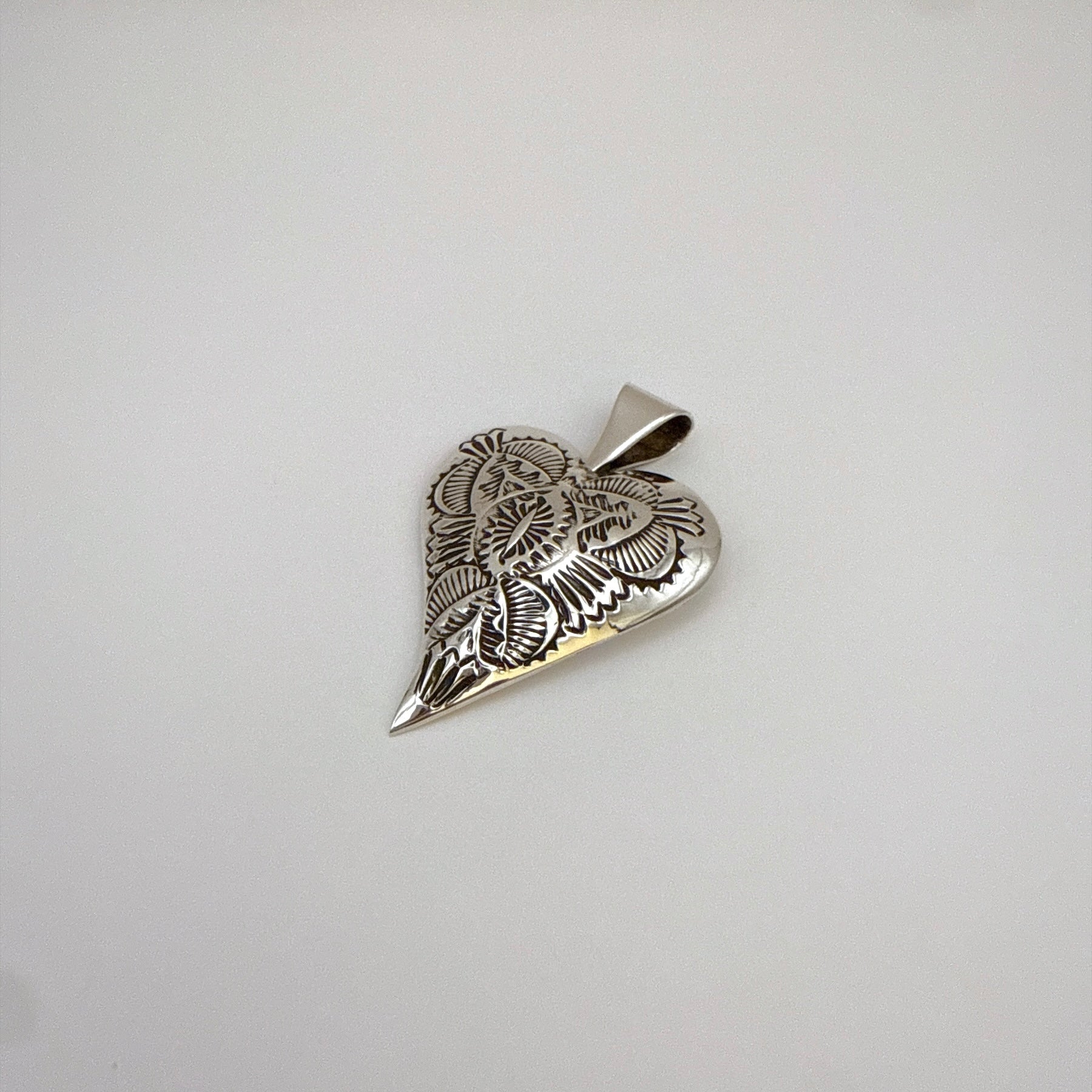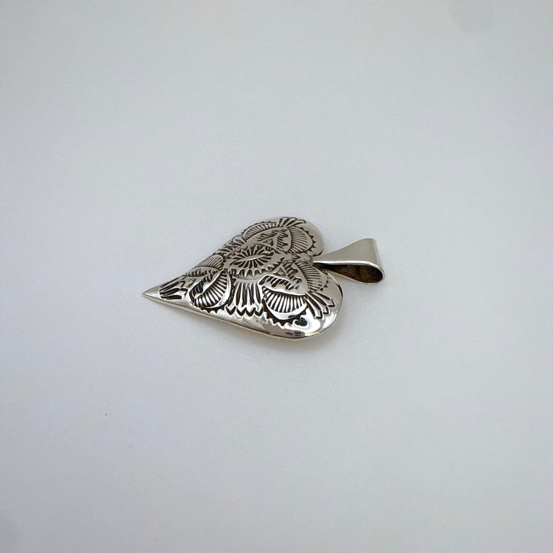 ナバホ族アーティスト、シャーリー・スキーツによるスタンプワークのハートペンダントです。立体的なハートシェイプに細やかなスタンプ模様を施し、上品さと存在感を兼ね備えたデザインに仕上げています。お手持ちのチェーンと合わせてお楽しみいただけます。