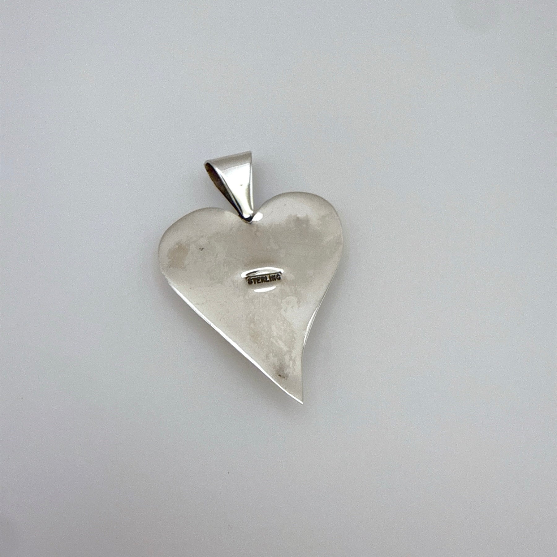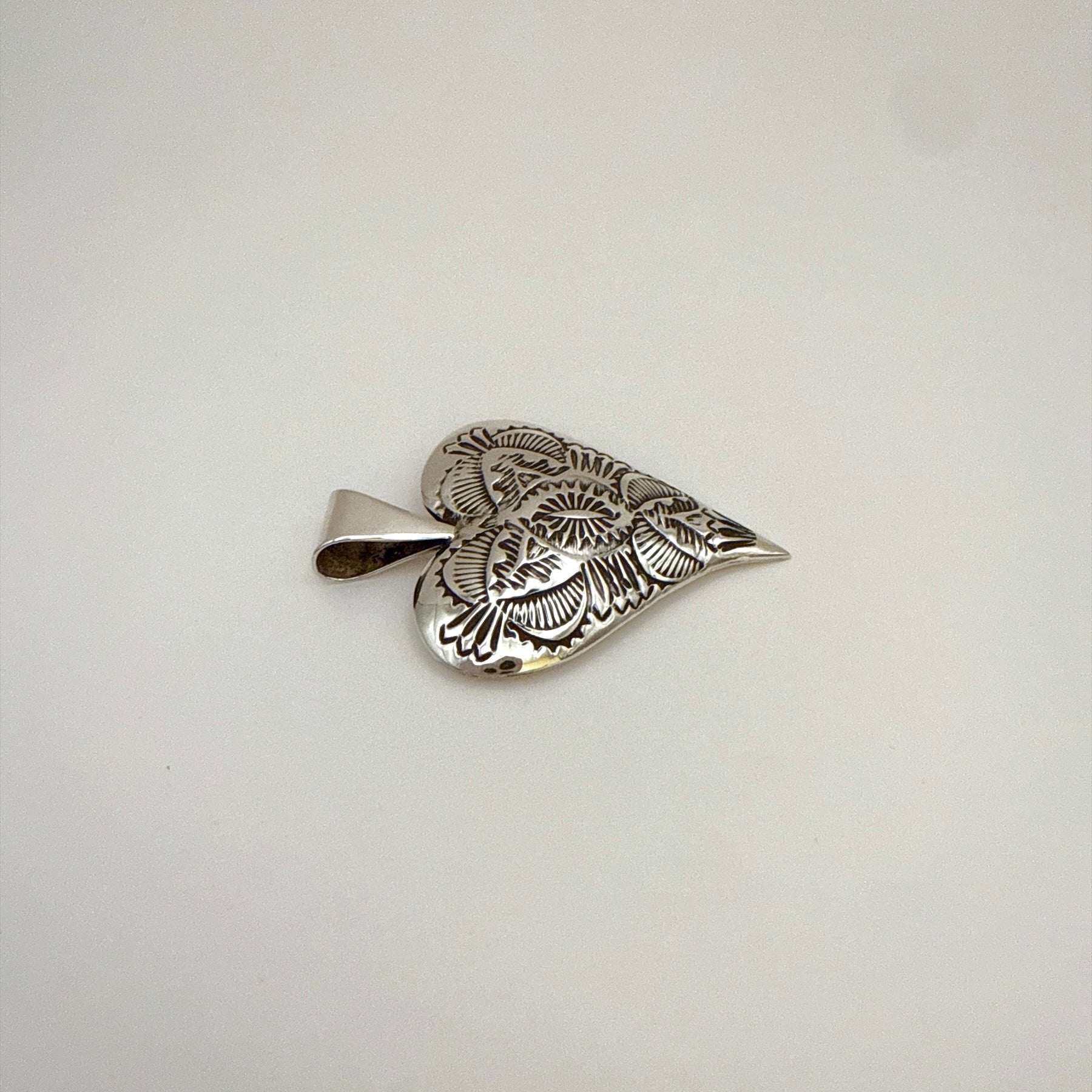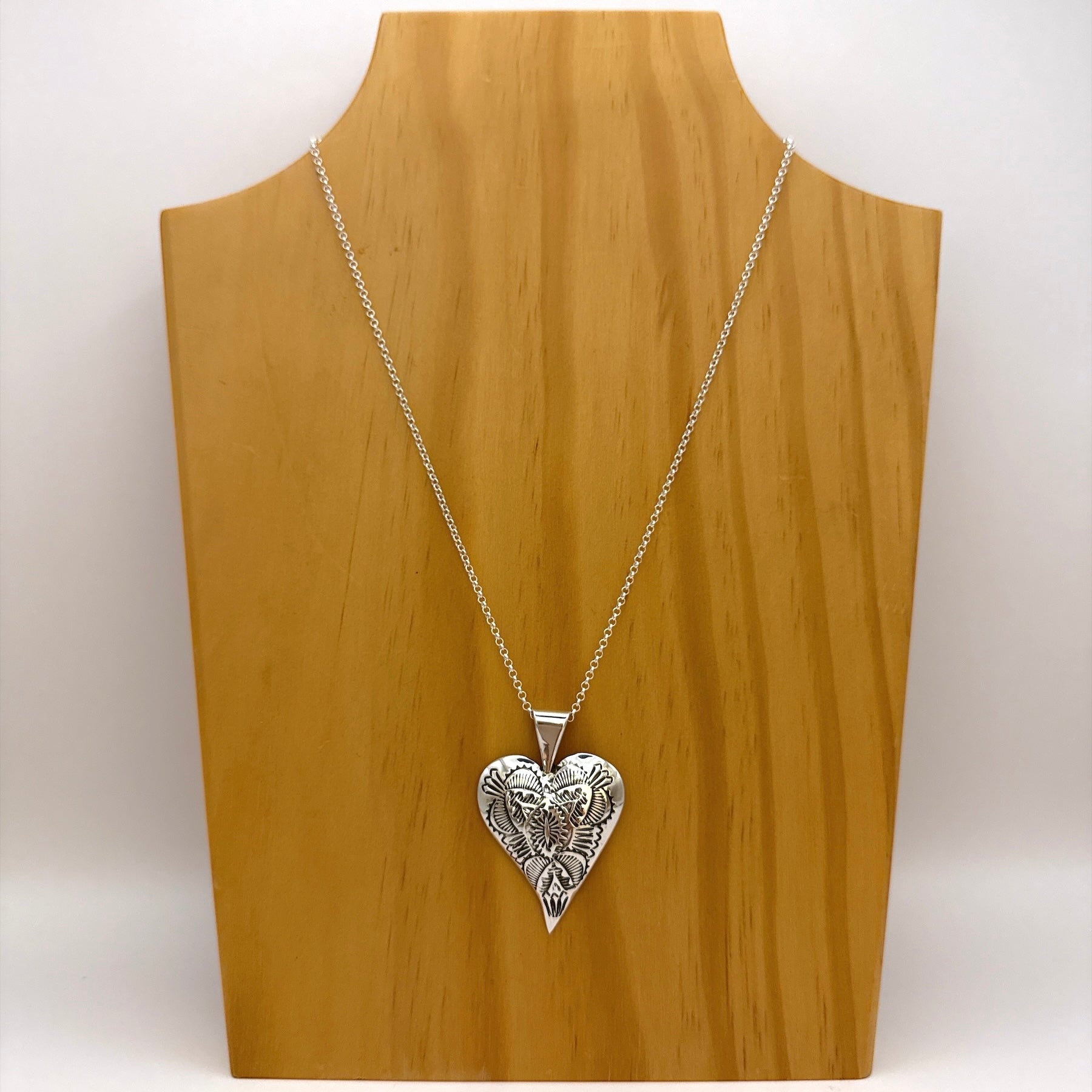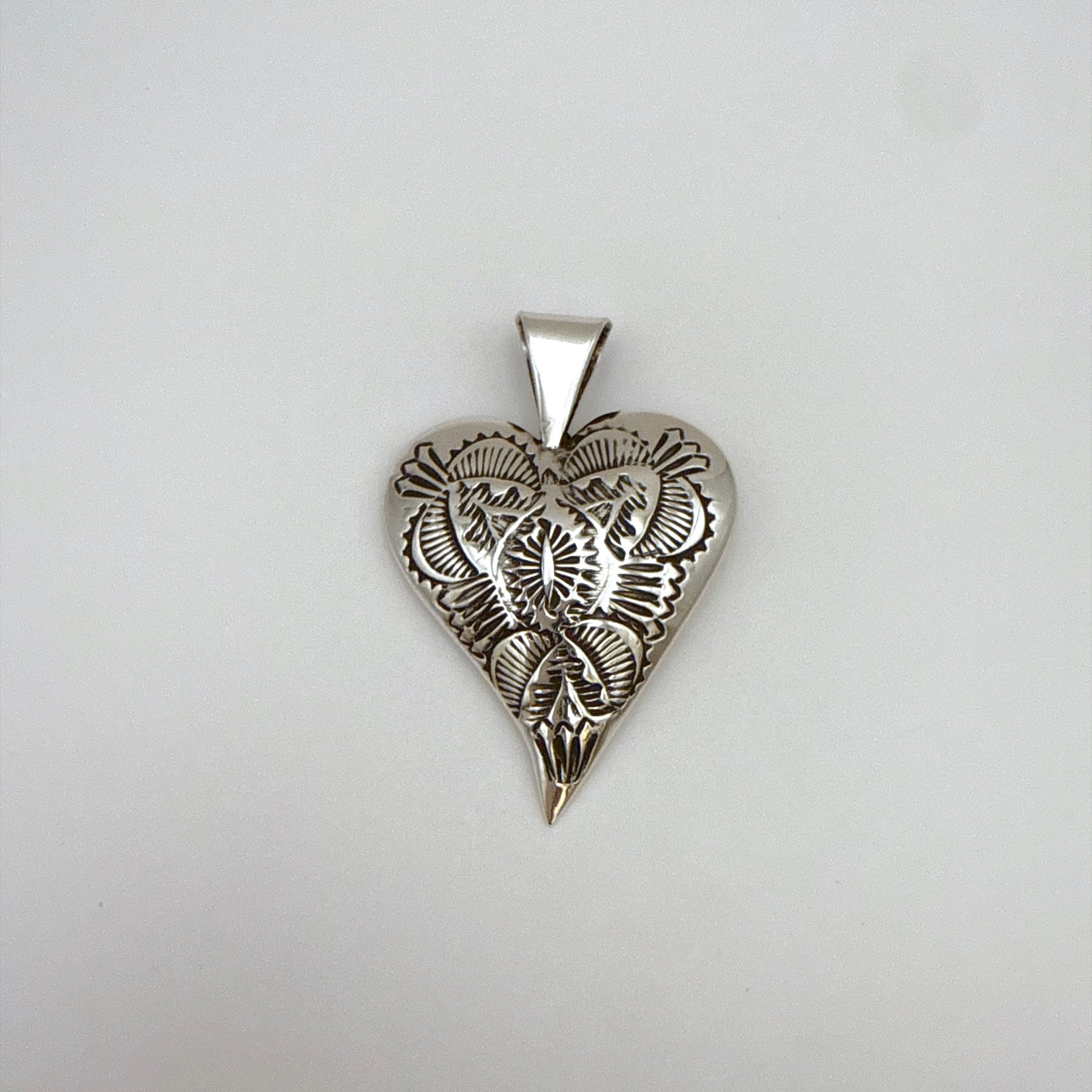 ナバホ族アーティスト、シャーリー・スキーツによるスタンプワークのハートペンダントです。立体的なハートシェイプに細やかなスタンプ模様を施し、上品さと存在感を兼ね備えたデザインに仕上げています。お手持ちのチェーンと合わせてお楽しみいただけます。