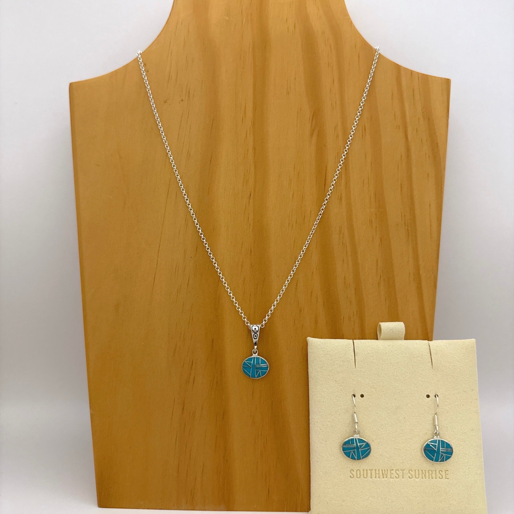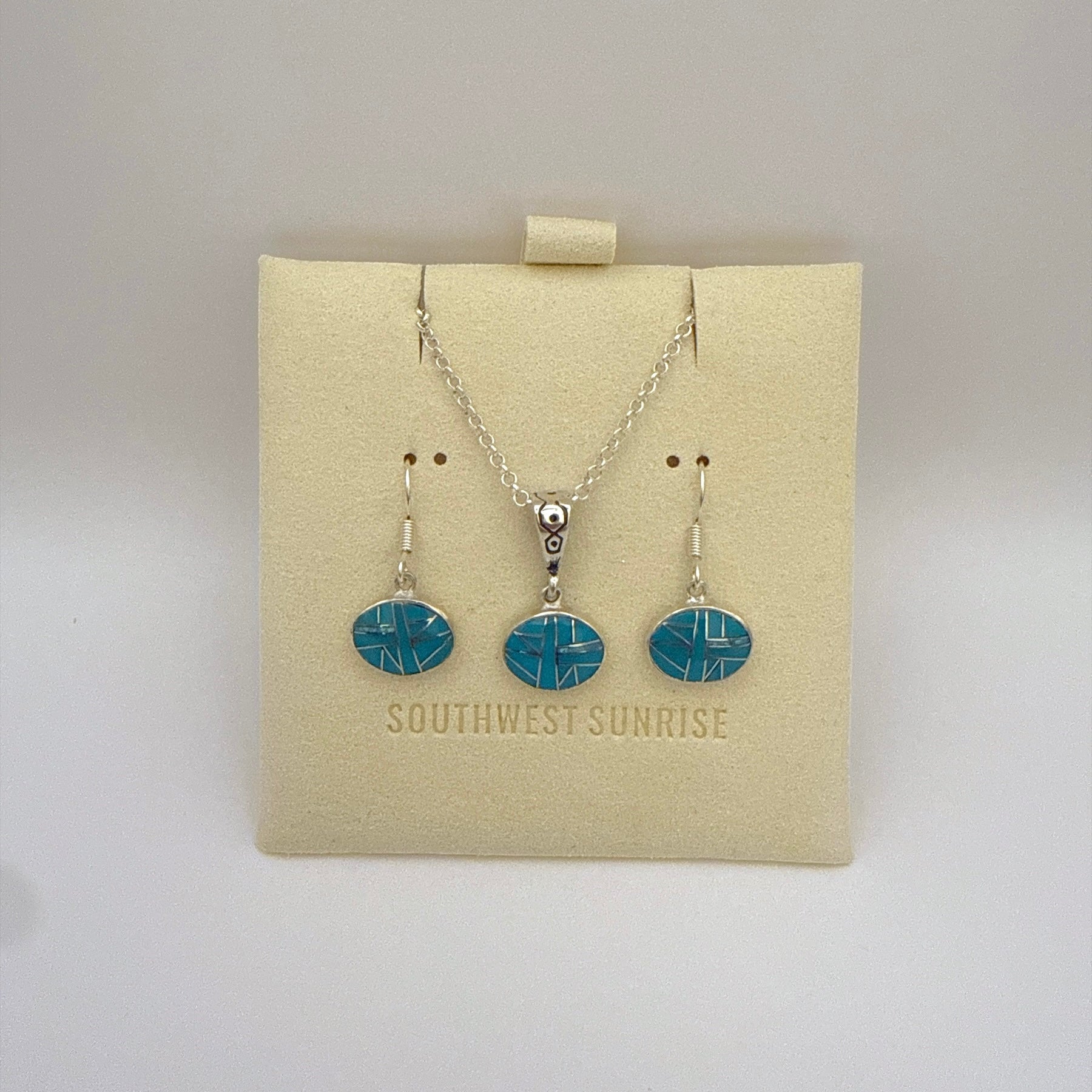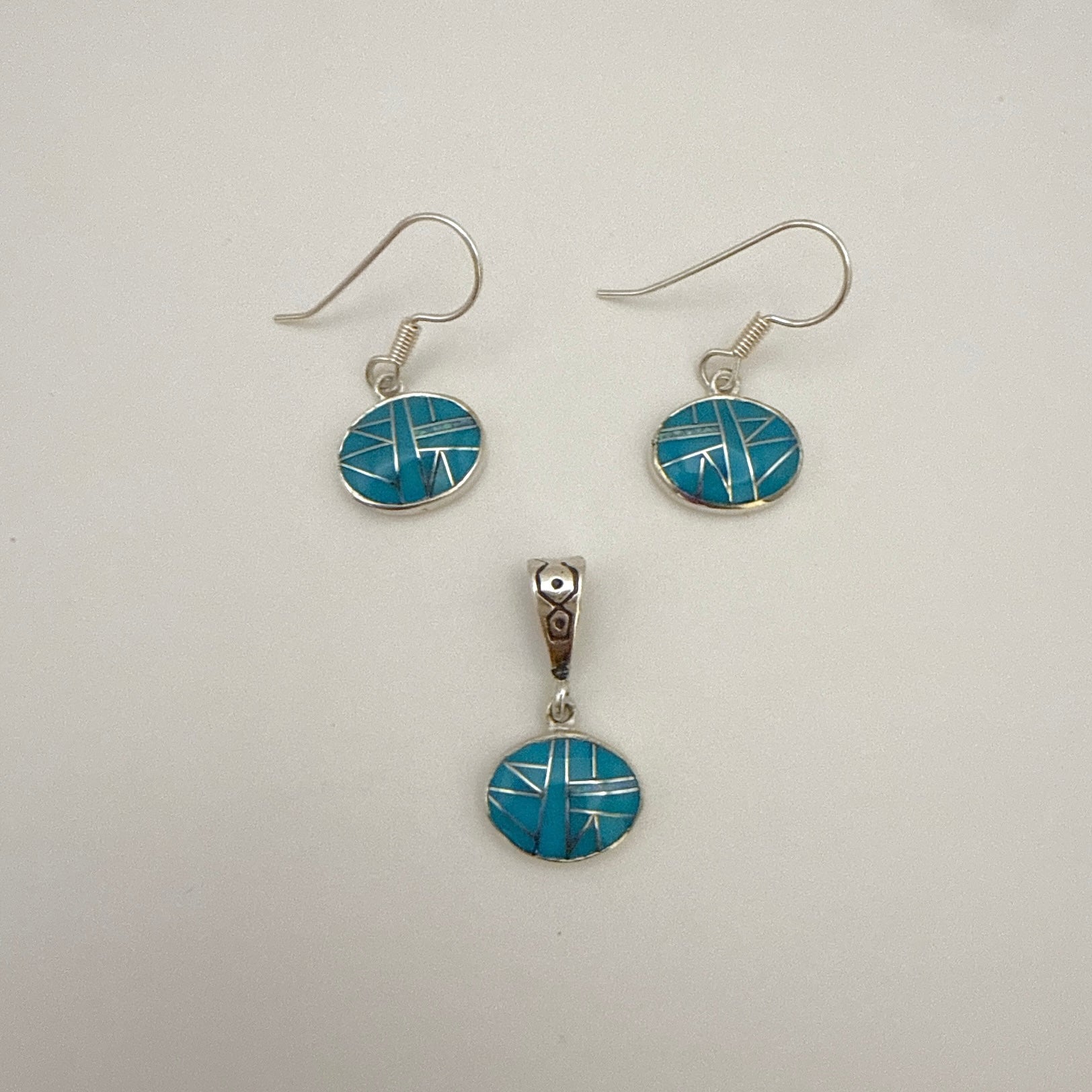 ターコイズとオパールインレイのペンダントとピアスのセットです。ナバホ族アーティスト、ブライアン・サンドバルによるハンドメイド作品で、ターコイズとオパールを組み合わせた美しいインレイが特徴です。シルバーの上に丁寧にセットされた幾何学模様が、上品で使いやすいデザインを生み出しています。普段使いにも特別な日のアクセントにも最適です。