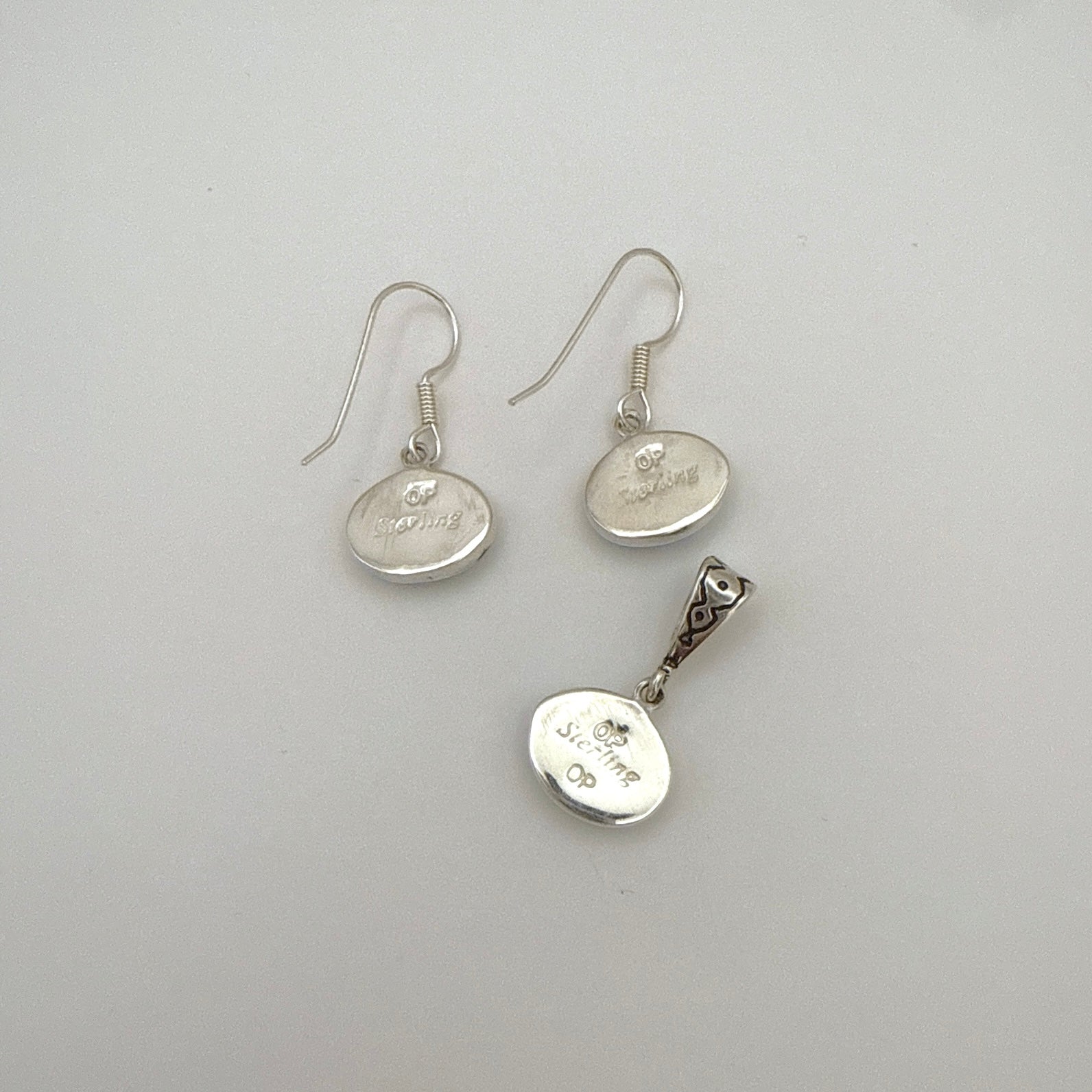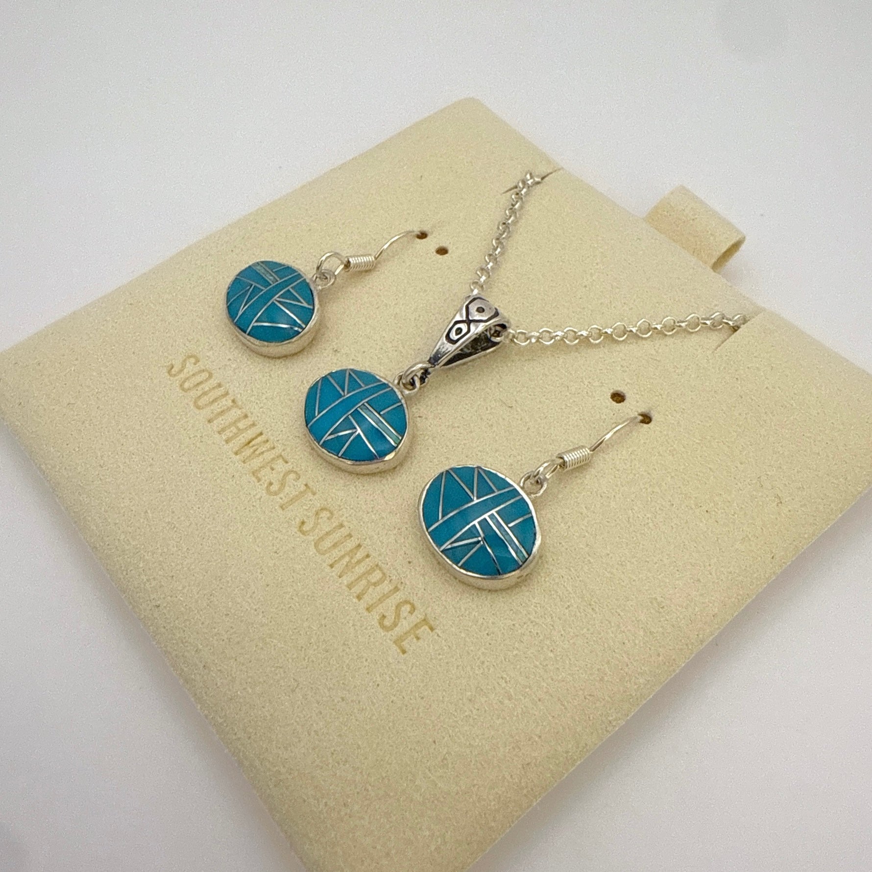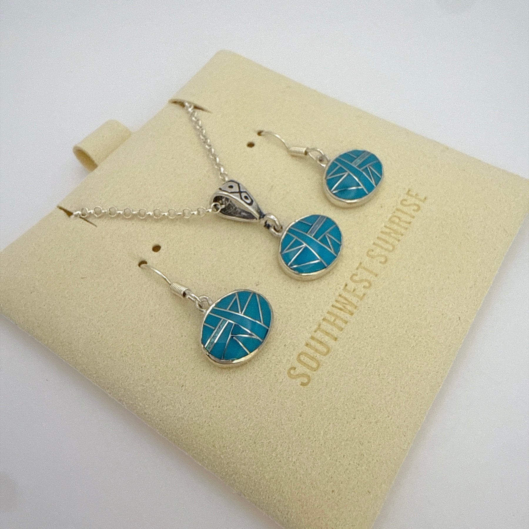 ターコイズとオパールインレイのペンダントとピアスのセットです。ナバホ族アーティスト、ブライアン・サンドバルによるハンドメイド作品で、ターコイズとオパールを組み合わせた美しいインレイが特徴です。シルバーの上に丁寧にセットされた幾何学模様が、上品で使いやすいデザインを生み出しています。普段使いにも特別な日のアクセントにも最適です。