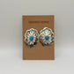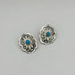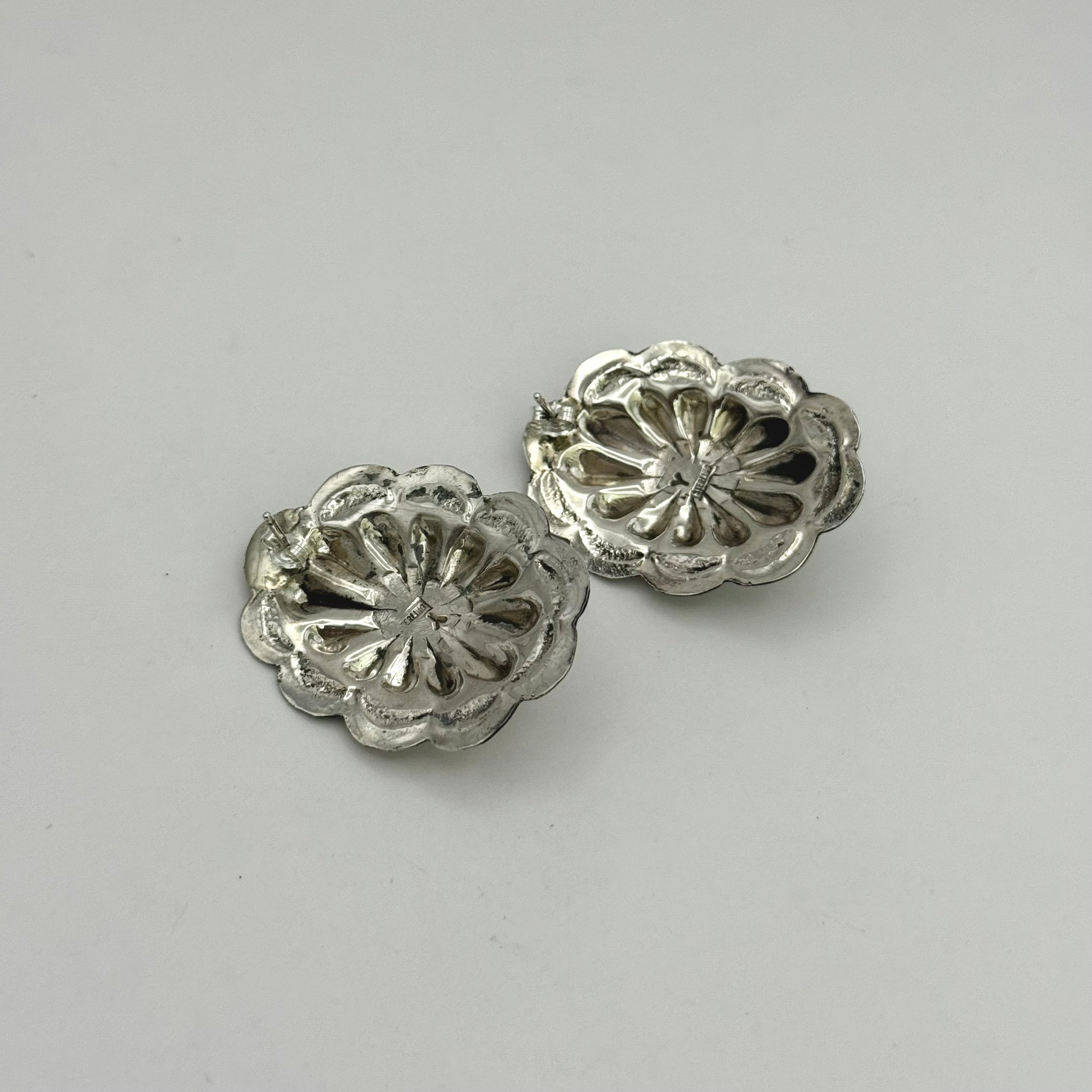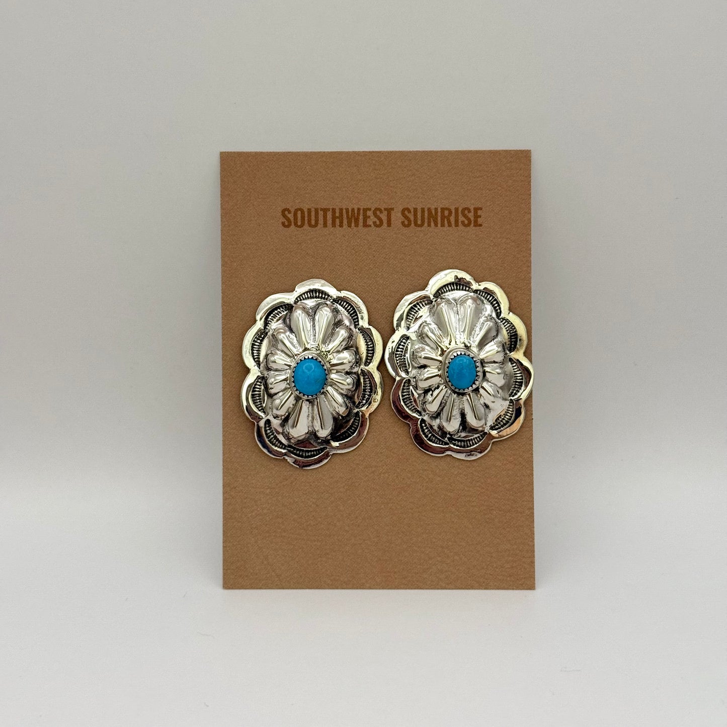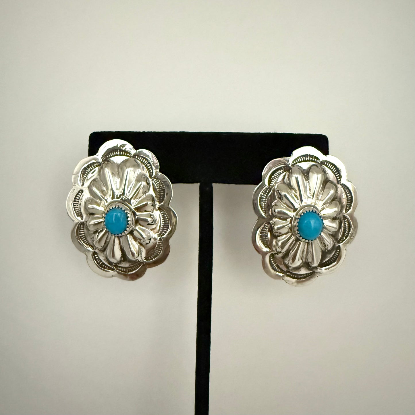 このスターリングシルバーのコンチョピアスは、ナバホ族のアーティスト、ハリー・ヤジーによるハンドメイド。鮮やかなキングマンターコイズがセットされ、スタンプ模様と美しい光沢仕上げが魅力。ポストタイプで着けやすく、サウスウエスタンスタイルを楽しめる一品です。