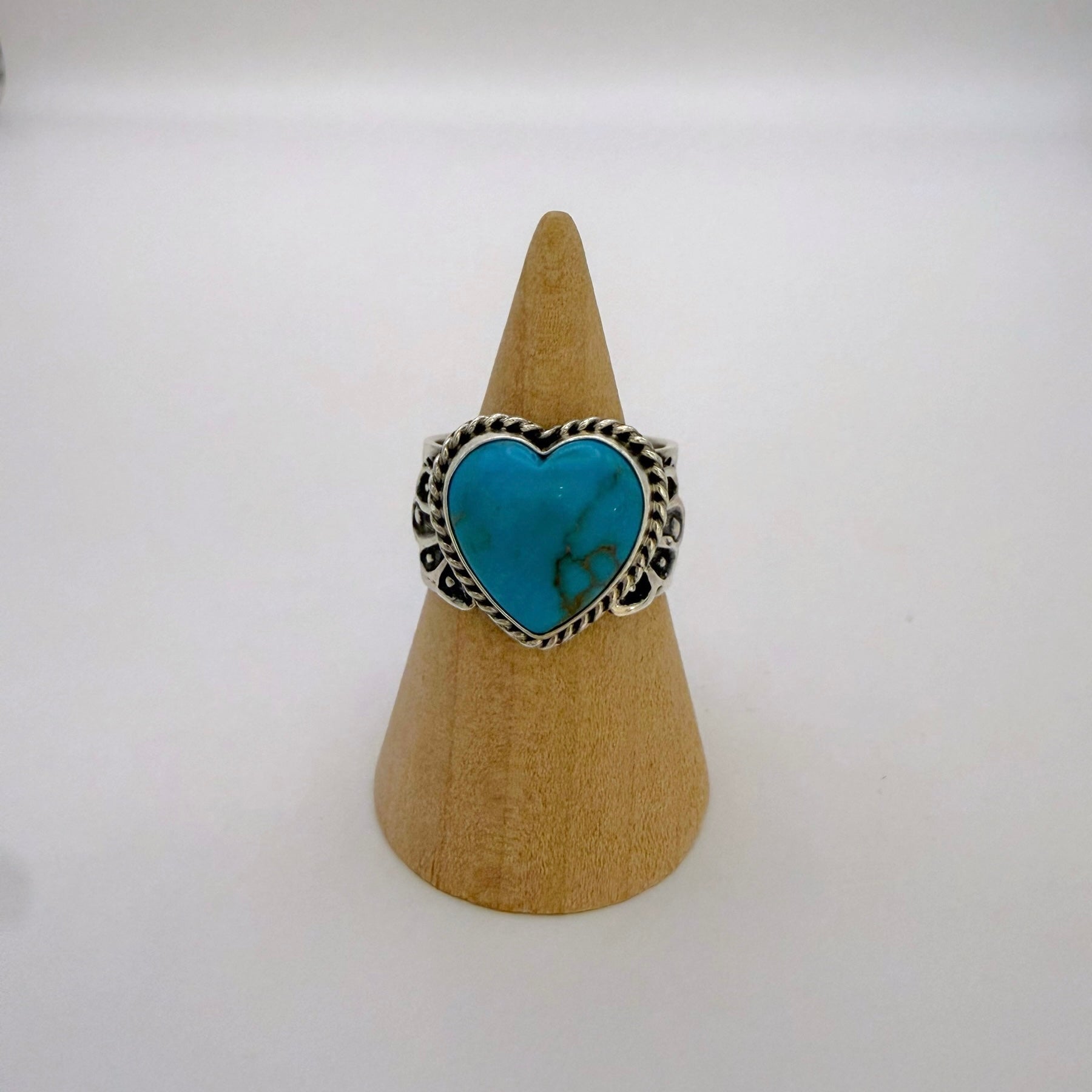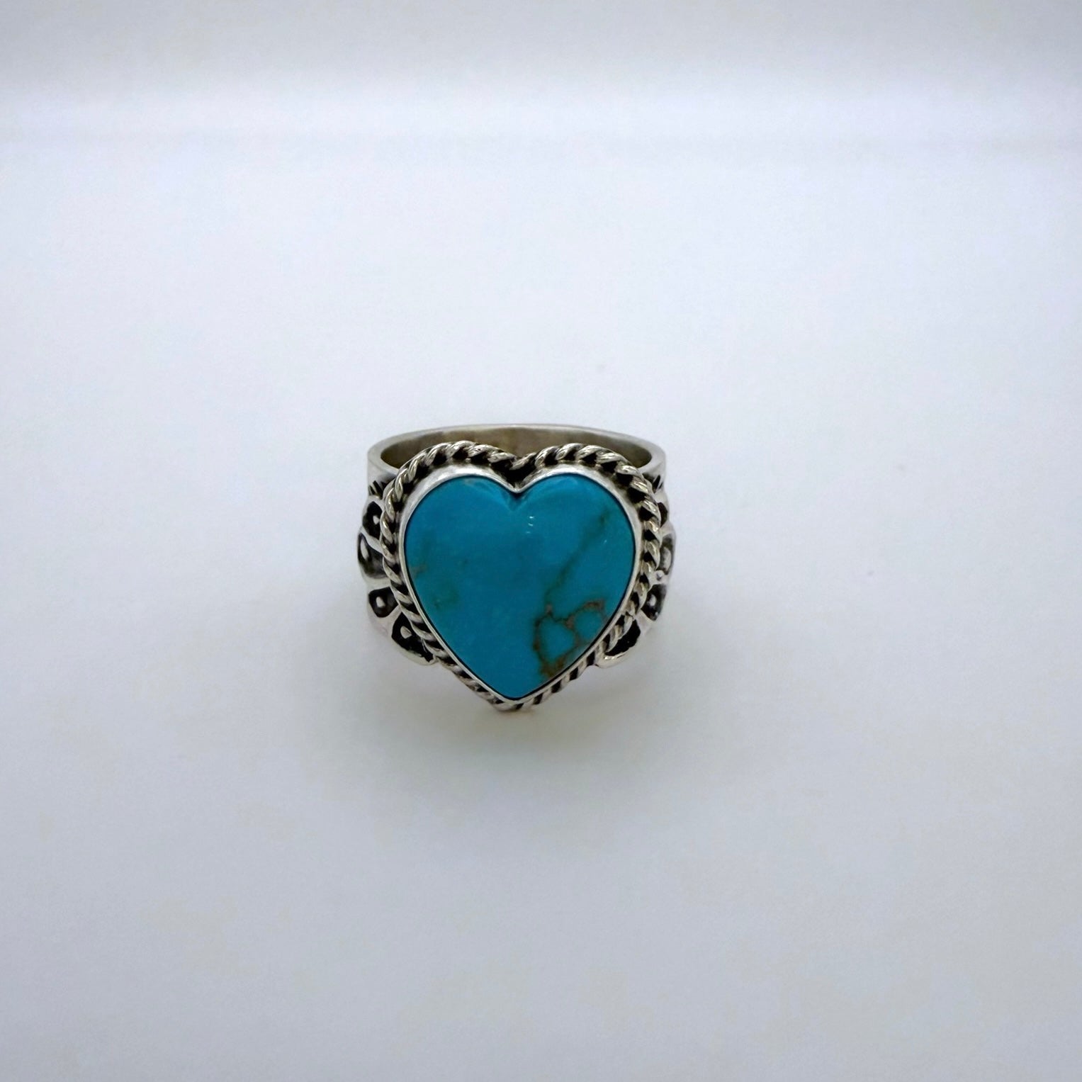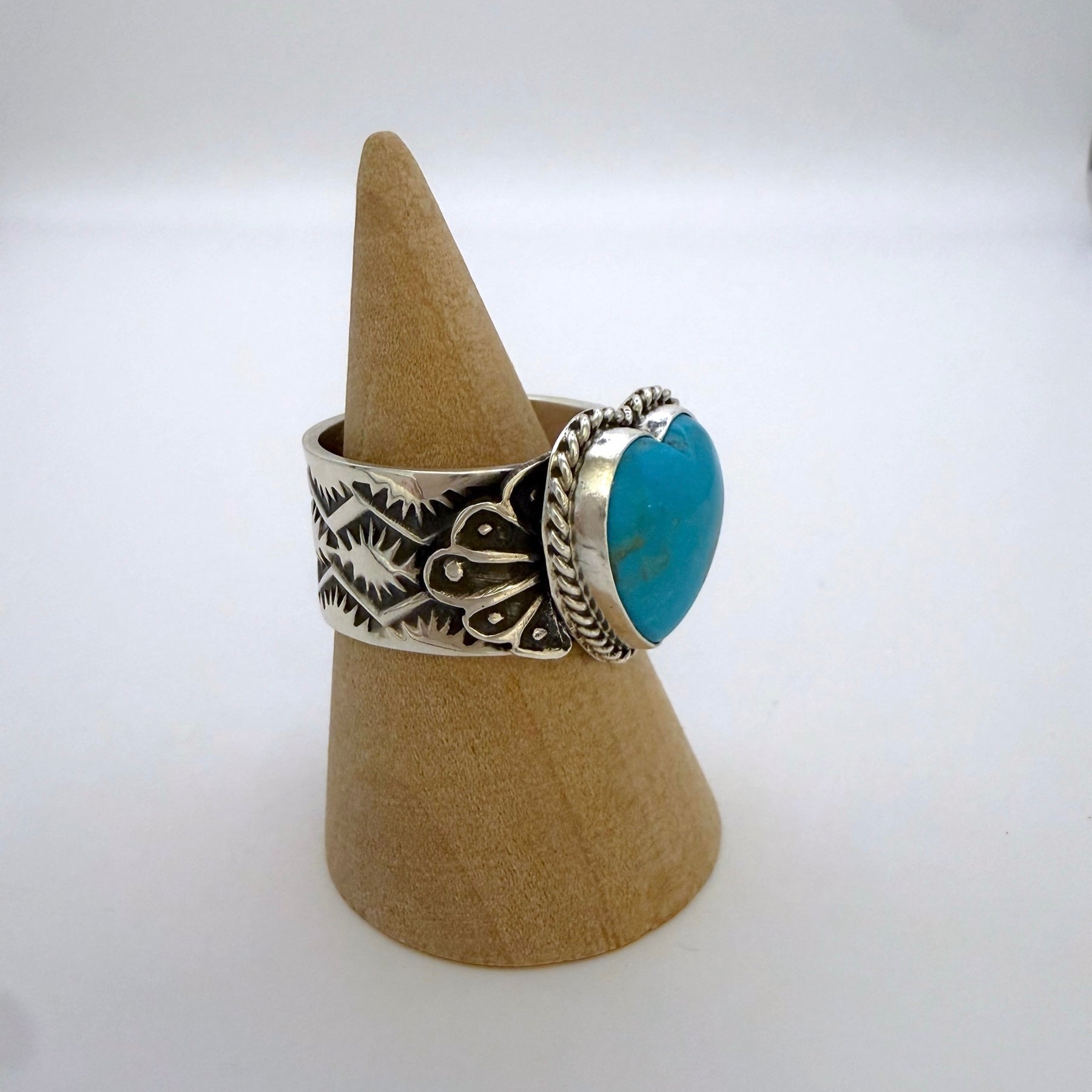 ナバホ族アーティスト サンシャイン リーブスによるハンドメイドのターコイズハートリングです。天然ターコイズを使用し、力強いシルバーデザインと細かいスタンプワークが魅力の一点です。