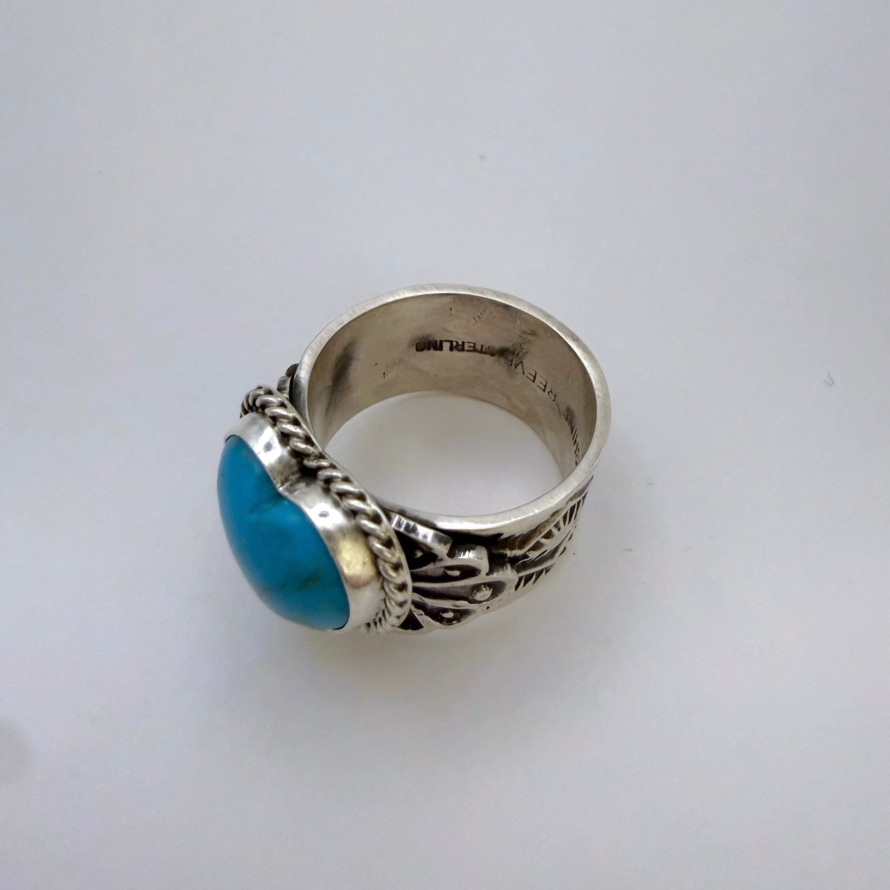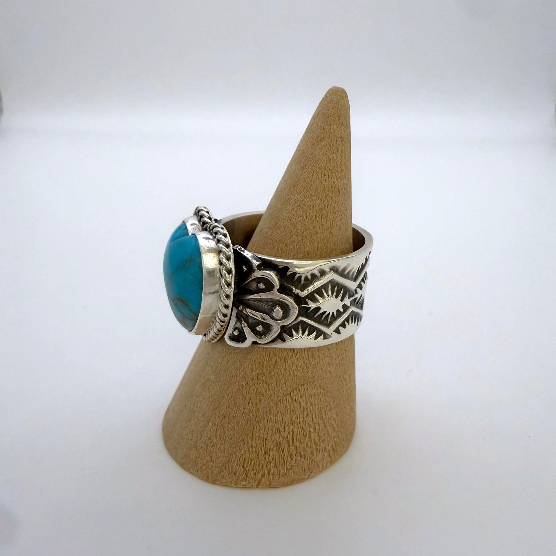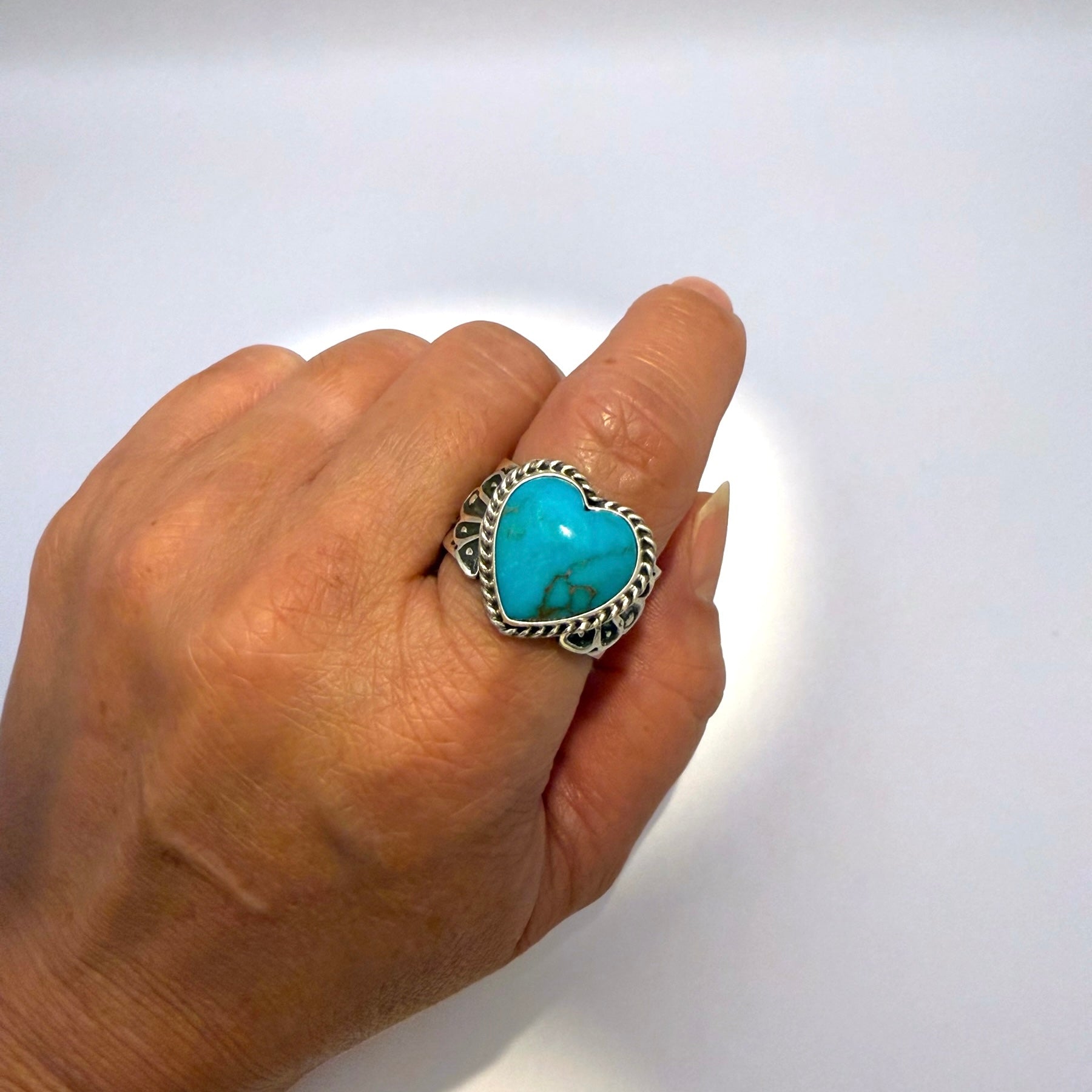 ナバホ族アーティスト サンシャイン リーブスによるハンドメイドのターコイズハートリングです。天然ターコイズを使用し、力強いシルバーデザインと細かいスタンプワークが魅力の一点です。