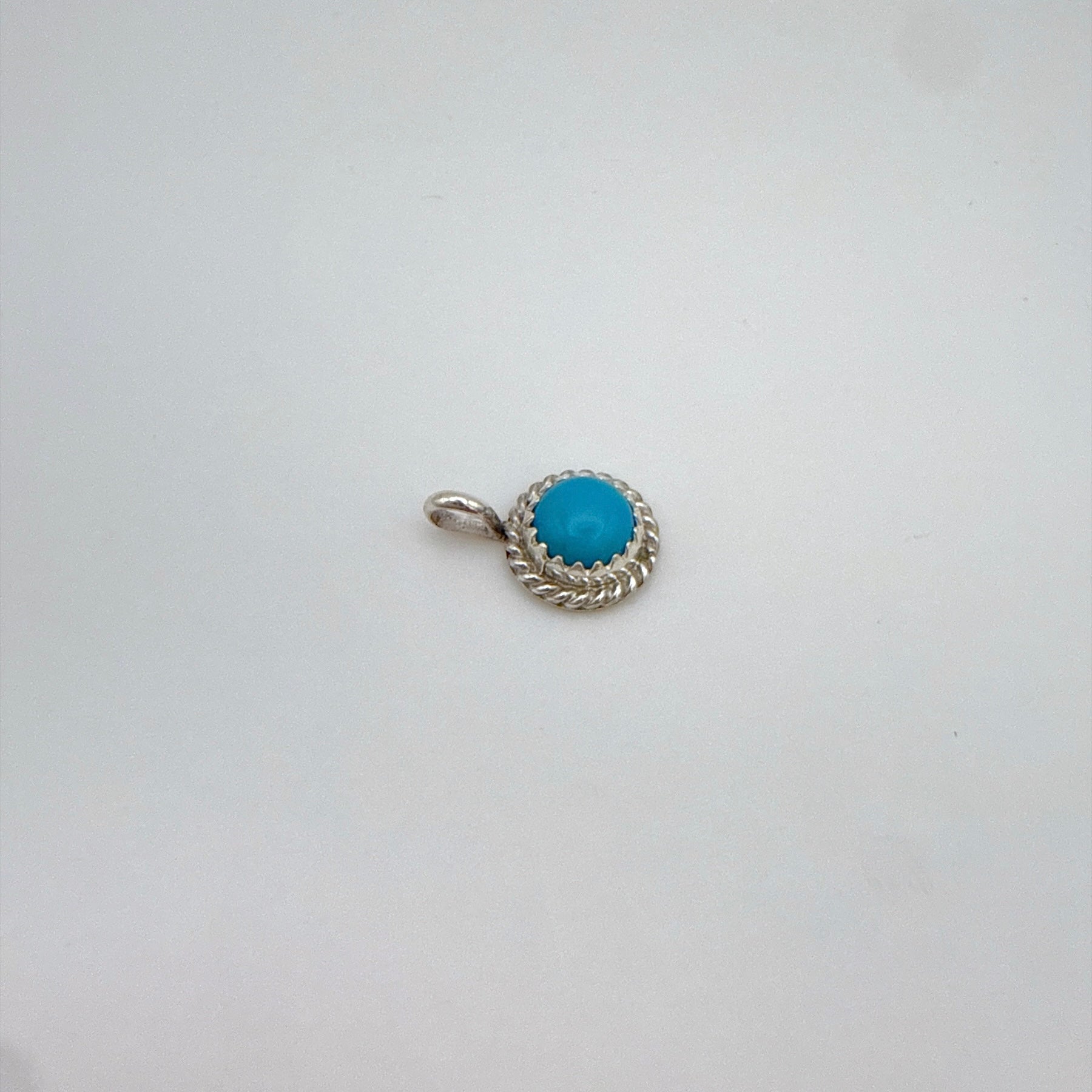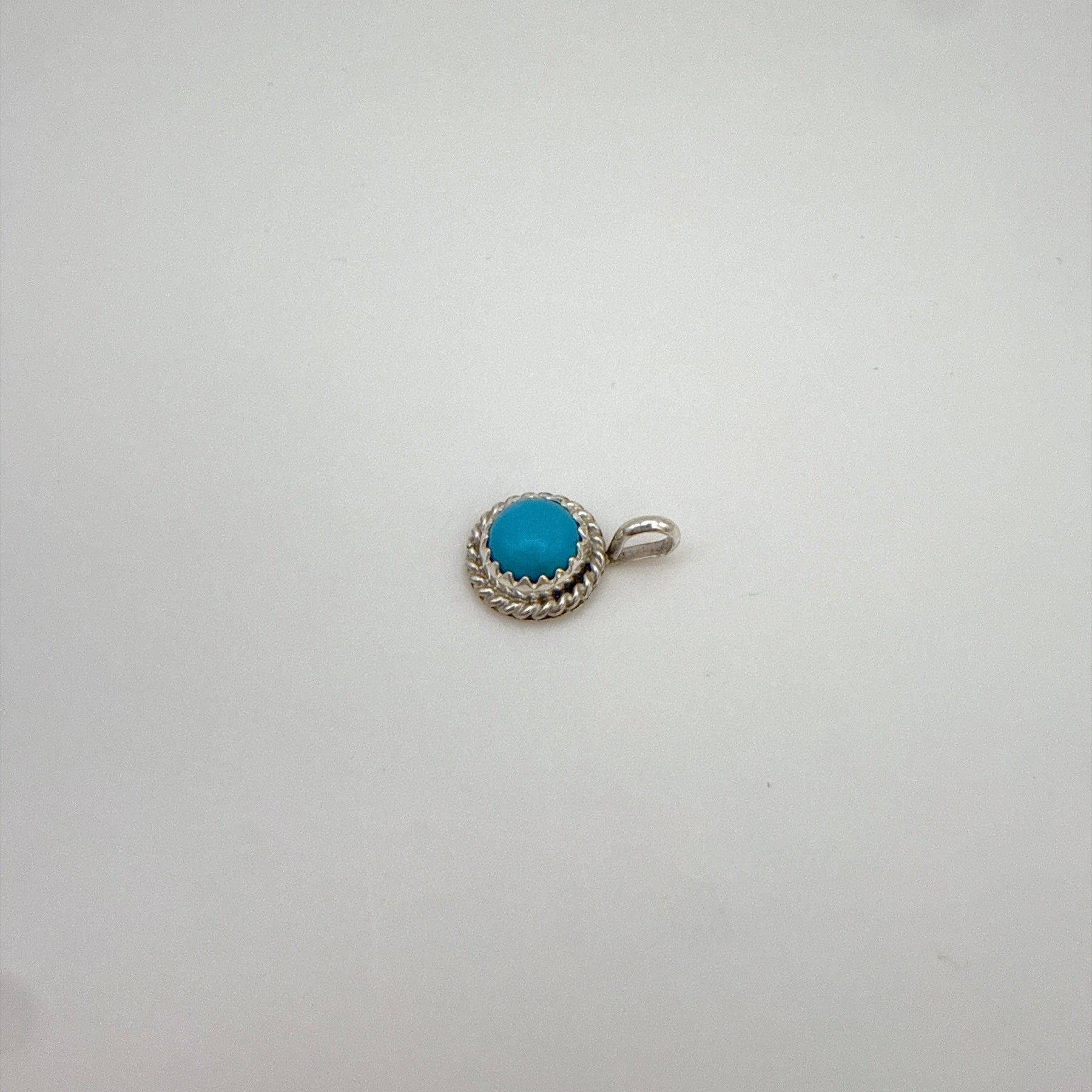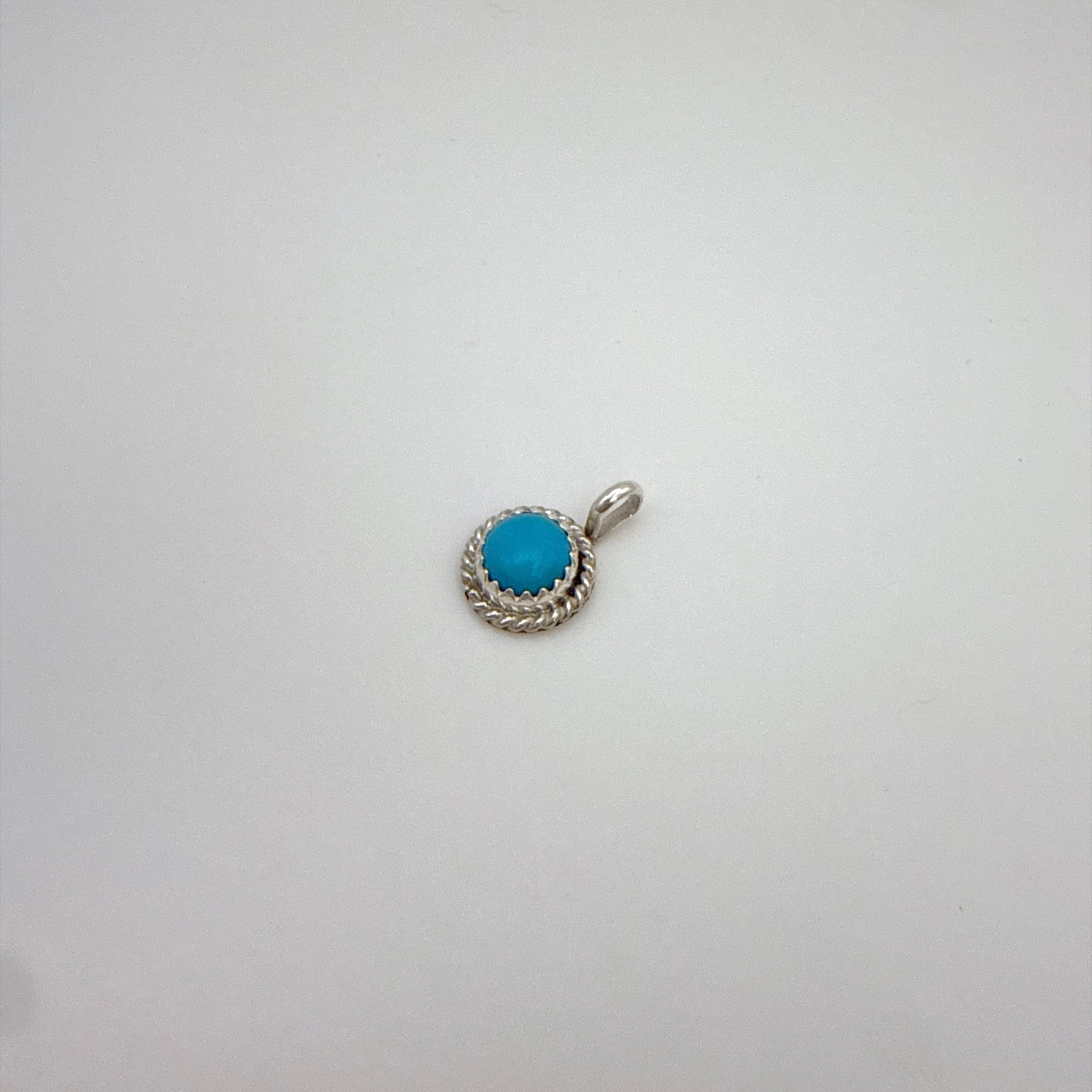 ナバホ族アーティストによるハンドメイドのターコイズペンダントです。鮮やかなキングマンターコイズをスターリングシルバーで丁寧にセットした、小ぶりで上品なデザイン。普段使いにも贈り物にも最適です。チェーンは付属しません。