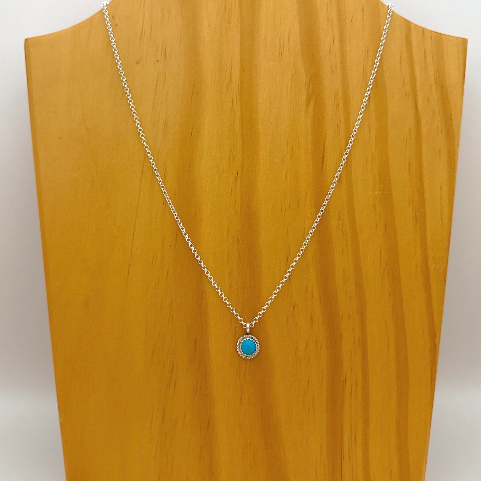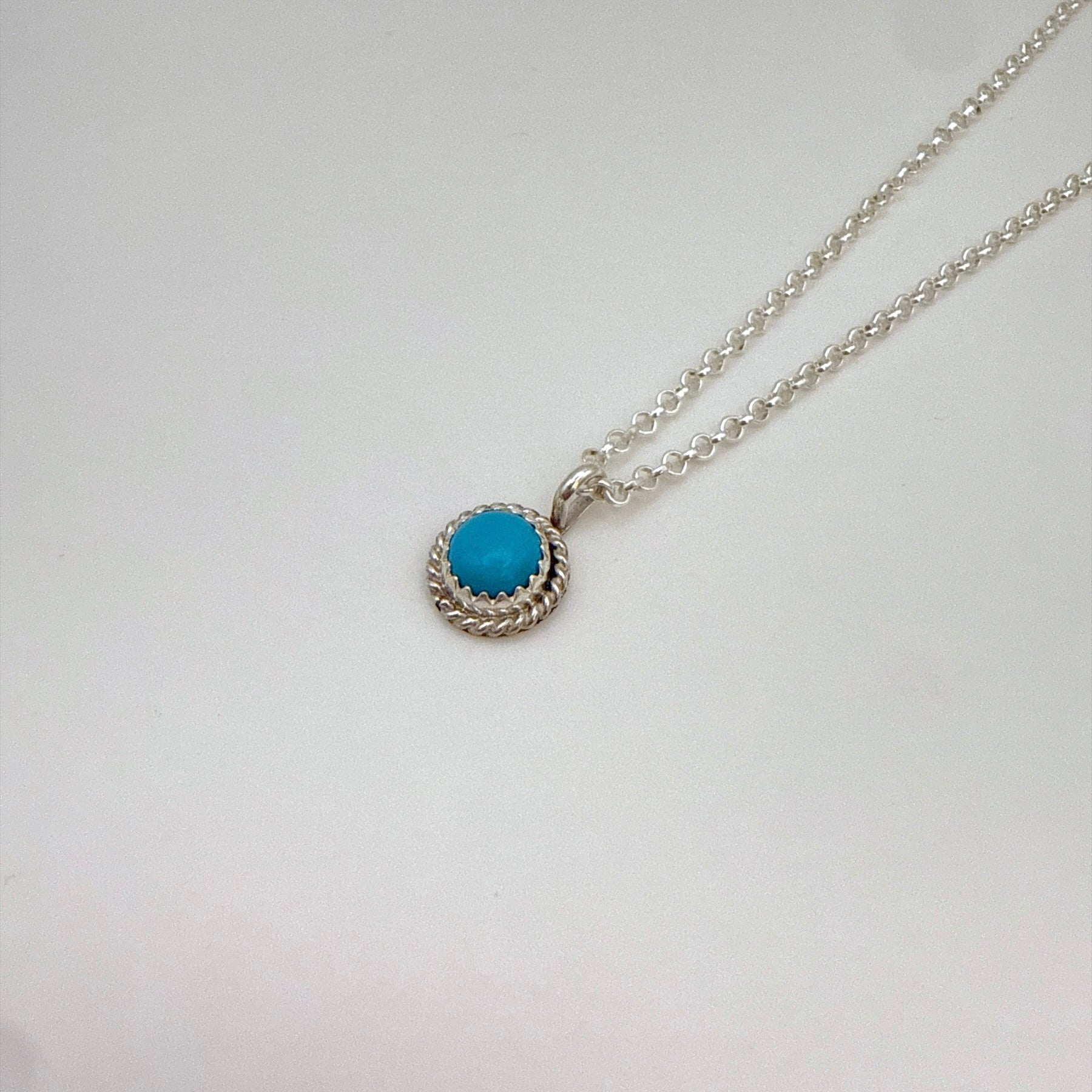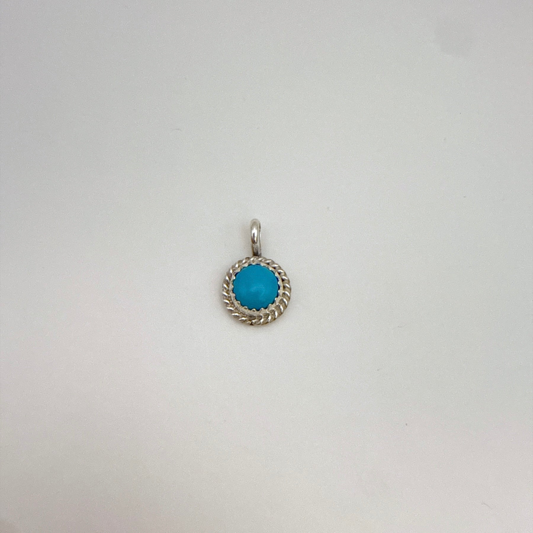 ナバホ族アーティストによるハンドメイドのターコイズペンダントです。鮮やかなキングマンターコイズをスターリングシルバーで丁寧にセットした、小ぶりで上品なデザイン。普段使いにも贈り物にも最適です。チェーンは付属しません。