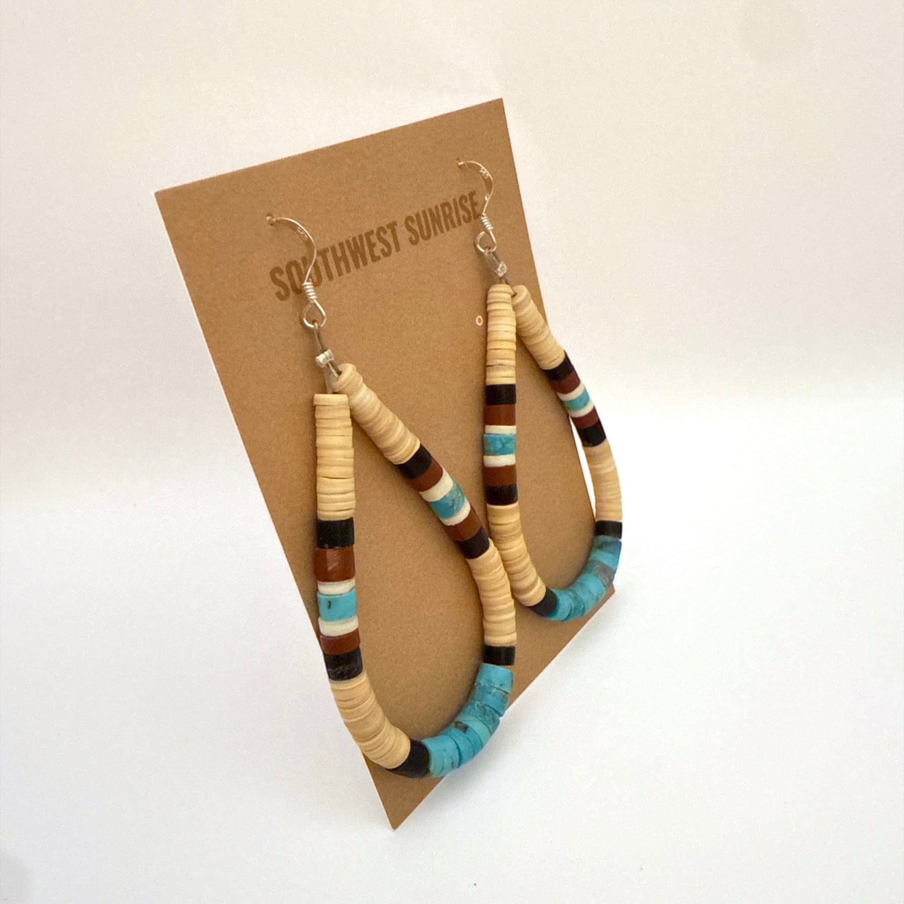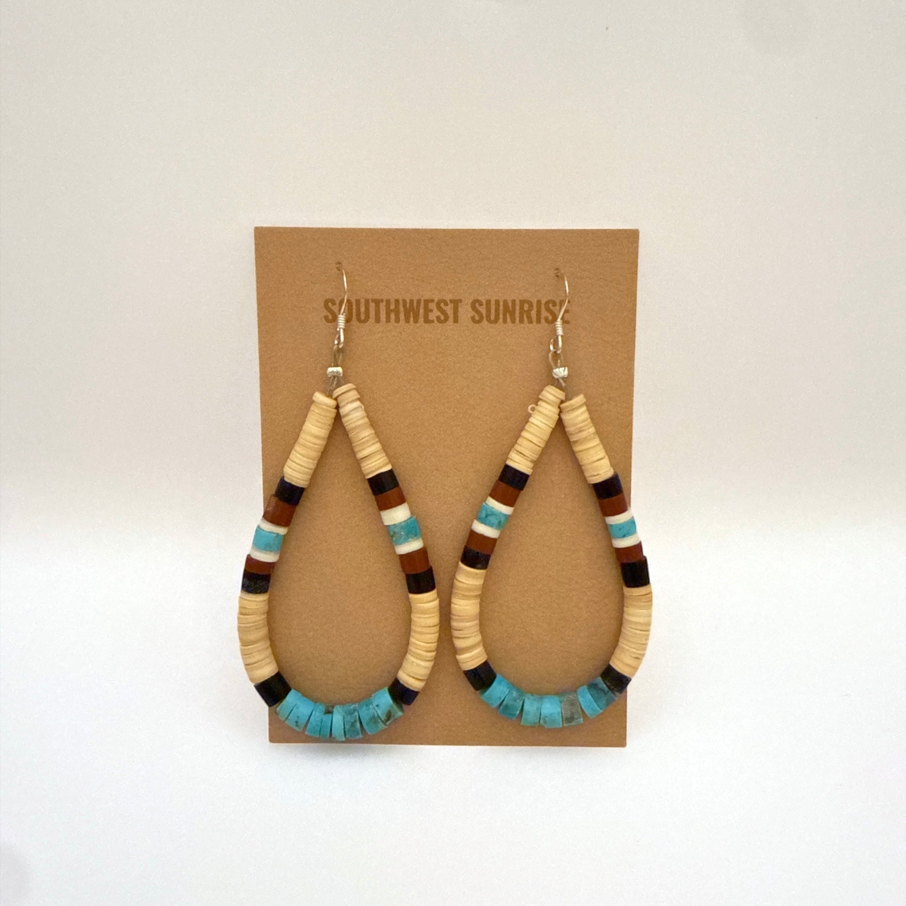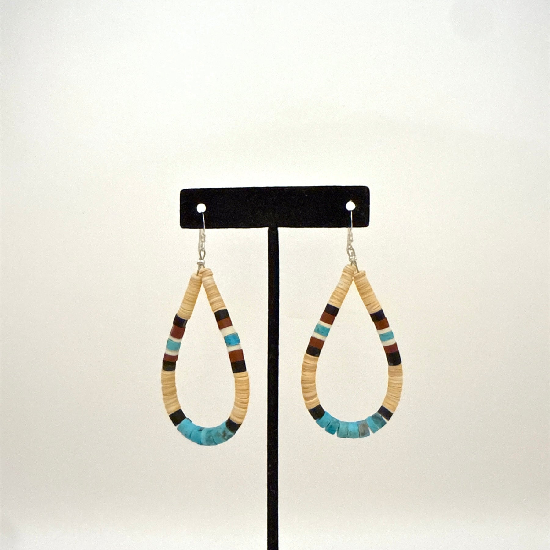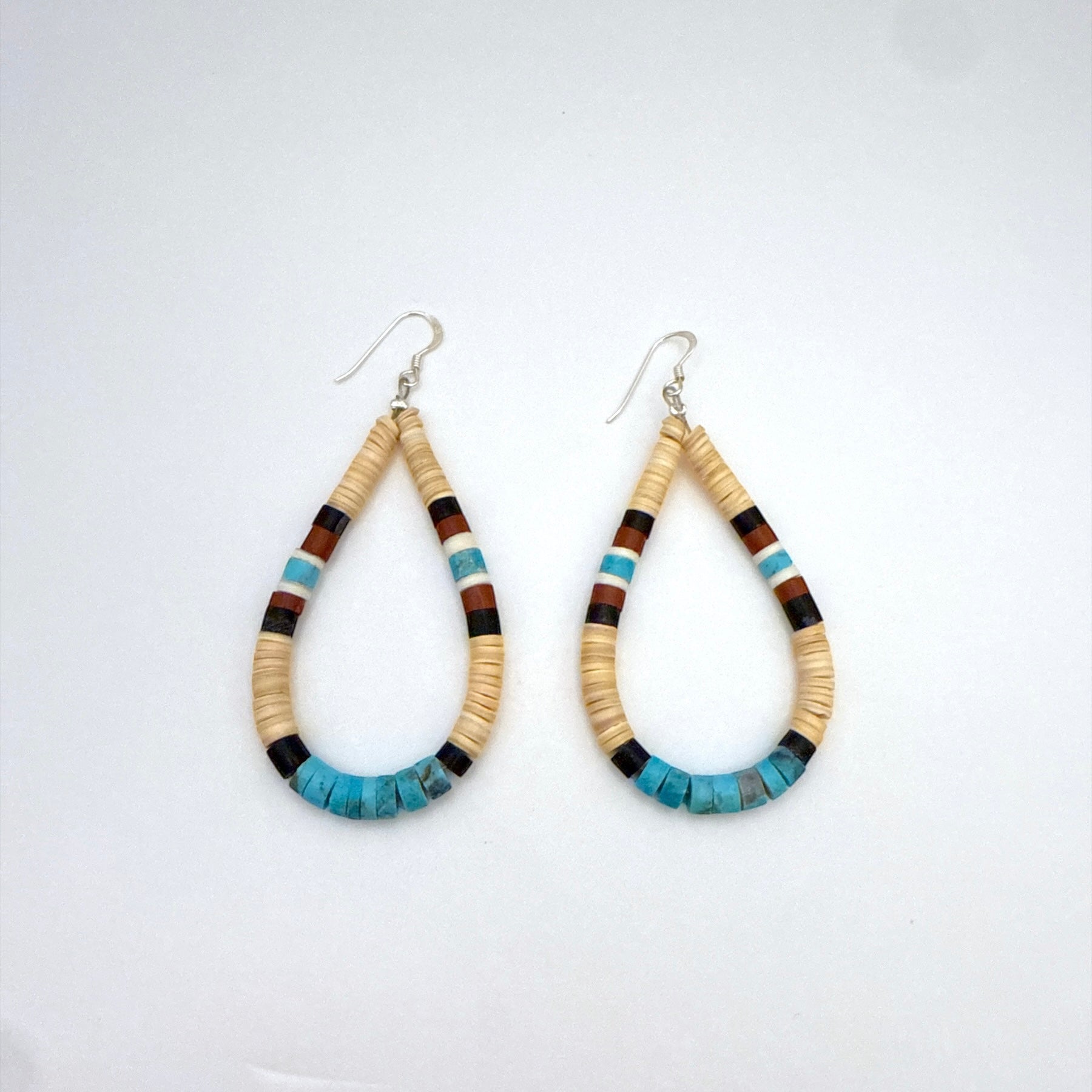 サントドミンゴ族アーティスト、Torevia Crespin によるハンドメイドのヘイシピアスです。キングマンターコイズ、シェル、ジェットビーズを使用し、美しいティアドロップ形に仕上げられています。シルバー925のフックで着け心地も快適。自然素材と伝統的技法が調和した魅力的な一点です。