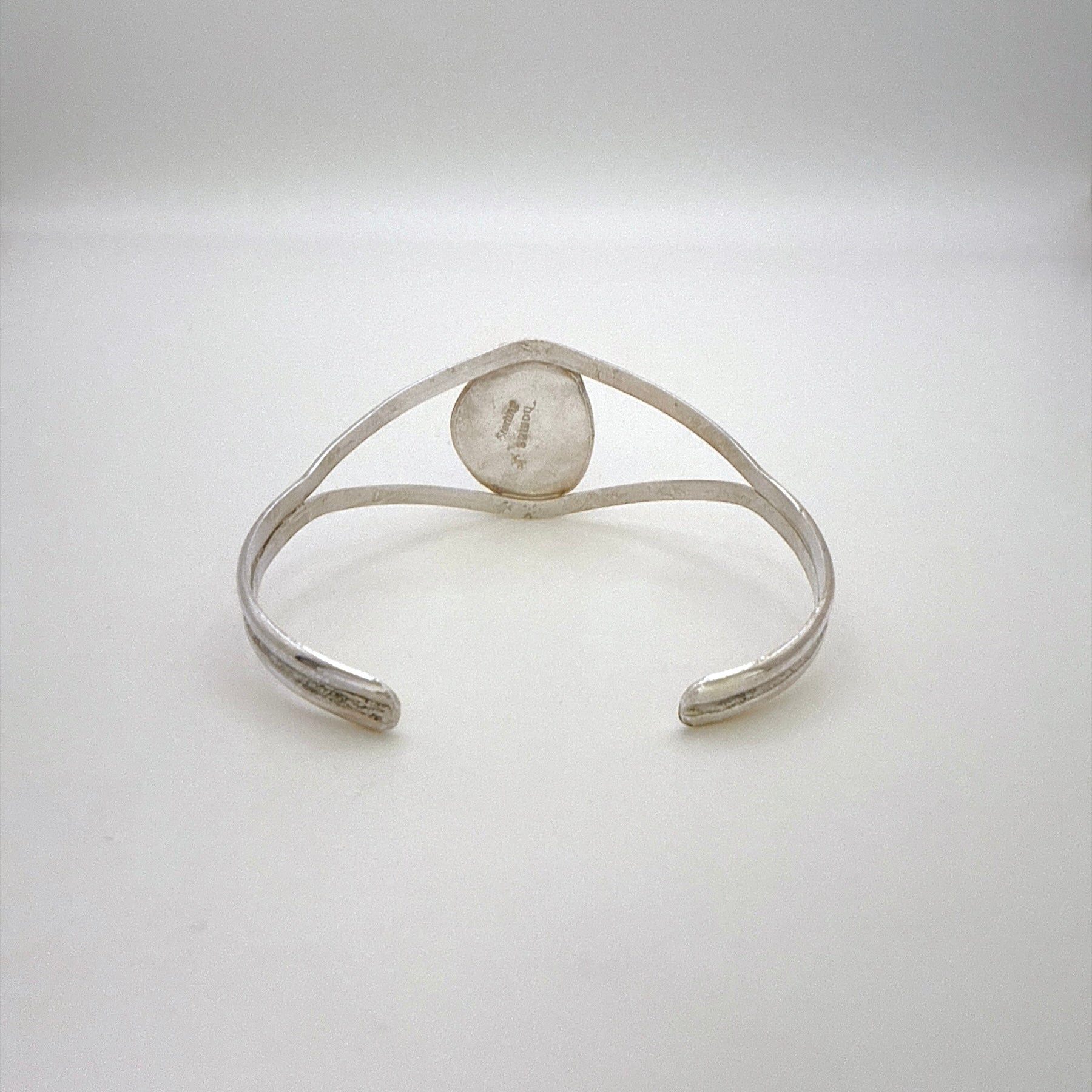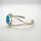This handcrafted sterling silver cuff bracelet showcases a vivid Cerrillos turquoise stone. Made by Navajo artist Mike Thomas Jr, its clean and elegant design brings out the timeless charm of Southwestern artistry. Slightly adjustable, it is ideal for medium wrist sizes and perfect for everyday wear or layering with other pieces.