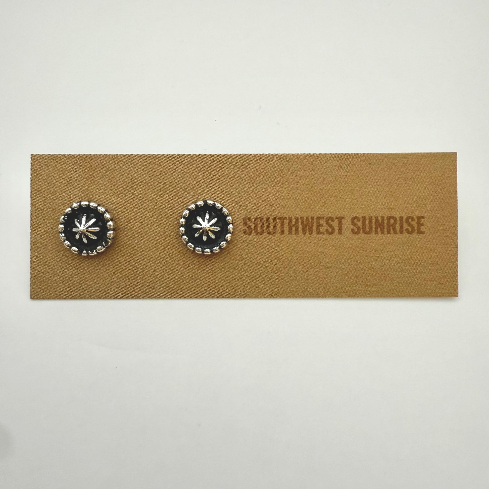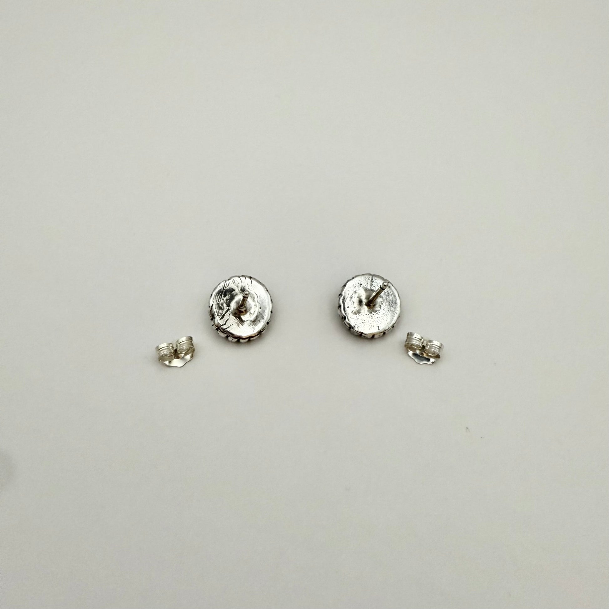 These sterling silver concho stud earrings are beautifully handcrafted by Navajo artist Louise Joe. Featuring a detailed stamped design and classic concho style, these small yet striking studs bring authentic southwestern charm to any look.