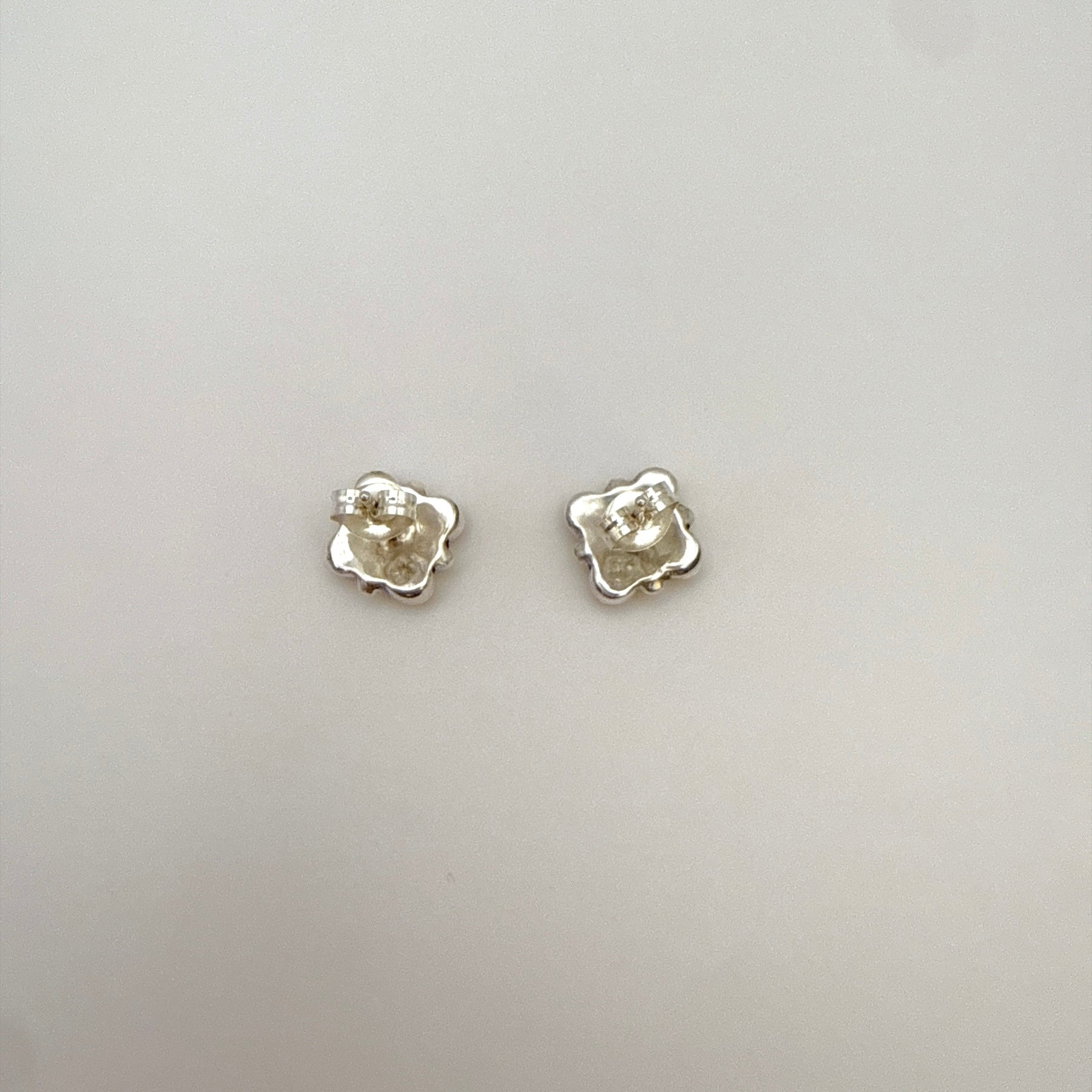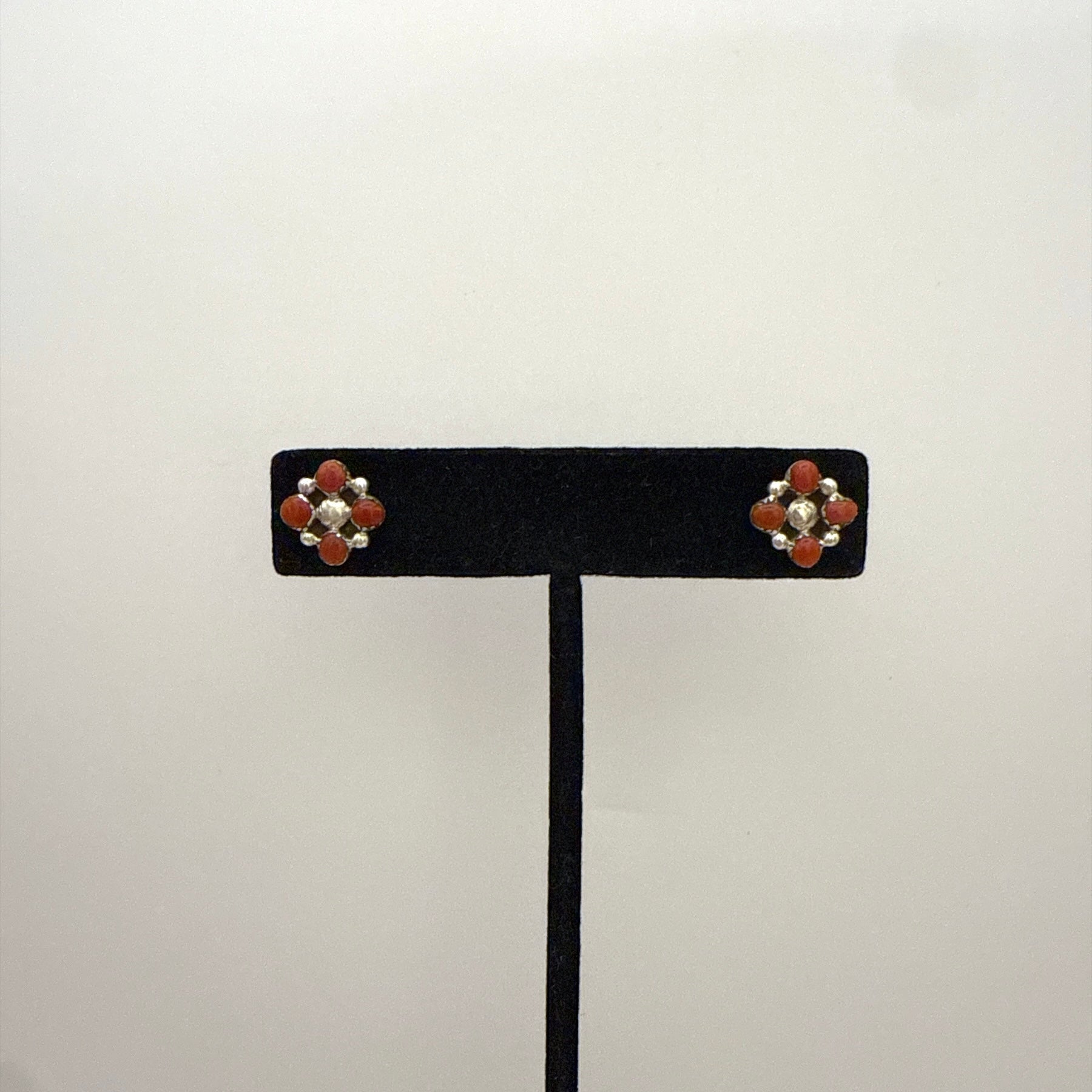 Sterling silver stud earrings set with four natural coral stones. Handmade by Zuni artist Maxine Malani, these petite studs bring a warm Southwestern touch to any look. Lightweight and perfect for everyday wear with secure post backs.