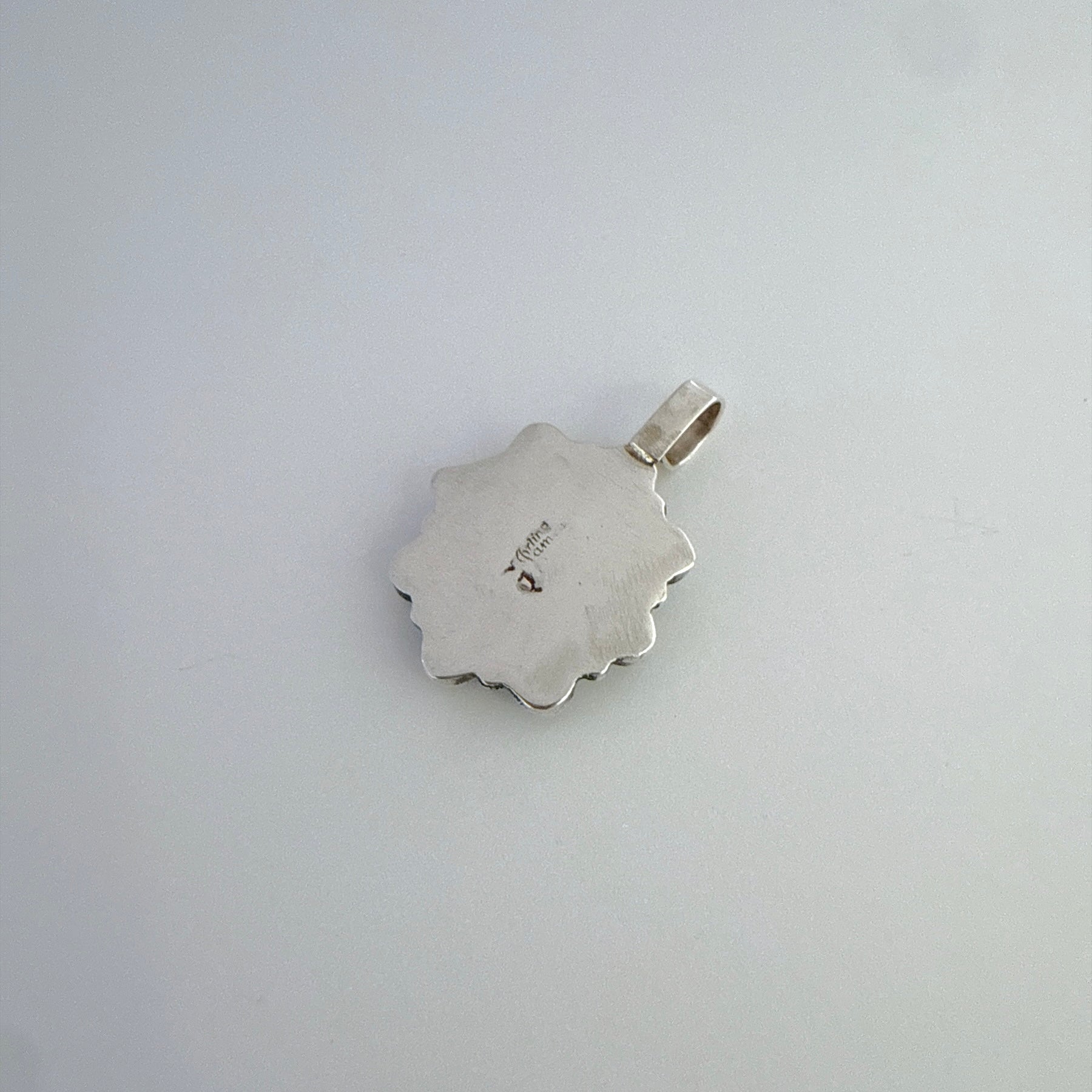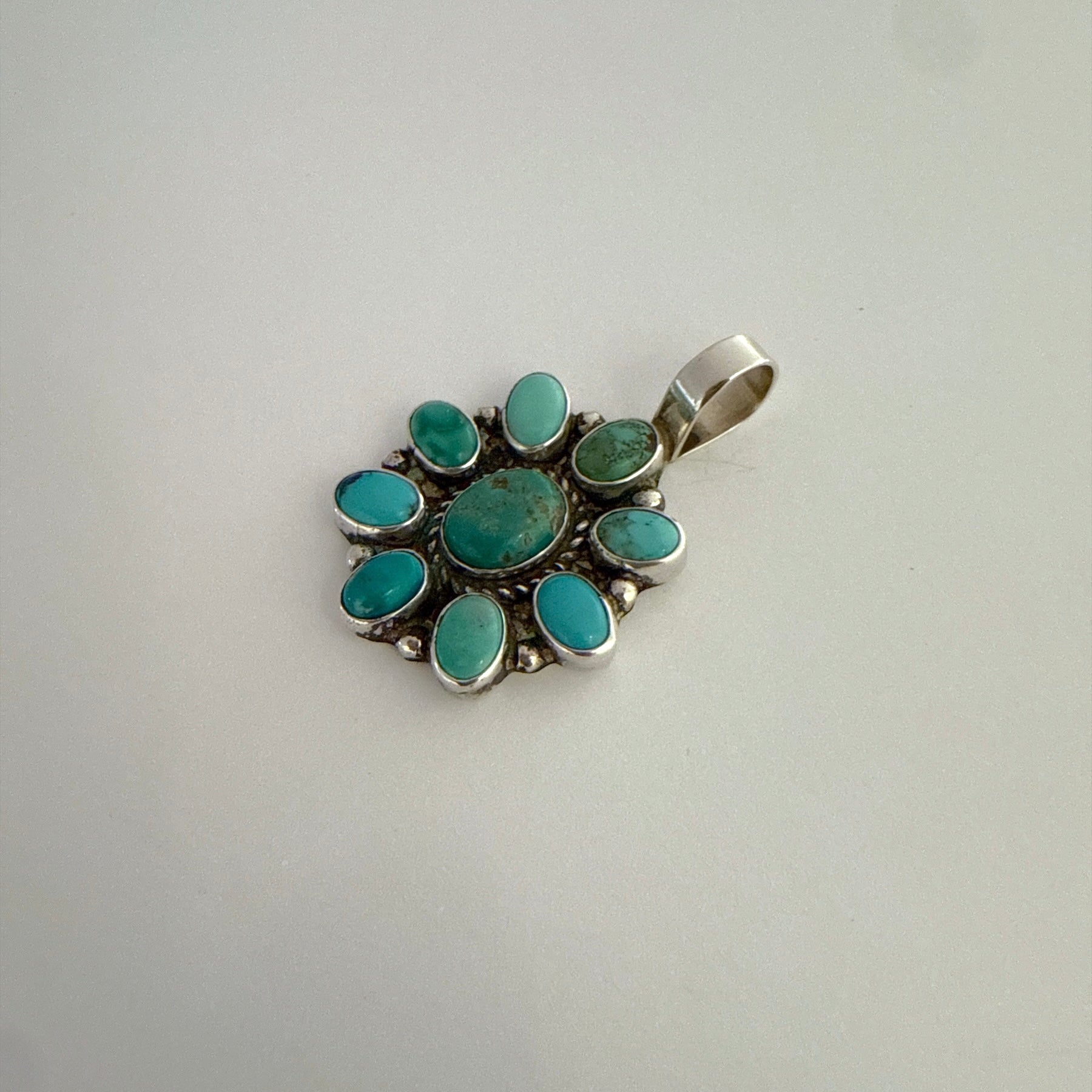 This sterling silver cluster pendant features a beautiful arrangement of natural Kingman turquoise in a blend of light blue and soft green tones. Handcrafted by Navajo silversmith Geraldine James, each stone is individually set to create a classic Southwestern floral cluster design. Its versatile size makes it easy to pair with your favorite chain for everyday wear or special occasions. A timeless piece that brings authentic Navajo artistry to any jewelry collection.