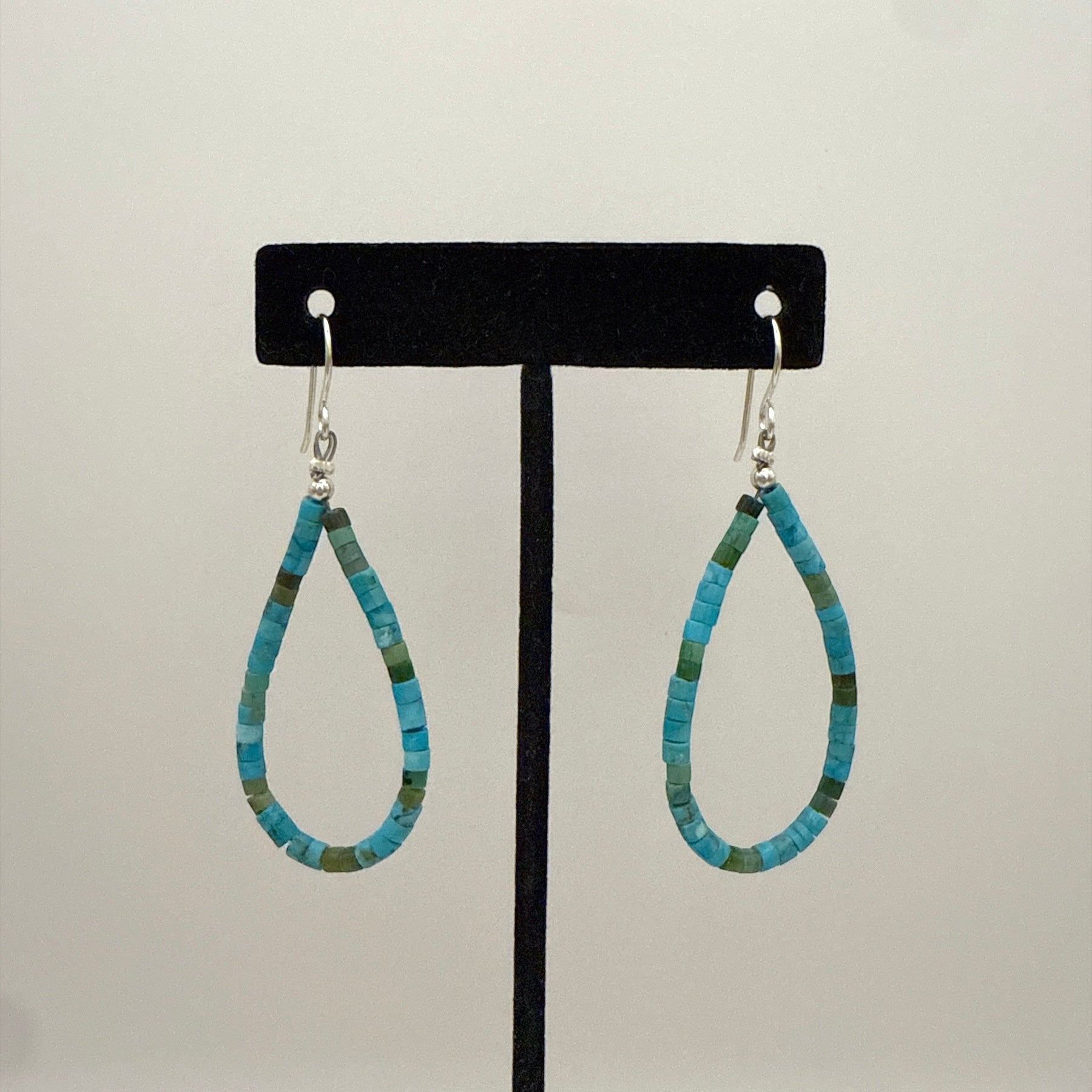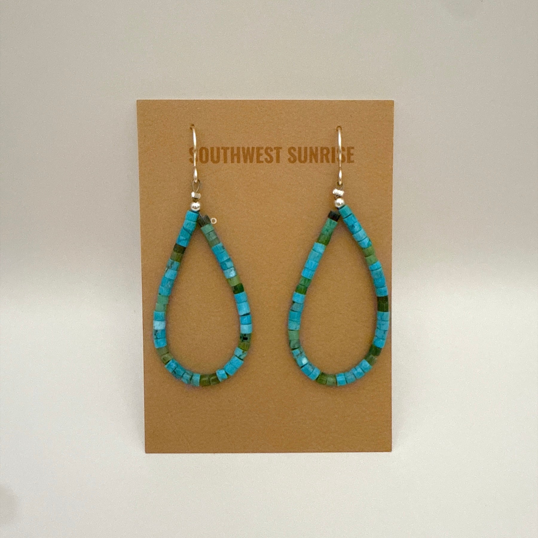 Showcasing the beautiful blue and green tones of Kingman turquoise, these handcrafted heishi earrings feature hand strung turquoise beads with sterling silver hooks. Their lightweight teardrop design offers a classic Southwestern look, making them perfect for everyday wear or special occasions.