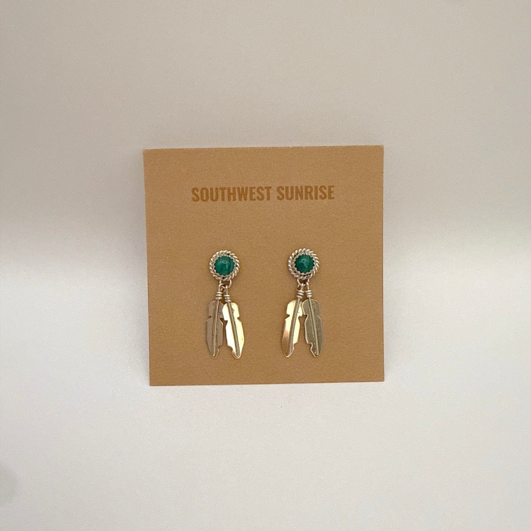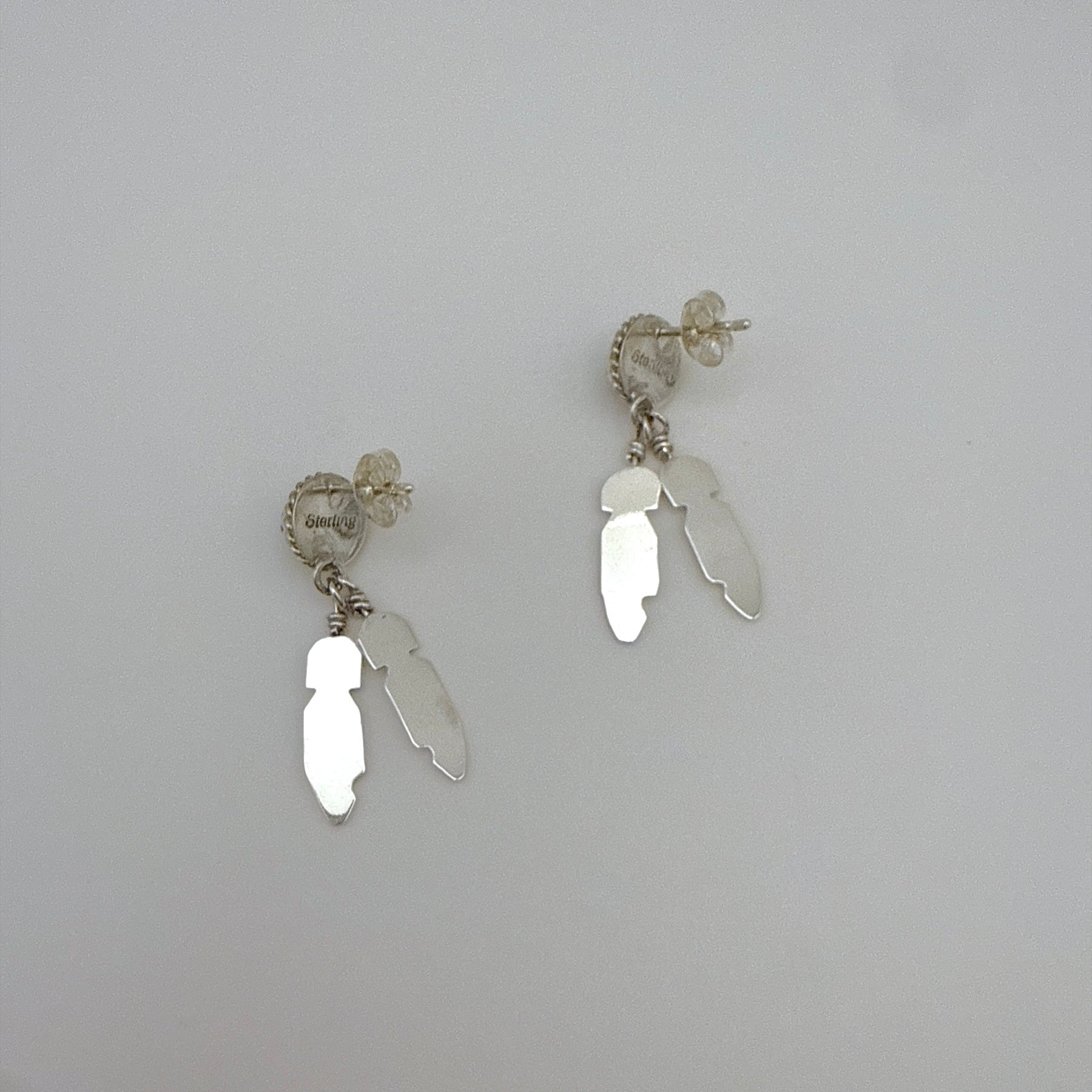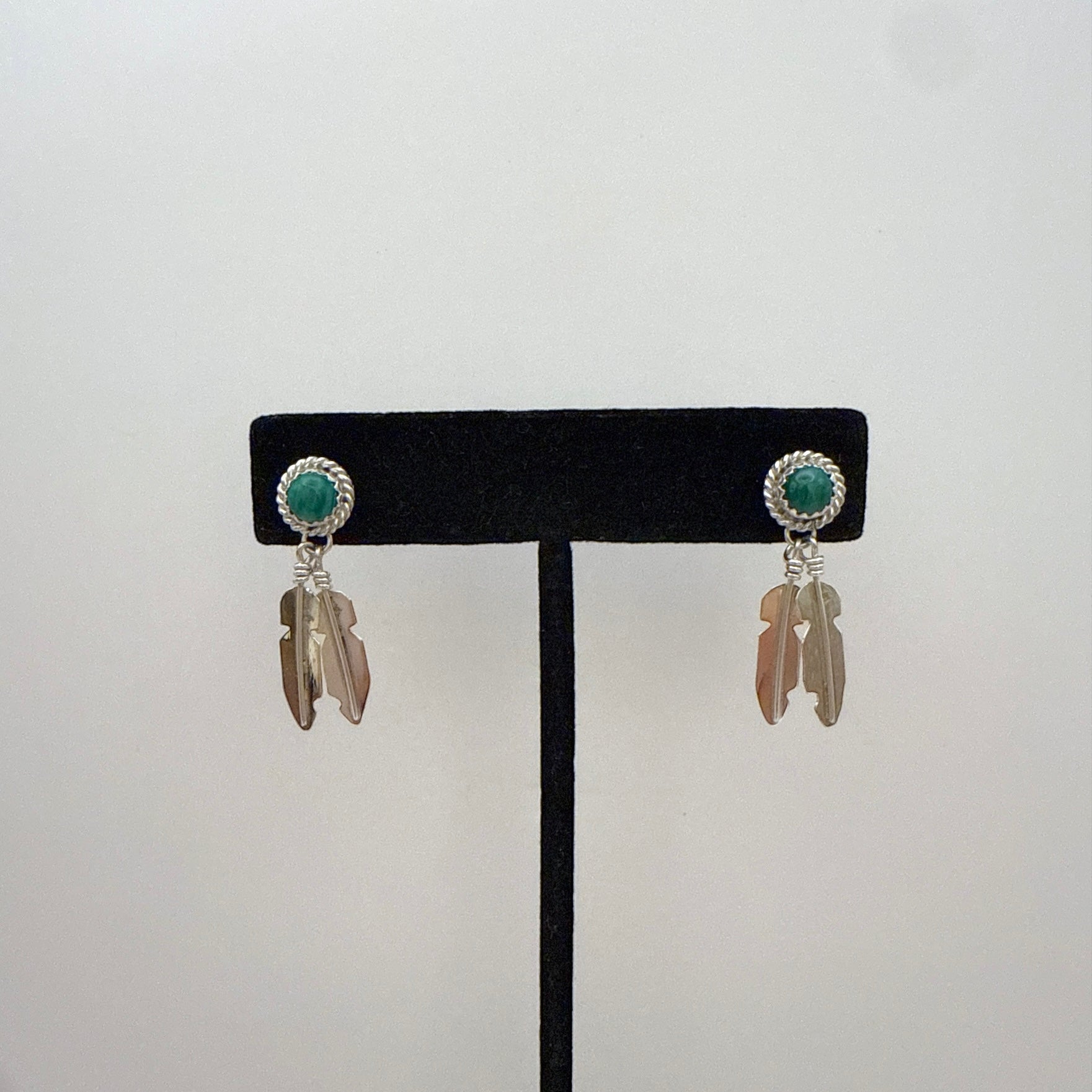 These sterling silver feather earrings are set with genuine malachite and handcrafted by Navajo artist Theresa Kinsel. The two feather pieces dangle gently for added movement, while the secure post back closure ensures comfortable all day wear. A beautiful blend of traditional craftsmanship and Southwestern charm, perfect for any occasion.