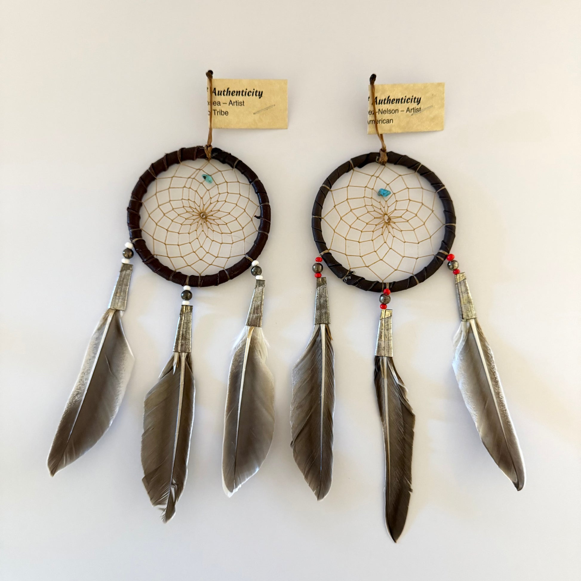 Each piece is handmade by a Navajo artist and comes with a Certificate of Authenticity. The design includes natural feathers, beads, and a touch of turquoise stone, making every dreamcatcher one-of-a-kind.