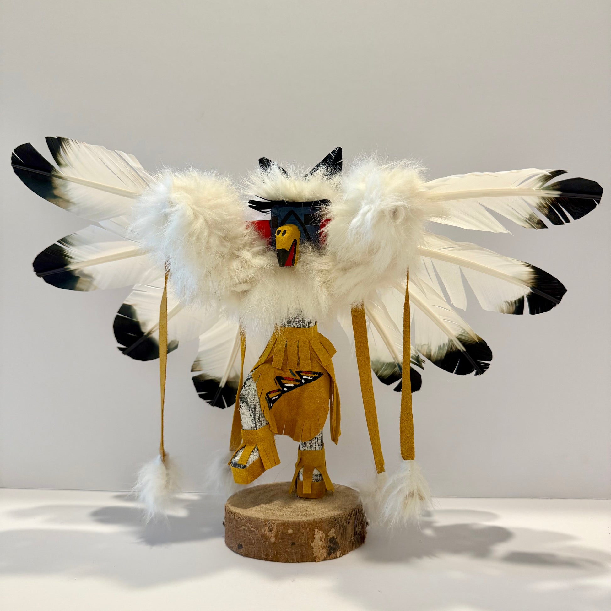 Enhance your collection with this handcrafted Navajo Eagle Kachina Doll. Revered as the ruler of the skies, the Eagle Kachina is a sacred symbol of strength, power, and divine connection. Traditionally seen as a spiritual messenger to the great spirits, this doll serves as a powerful protector in Native American cultural ceremonies.