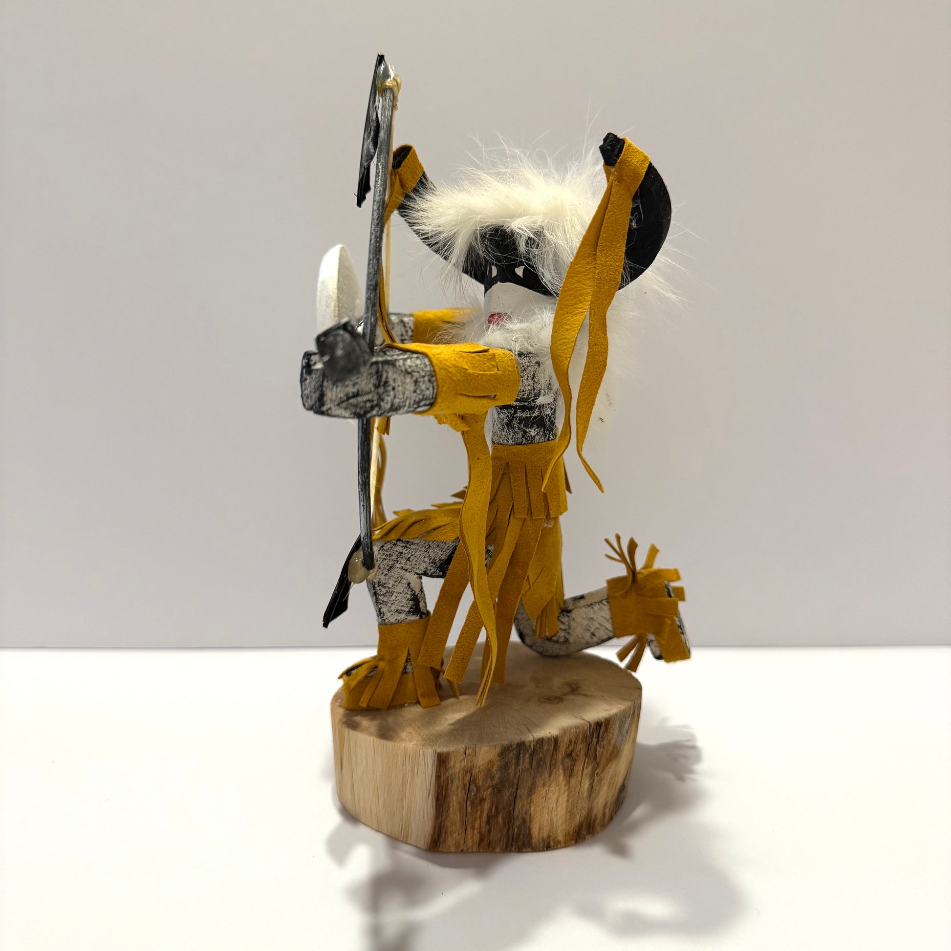 Celebrate strength and perseverance with this handcrafted Navajo Kneeling Buffalo Warrior Kachina Doll. The Buffalo Warrior is not a ceremonial dancer but a figure of duty—tasked with ensuring a sufficient food supply for the harsh winter months.