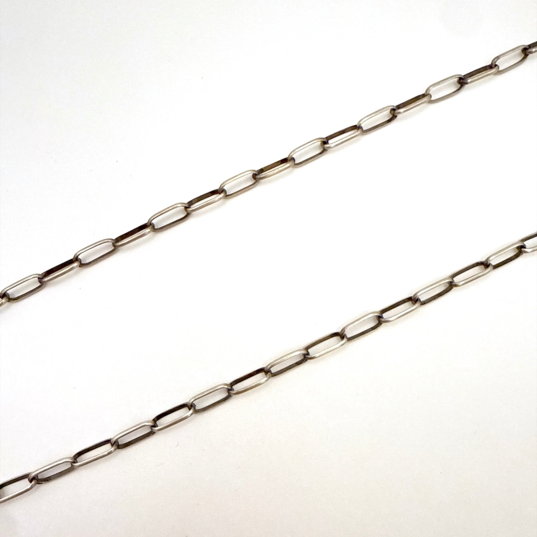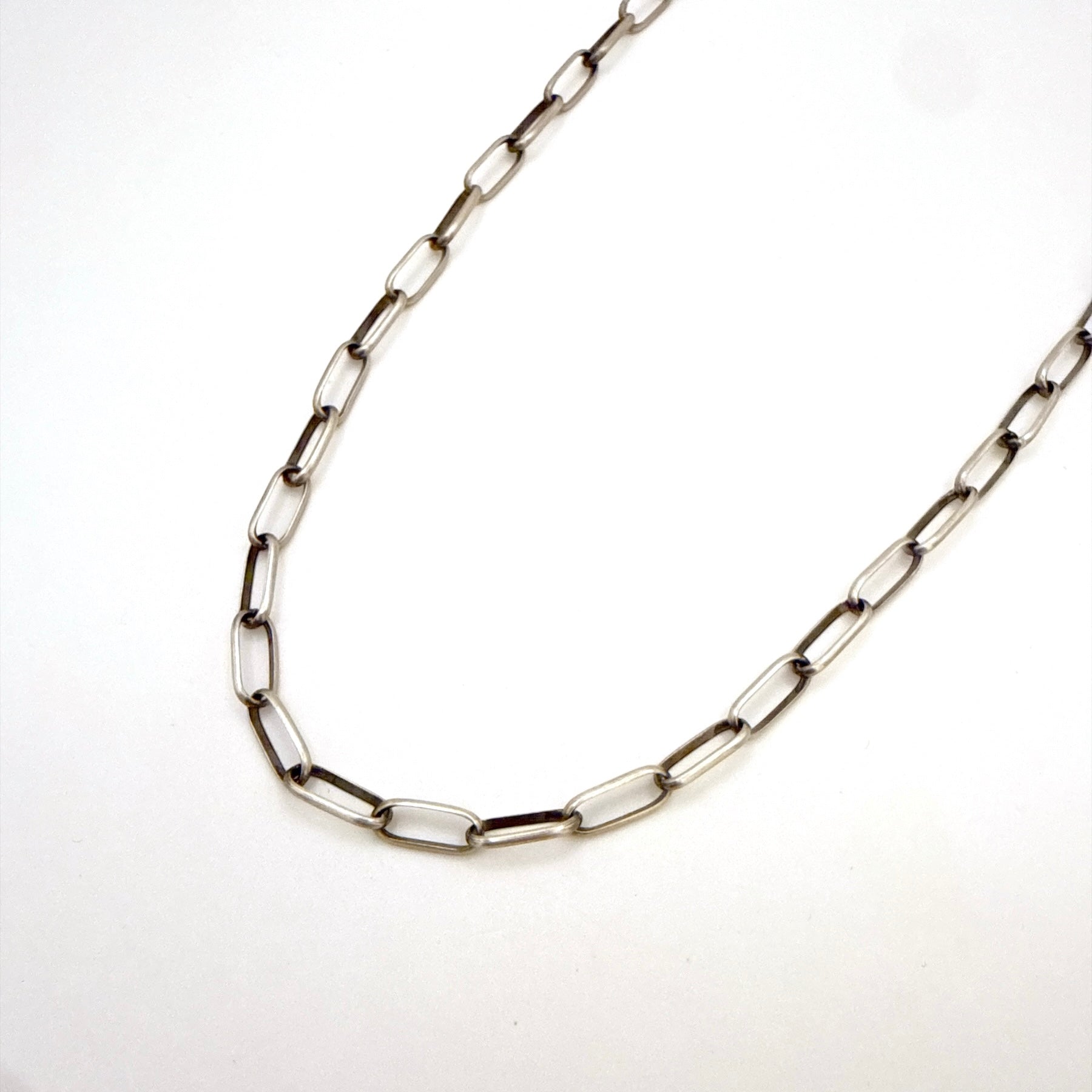 Navajo handmade sterling silver chain necklace by Navajo artist Sally Shirley. Crafted from solid 925 sterling silver, this chain features elongated hand formed links with a classic Southwestern look. The hook closure allows for adjustable length up to 24 inches, making it easy to wear alone or with pendants. A timeless, versatile piece designed for everyday wear.