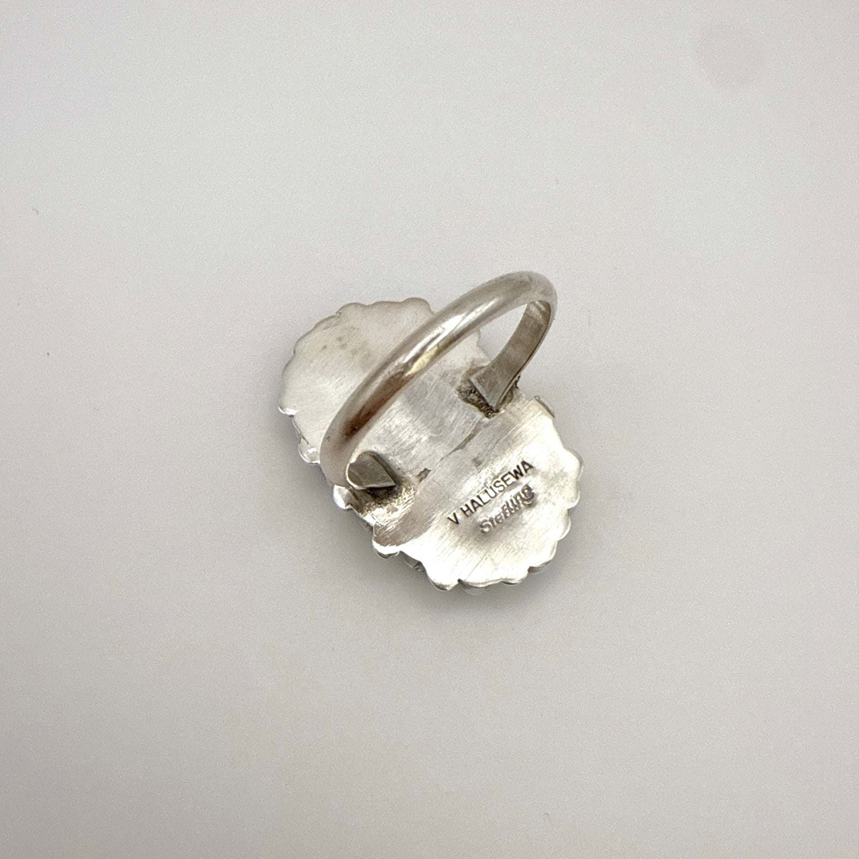 This sterling silver cluster ring is handcrafted by Zuni artist Vera Halusewa and features intricate needlepoint work with vibrant Kingman turquoise stones. The elongated oval design showcases precise stone setting and traditional Zuni craftsmanship. This statement ring adds a striking touch of turquoise beauty, suitable for daily wear or special occasions.