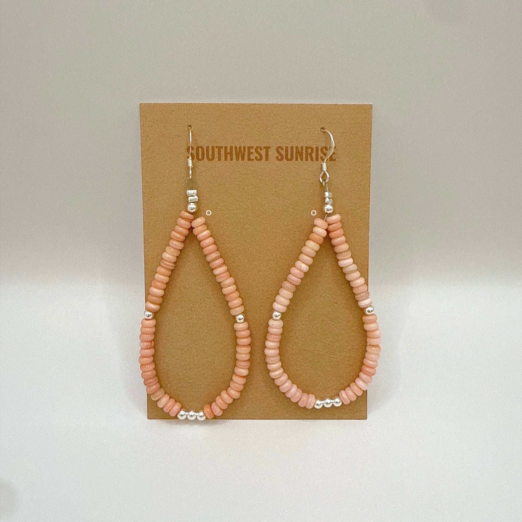 Showcasing the soft natural beauty of pink conch shell, these handcrafted heishi earrings feature hand strung conch beads accented with sterling silver beads and finished with sterling silver hooks. Their lightweight teardrop shape brings a warm Southwestern touch, making them perfect for everyday wear or special occasions.