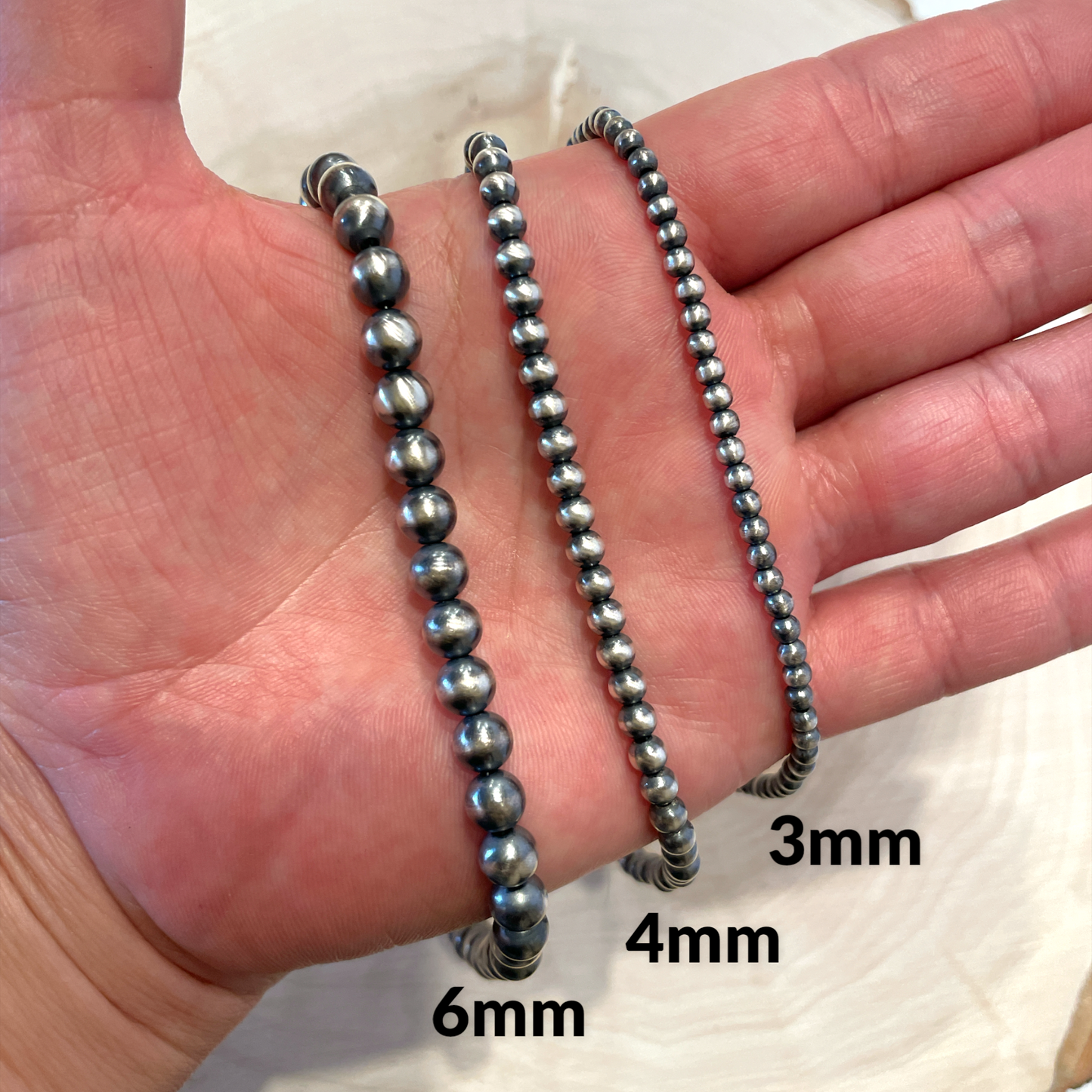 Elevate your style with this stunning Round Oxidized Navajo Pearls Necklace. Hand-strung by Navajo artist Reva Goodluck, this 18" necklace features 6mm oxidized sterling silver round beads and a secure hook clasp closure. The handcrafted design showcases traditional Navajo craftsmanship, making it a perfect addition to any jewelry collection. Whether worn alone or layered, this timeless piece adds a touch of Southwestern elegance to any outfit.
