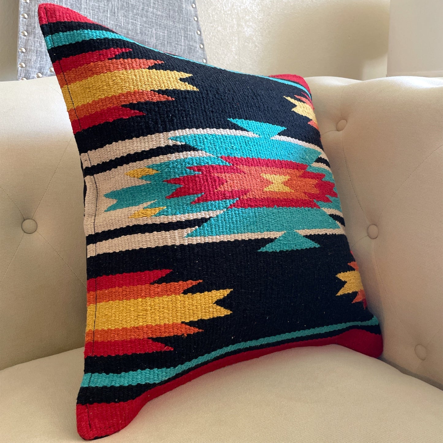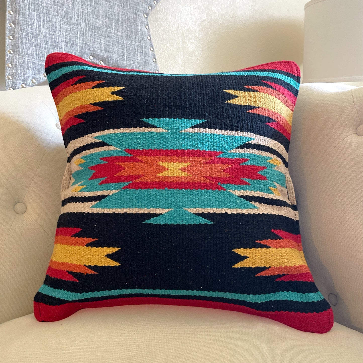 Add a touch of Southwestern charm to your home with this handcrafted pillow cover. Featuring a detailed woven design, durable canvas back, and a convenient zipper closure, this piece blends craftsmanship and function. Ideal for living rooms, bedrooms, or any space that needs a warm and artistic accent.