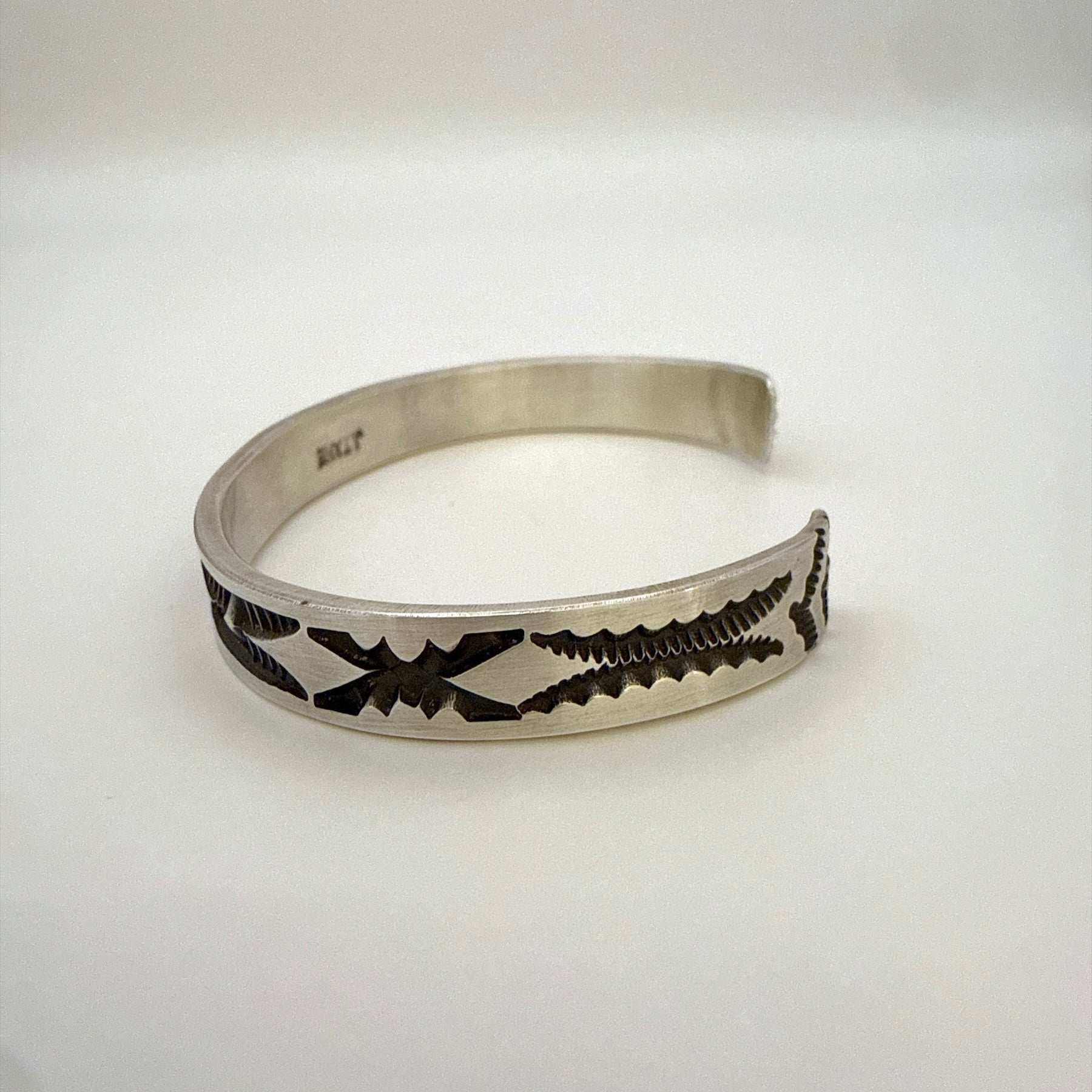 This stamped sterling silver cuff bracelet is handcrafted by Navajo artist Jerrold Tahe, known for his detailed traditional stamp work. The bracelet features a bold pattern with oxidized accents that highlight the hand applied designs. Its solid sterling silver build and clean edges make it a timeless piece suitable for everyday wear or layering with other Native American jewelry. A classic addition to any collection.