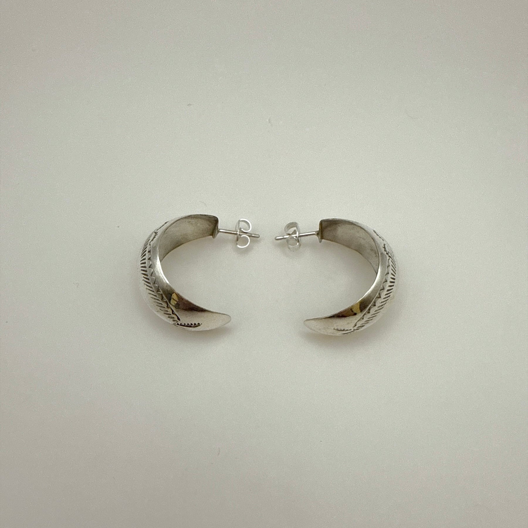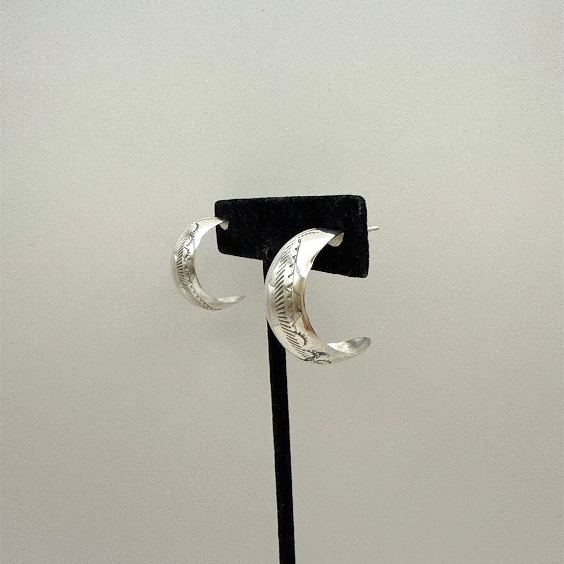 These elegant sterling silver hoop earrings, handcrafted by Navajo artist Nora Ashley, feature beautiful stamped detailing and a high polish finish. With a 1" diameter, these lightweight earrings offer a classic design that’s perfect for any occasion, adding a touch of Navajo artistry and sophistication to both casual and formal looks.