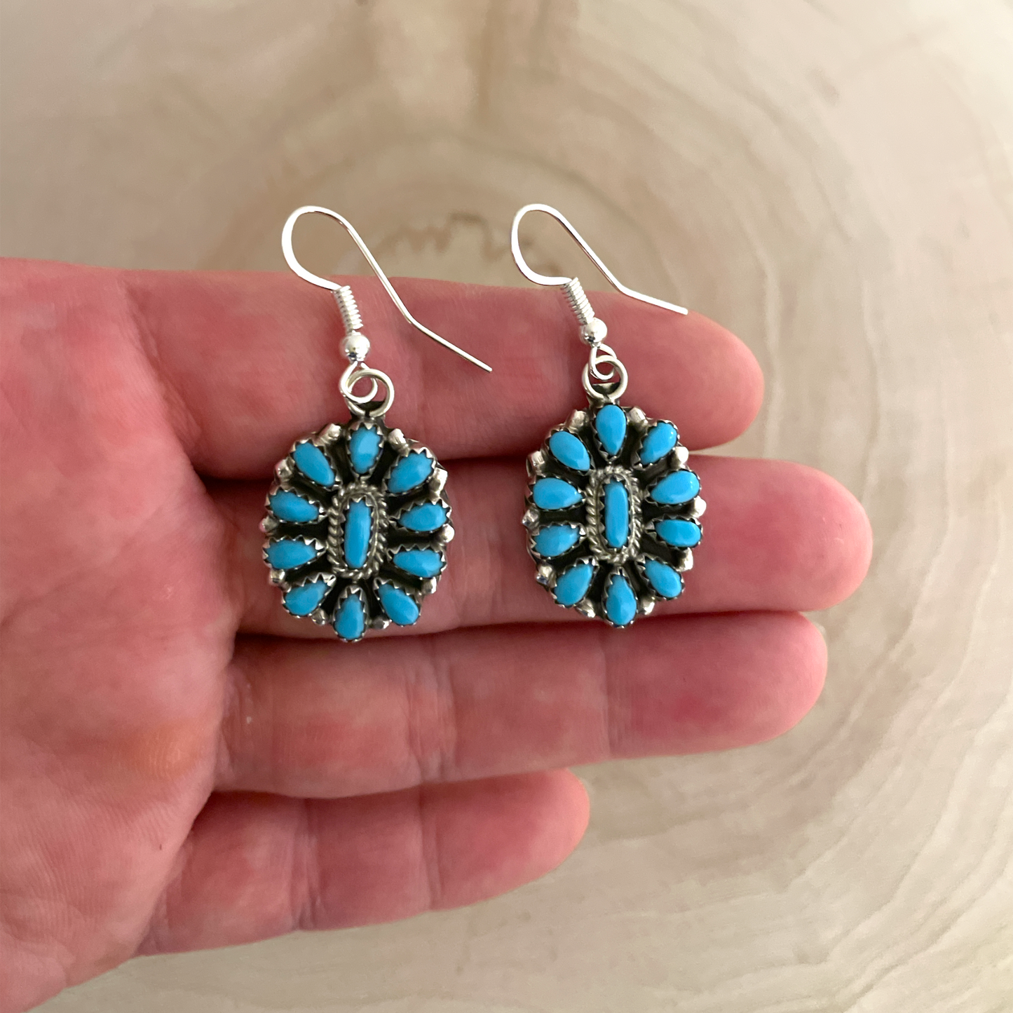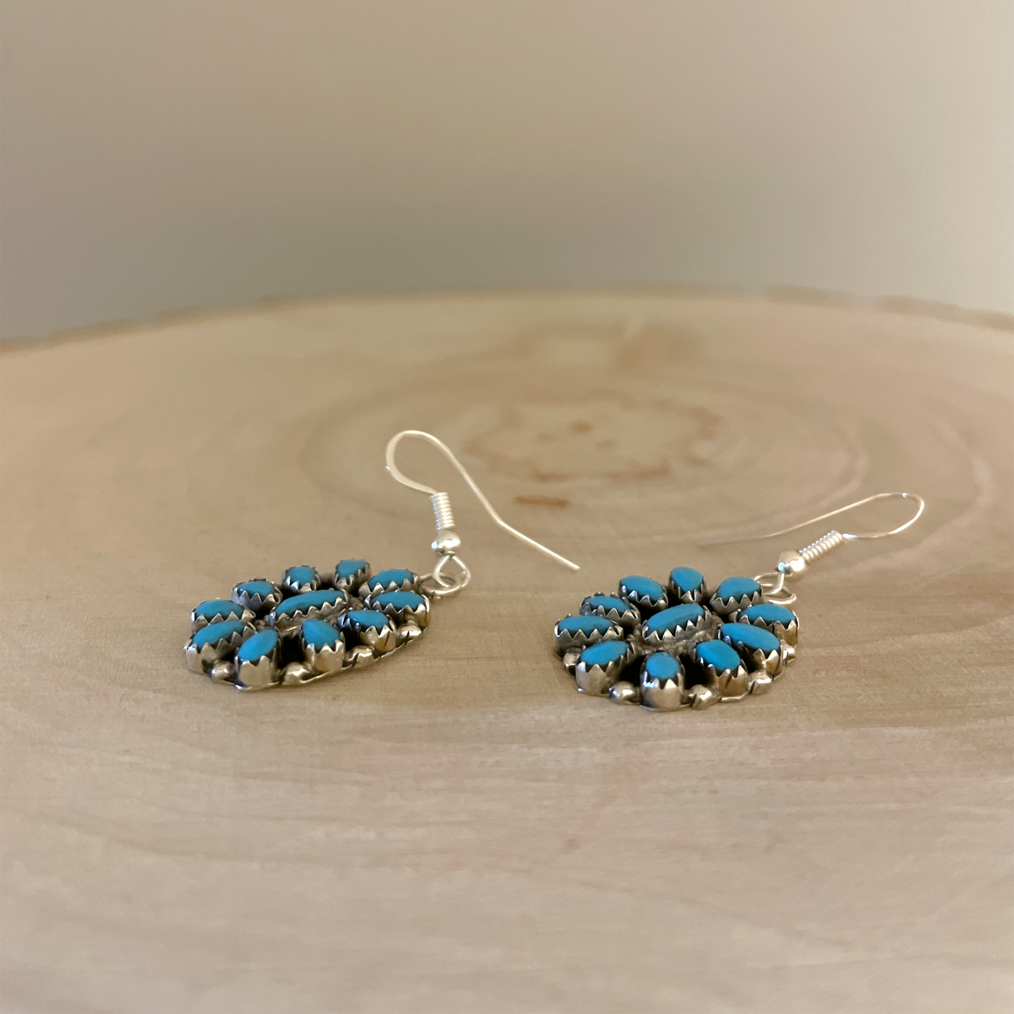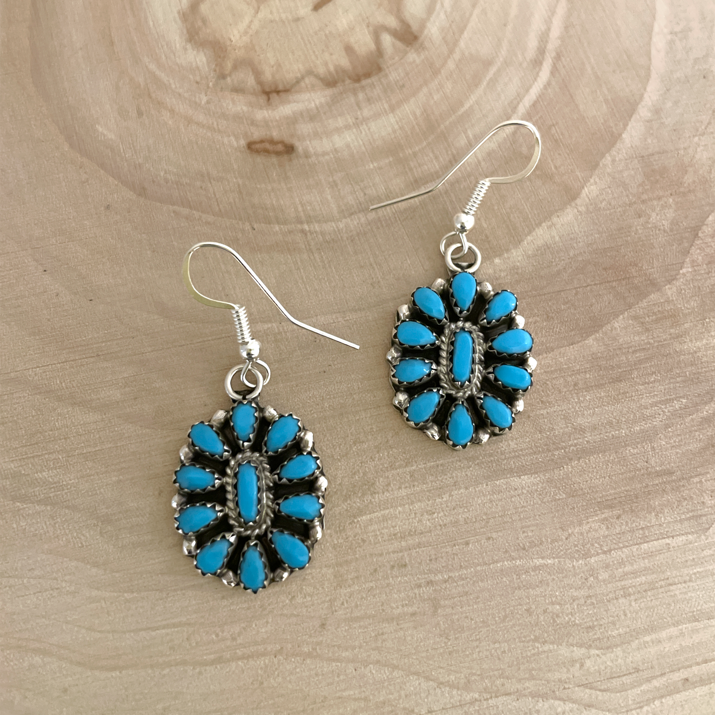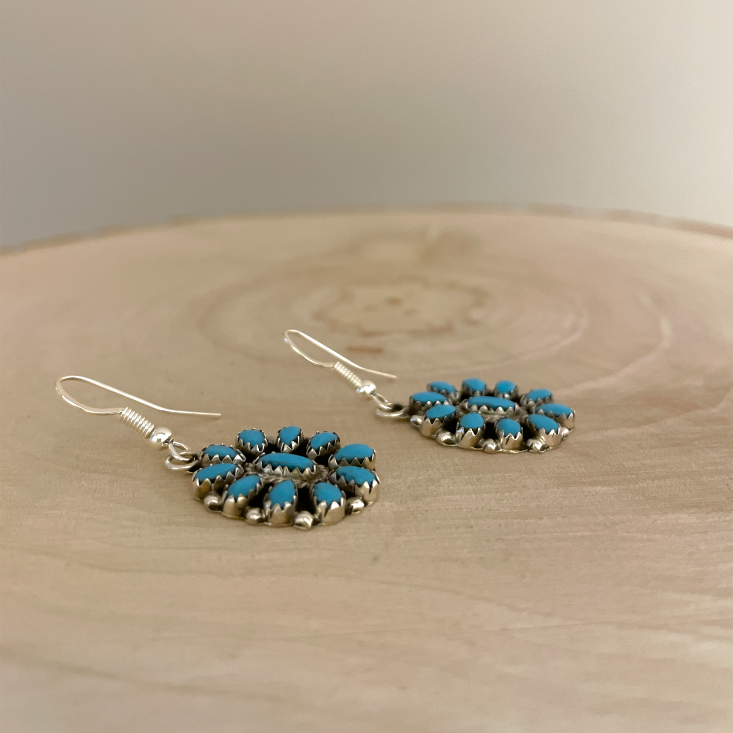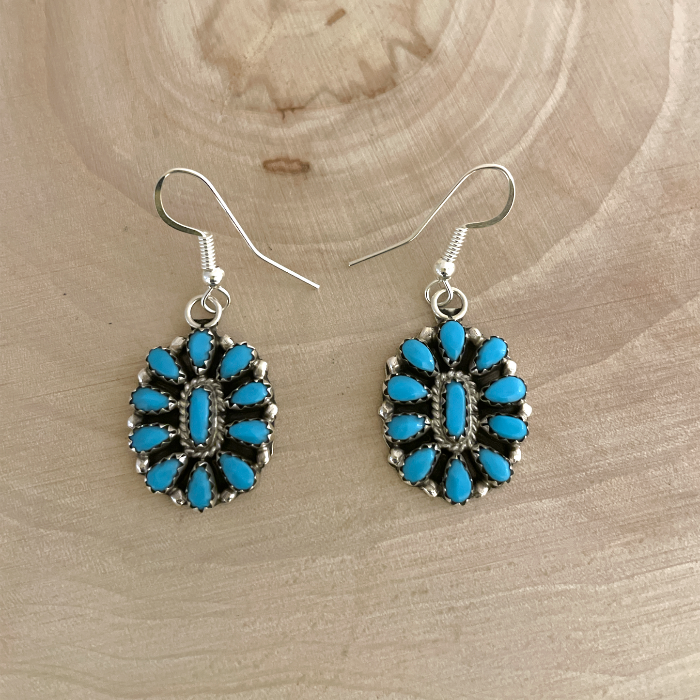 Beautiful sterling silver cluster earrings set with sleeping beauty turquoise. Handmade by Navajo artist, Eldon James. These earrings are dangle type.