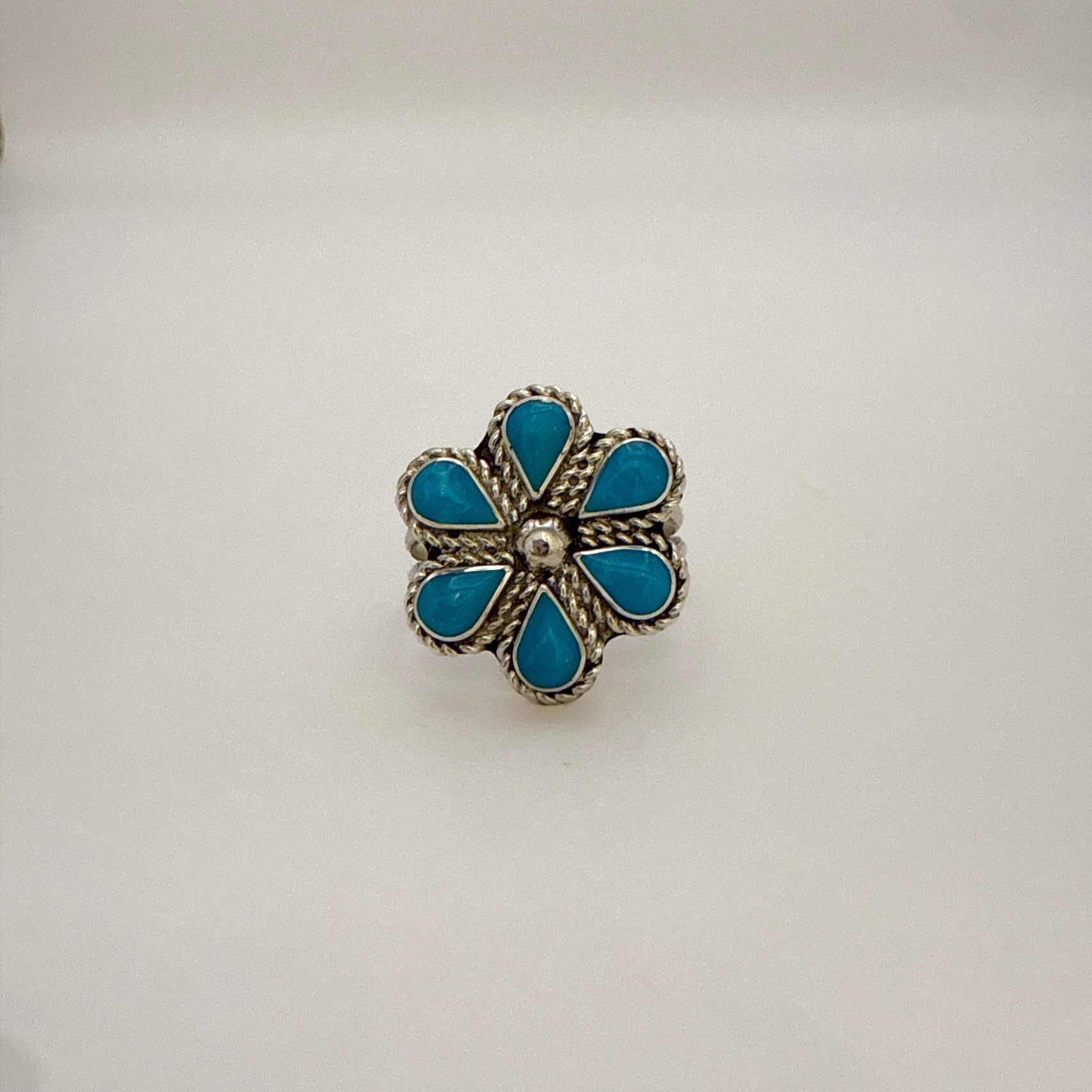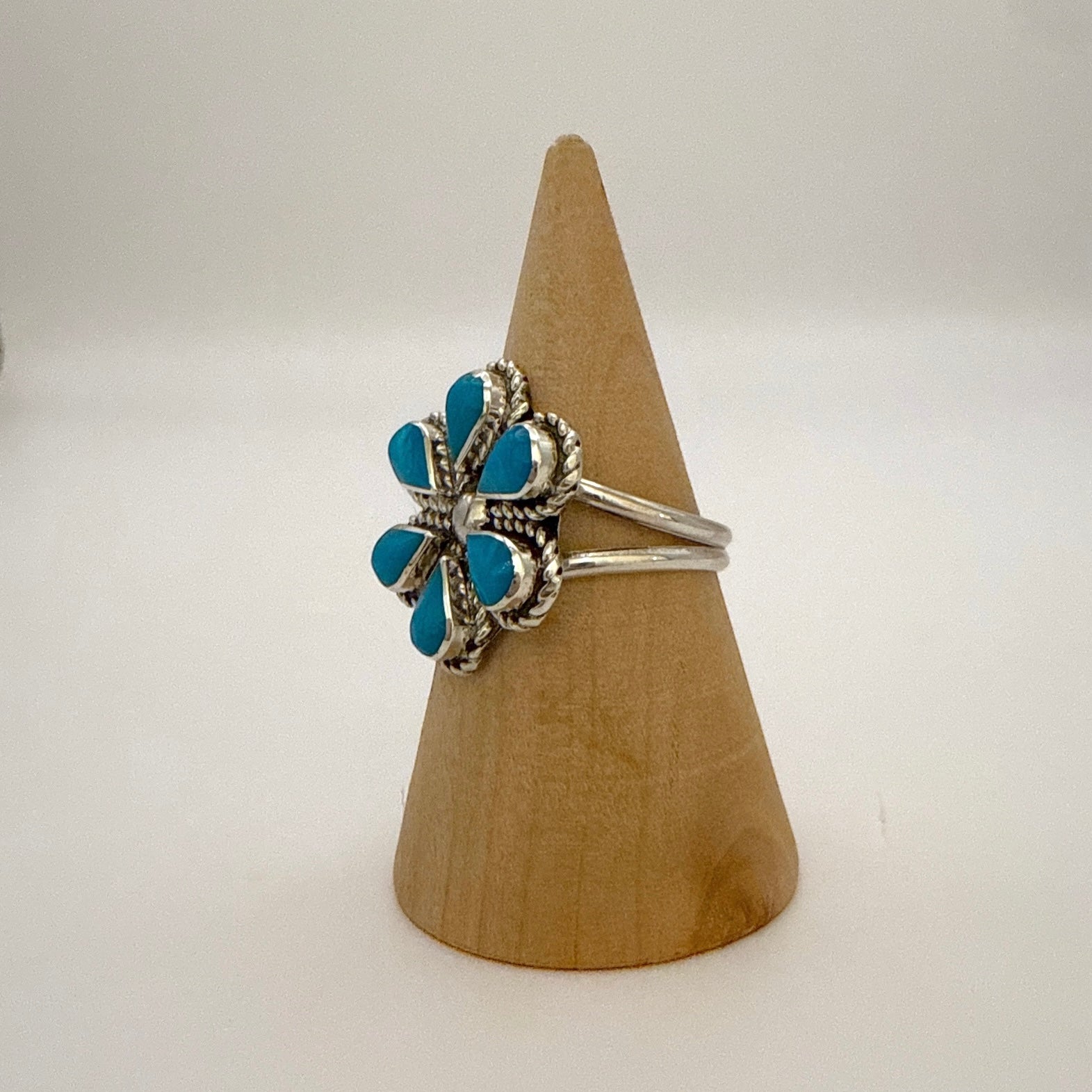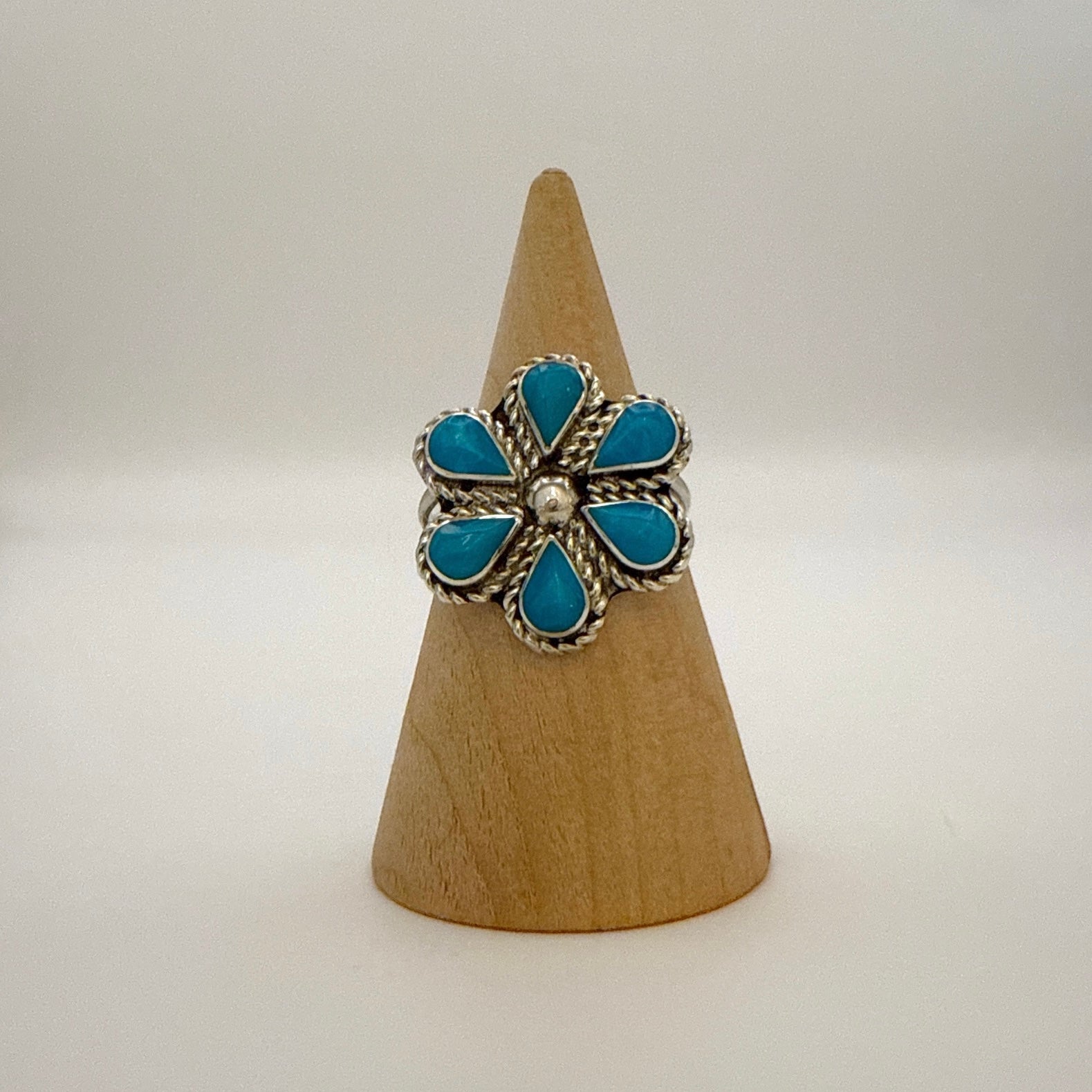 Sterling silver cluster ring, handcrafted by Zuni artist Gina Dosedo. This beautiful piece features a vibrant arrangement of genuine Kingman turquoise stones, showcasing classic Zuni clusterwork with timeless Southwestern charm. Perfect for both daily wear and special occasions, this size 8 ring adds an elegant touch to any jewelry collection.