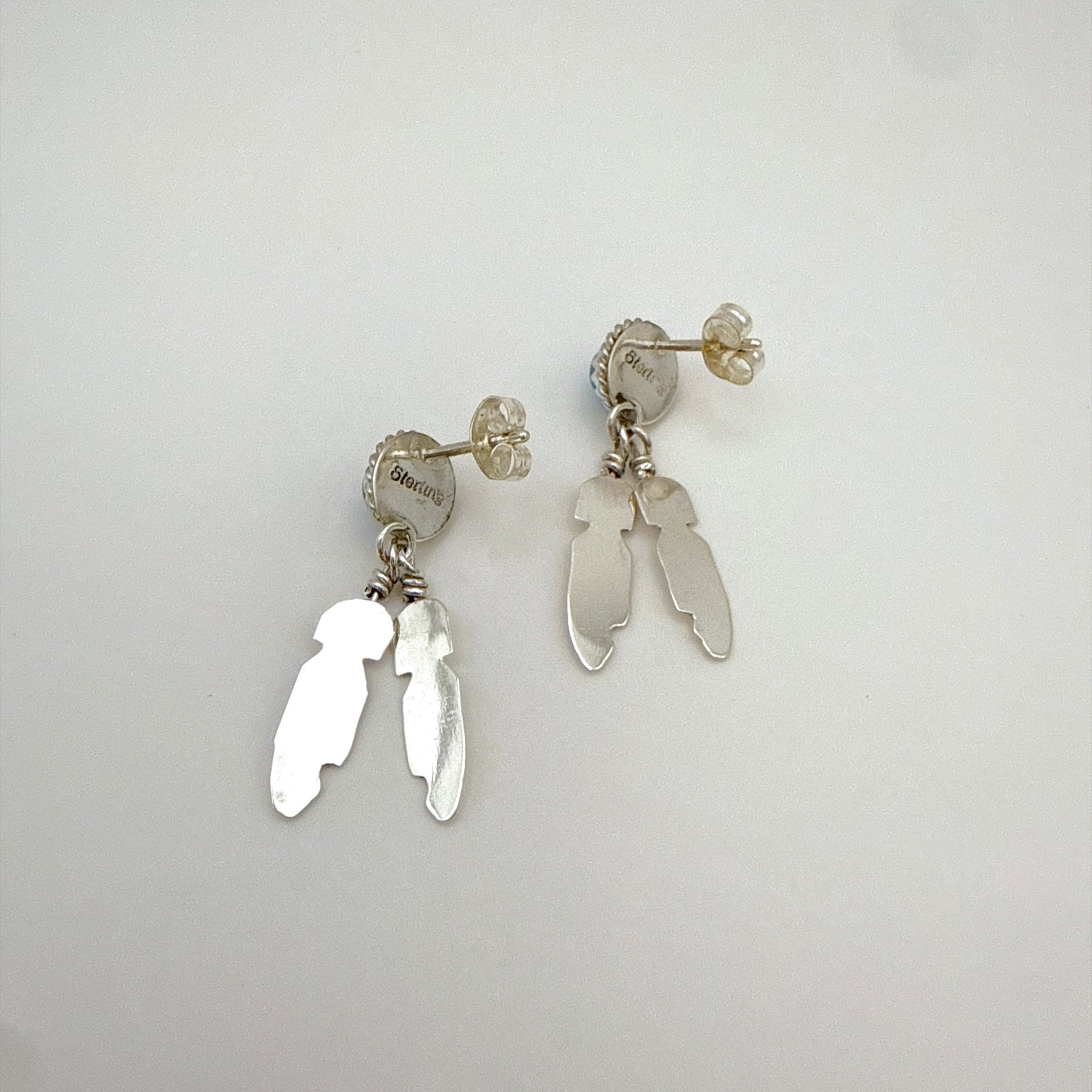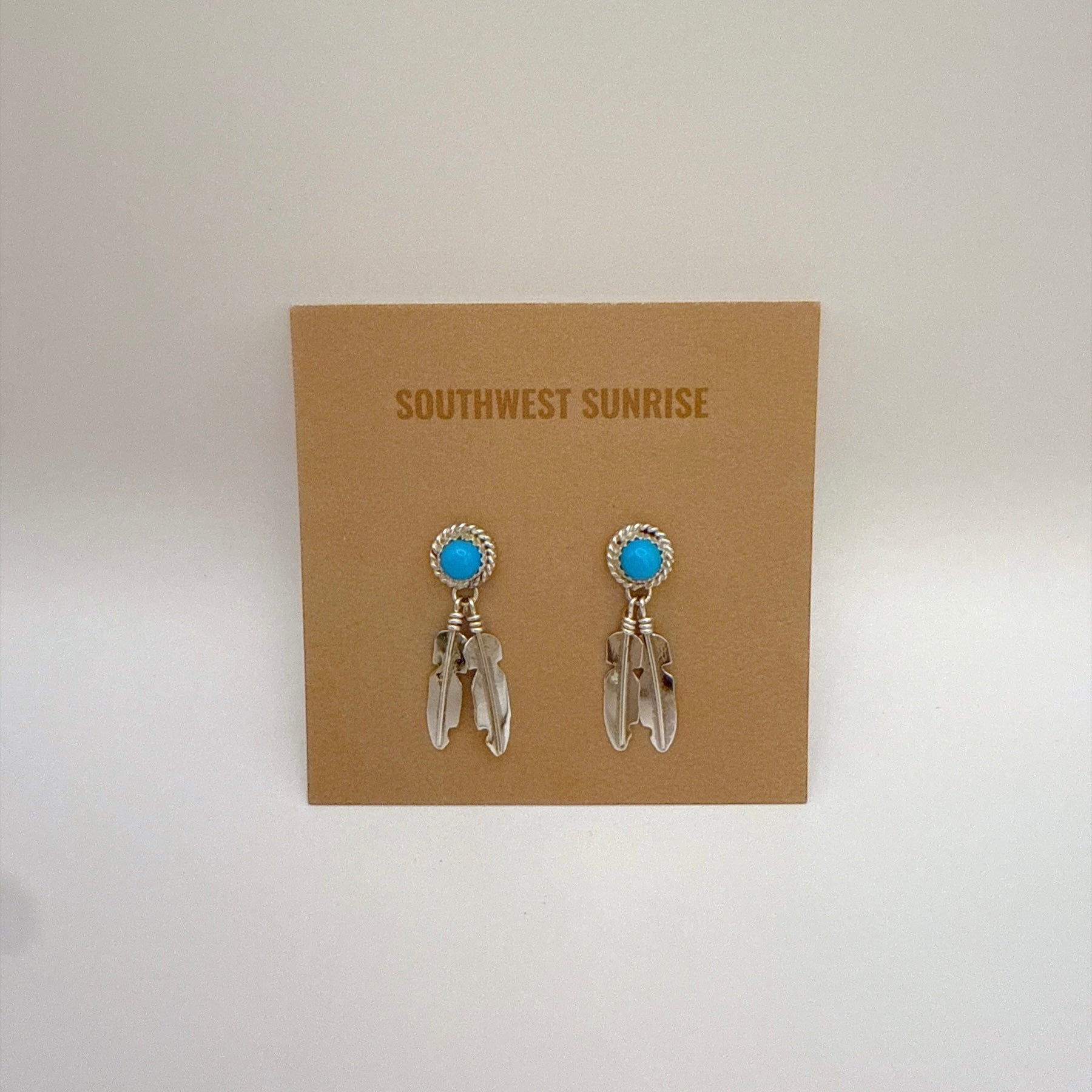 These sterling silver feather earrings are set with genuine Kingman turquoise and handcrafted by Navajo artist Theresa Kinsel. The two feather pieces dangle gently for added movement, while the secure post back closure ensures comfortable wear throughout the day. A beautiful blend of traditional craftsmanship and Southwestern charm, perfect for any occasion.