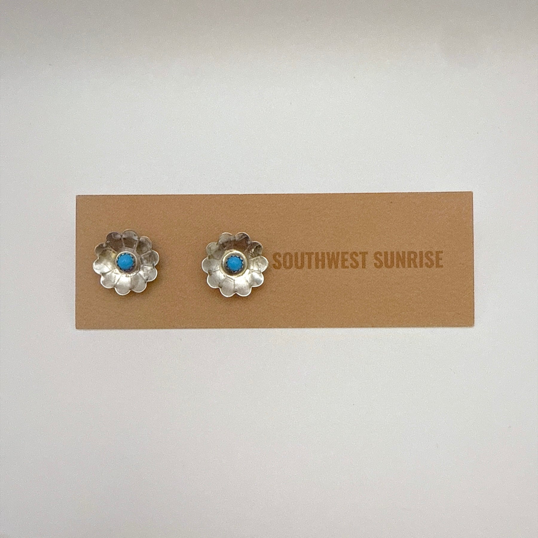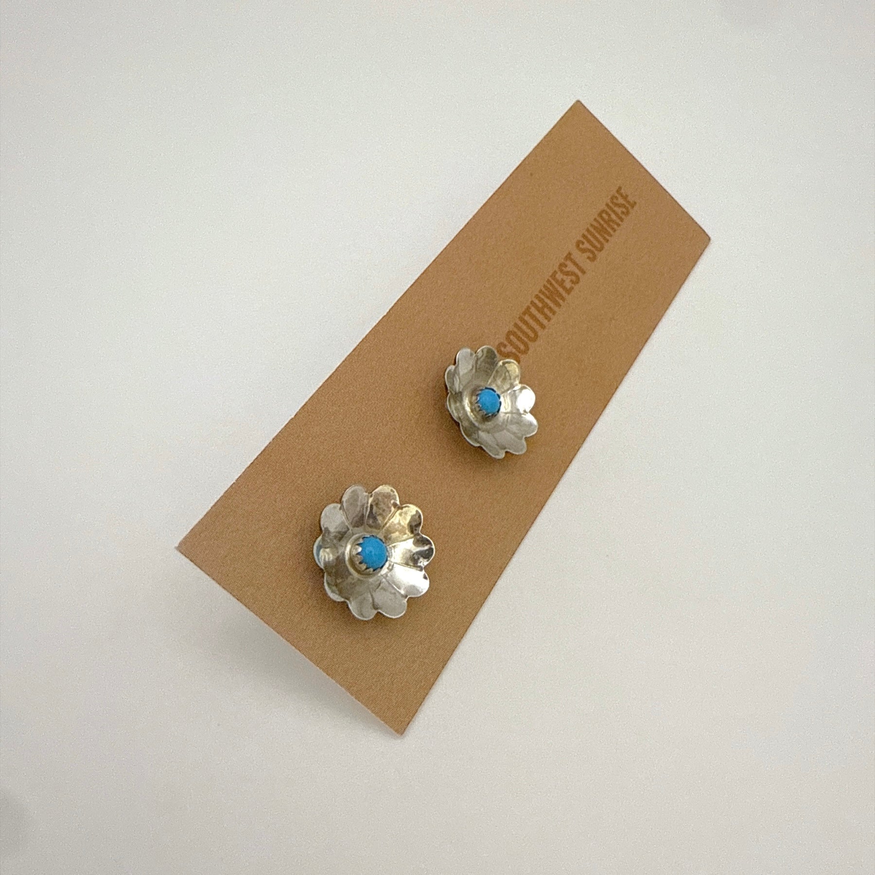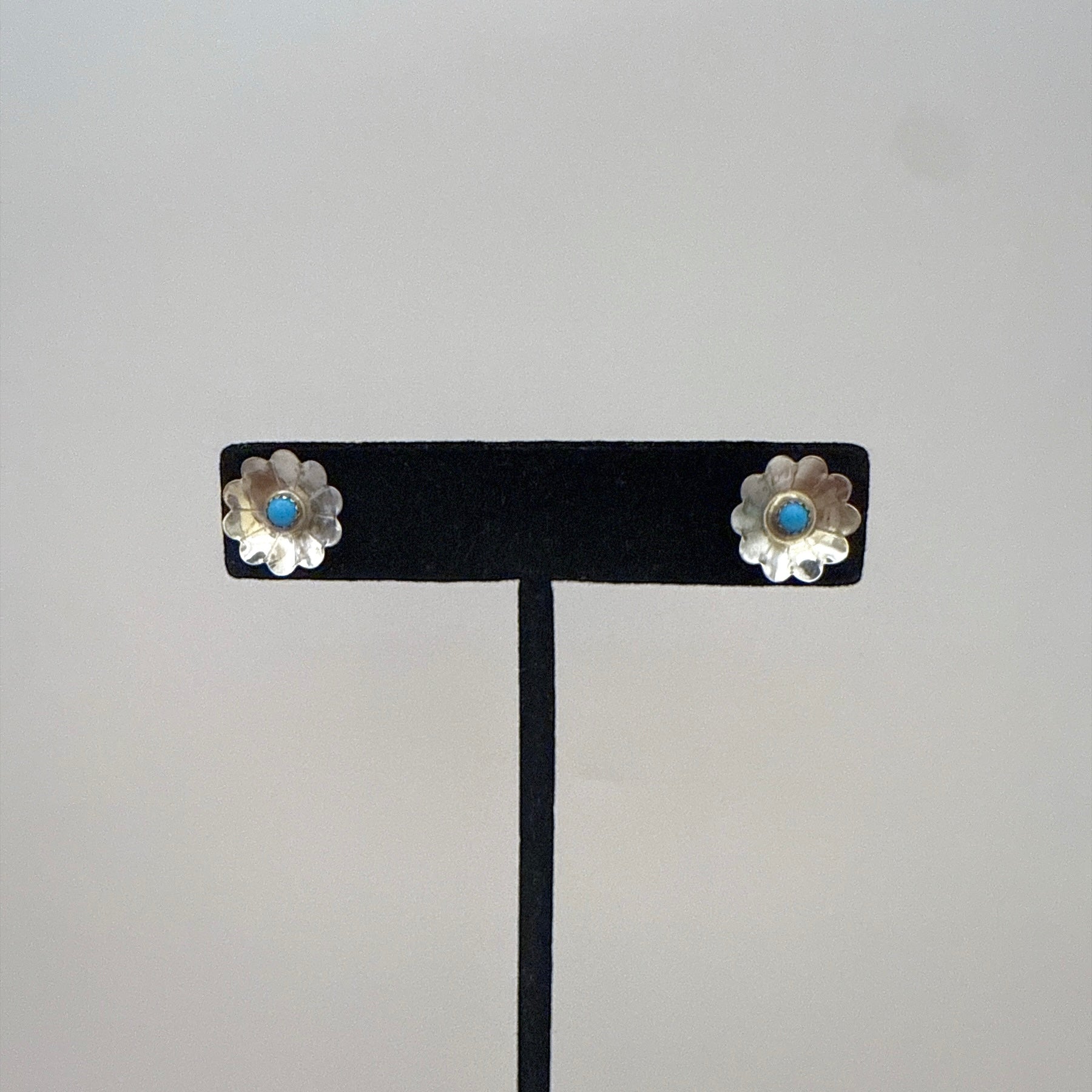 These charming sterling silver flower stud earrings are set with natural Sleeping Beauty turquoise stones. Handmade by a Navajo artist, each stud features a delicate floral design that adds a playful yet timeless touch to any outfit. Lightweight and easy to wear with a secure post back, they're perfect for everyday use or as a thoughtful gift.