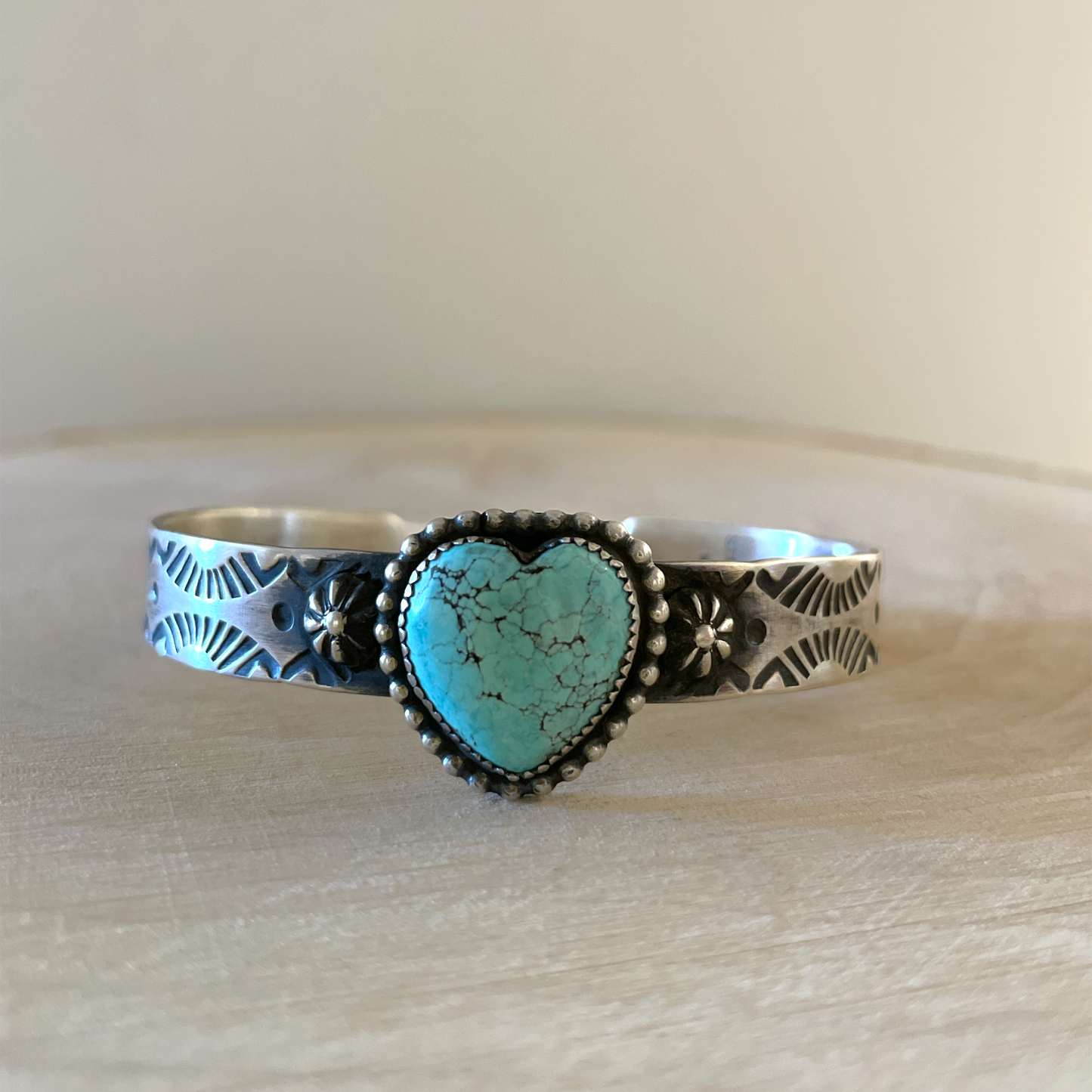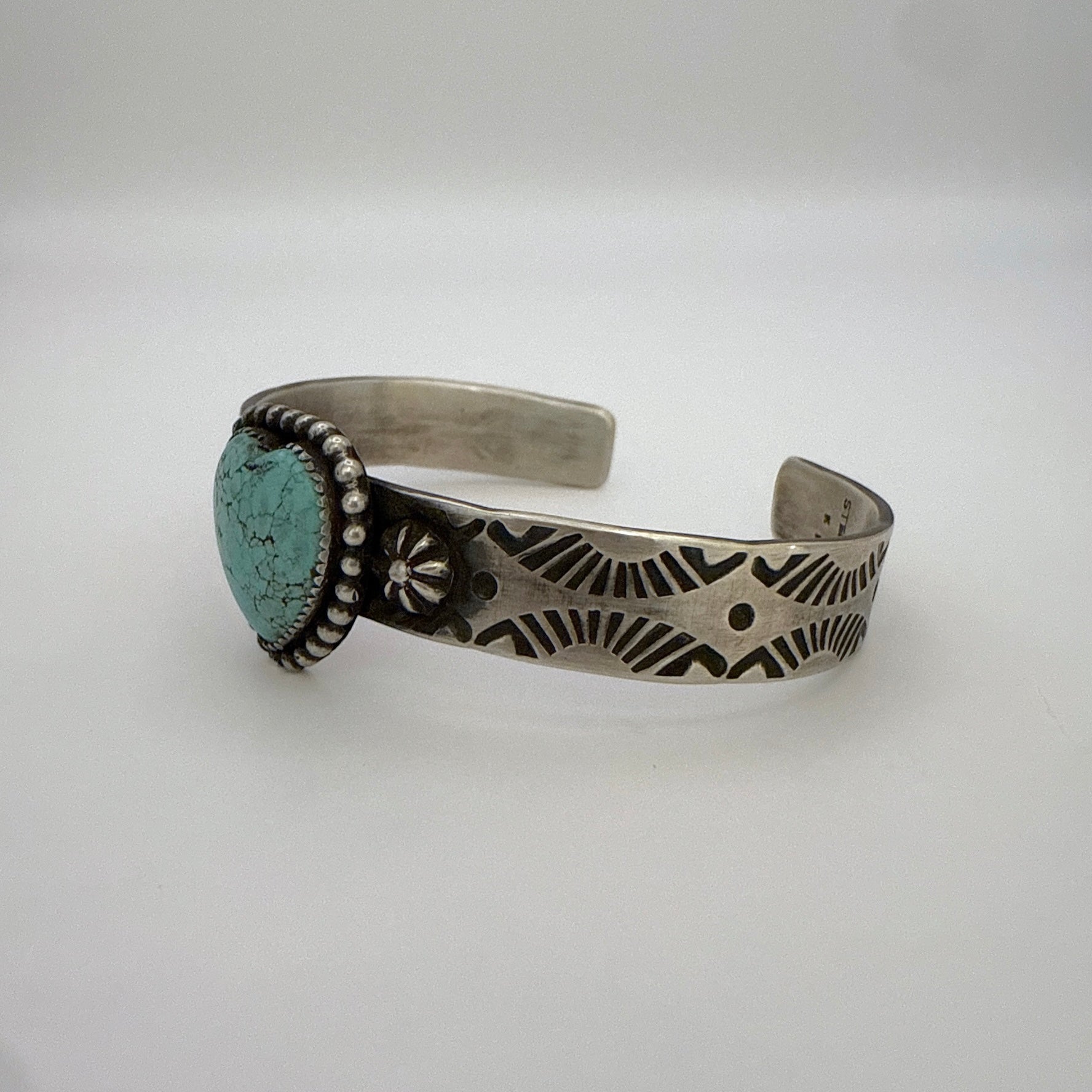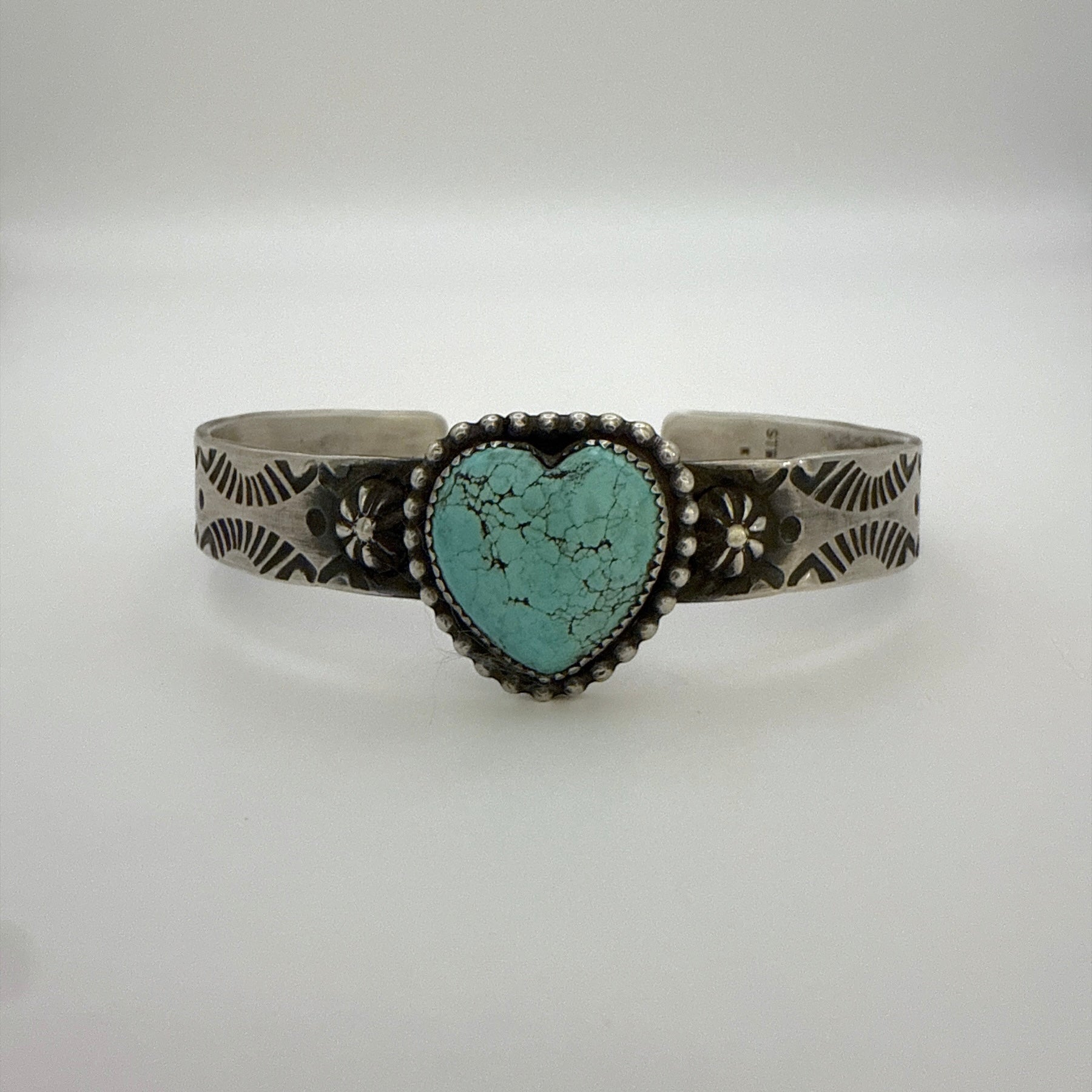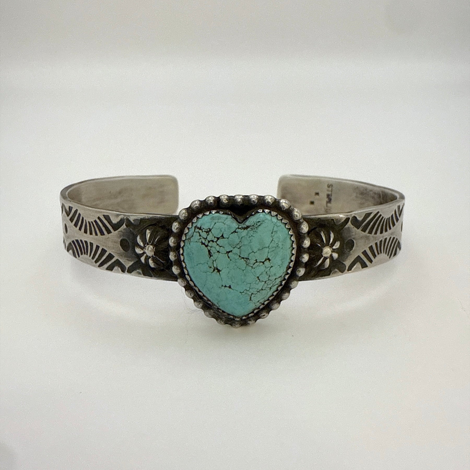 This handcrafted sterling silver cuff bracelet features a heart shaped Chinese turquoise stone set at the center, created by Navajo silversmith Kinsley Natoni. The detailed hand stamped designs and oxidized finish give this piece a classic Southwestern character. Slightly adjustable for comfort, it is a meaningful and elegant addition to any collection.