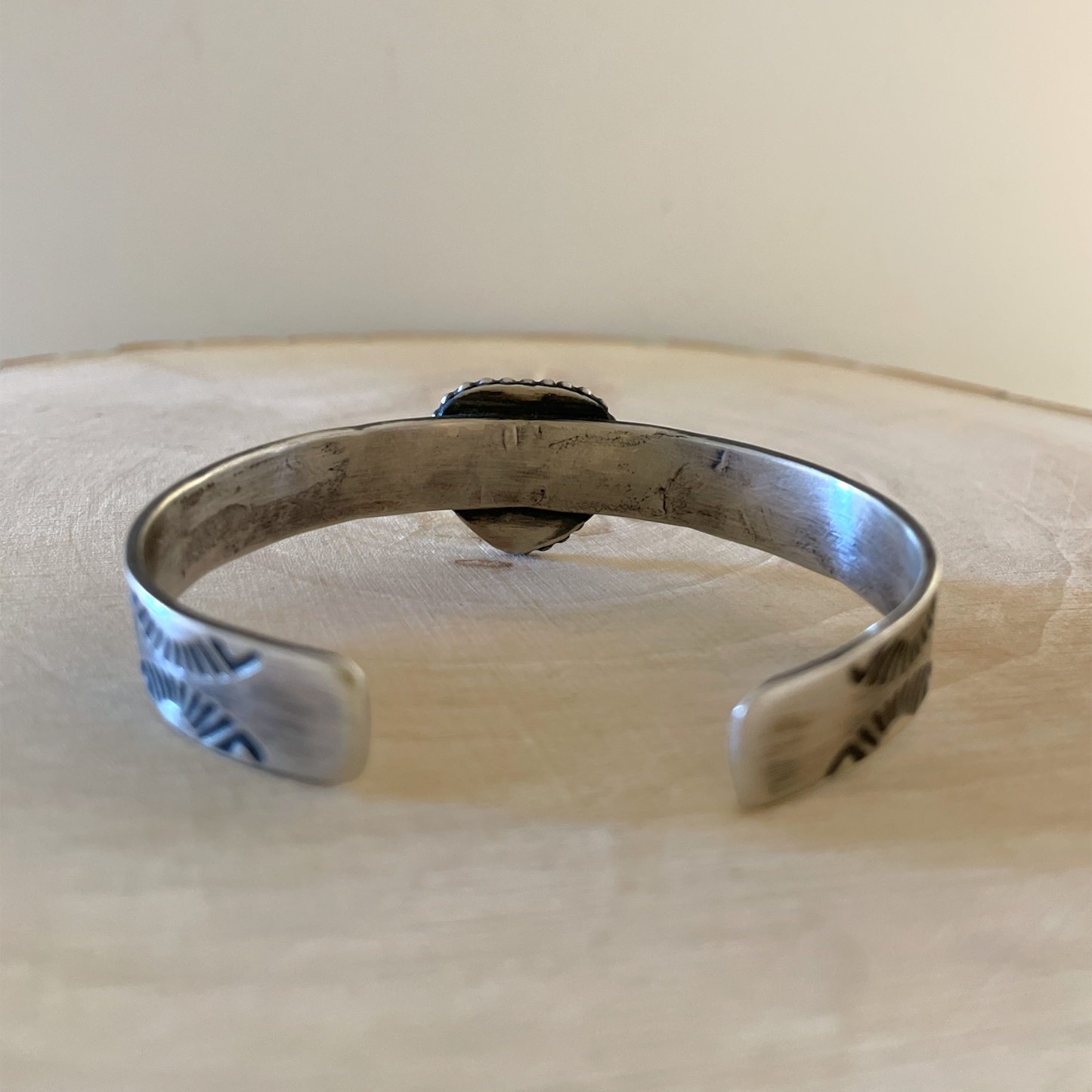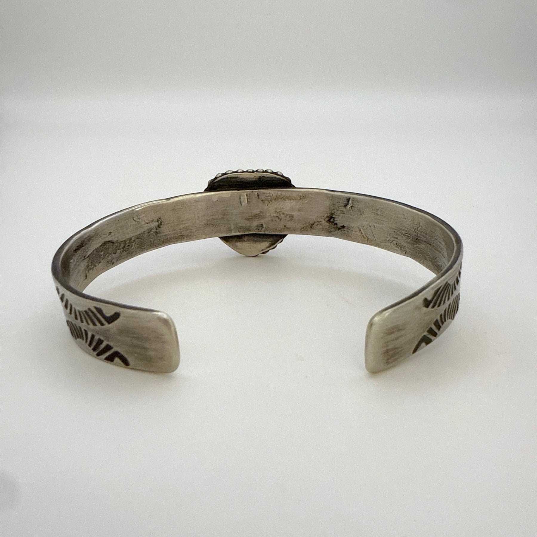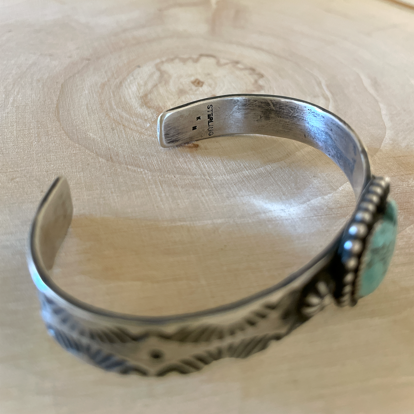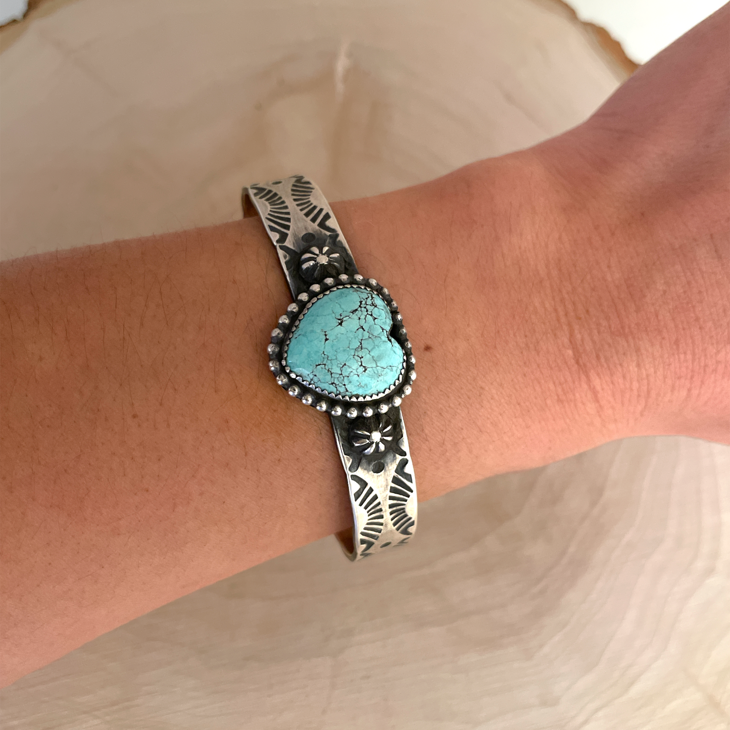 This handcrafted sterling silver cuff bracelet features a heart shaped Chinese turquoise stone set at the center, created by Navajo silversmith Kinsley Natoni. The detailed hand stamped designs and oxidized finish give this piece a classic Southwestern character. Slightly adjustable for comfort, it is a meaningful and elegant addition to any collection.