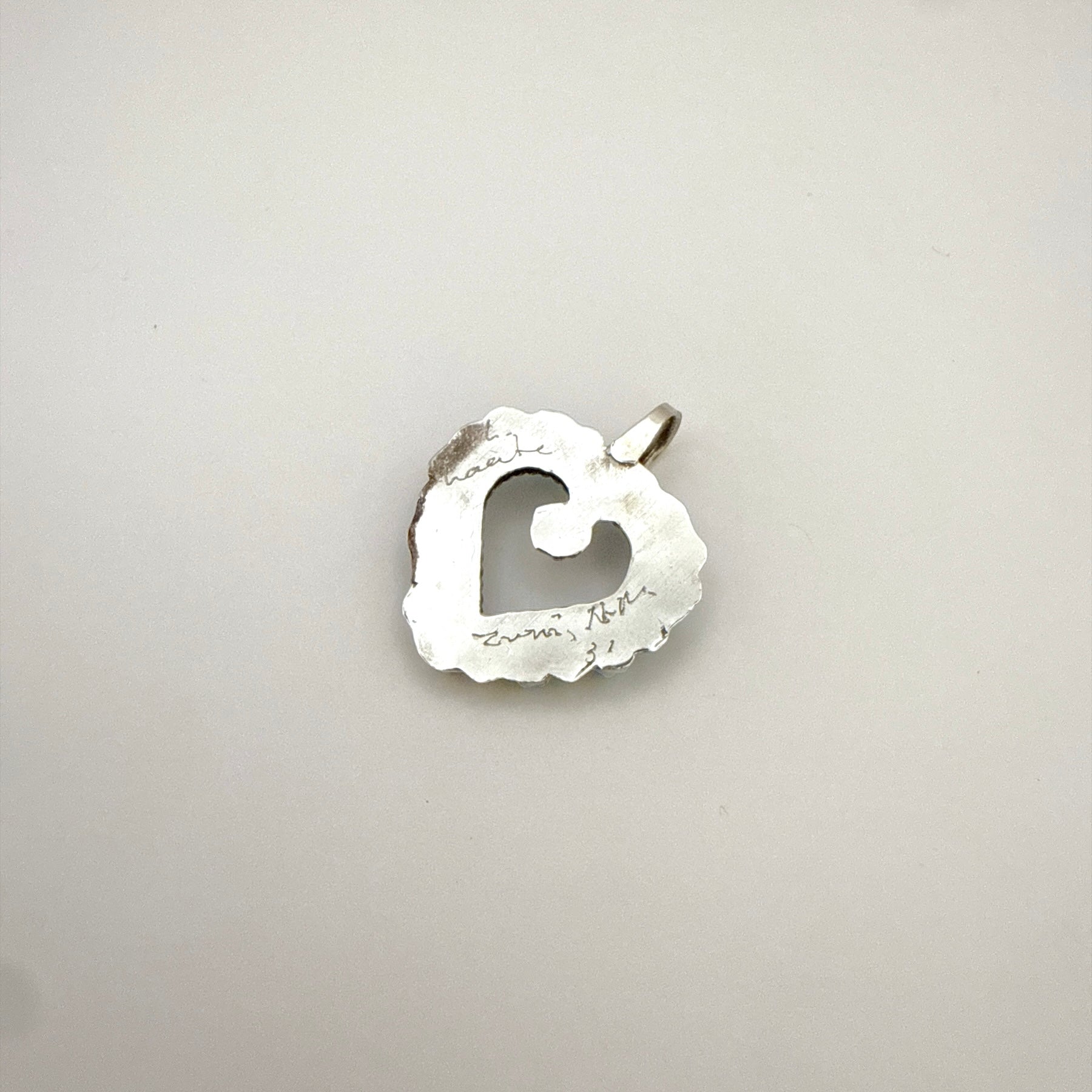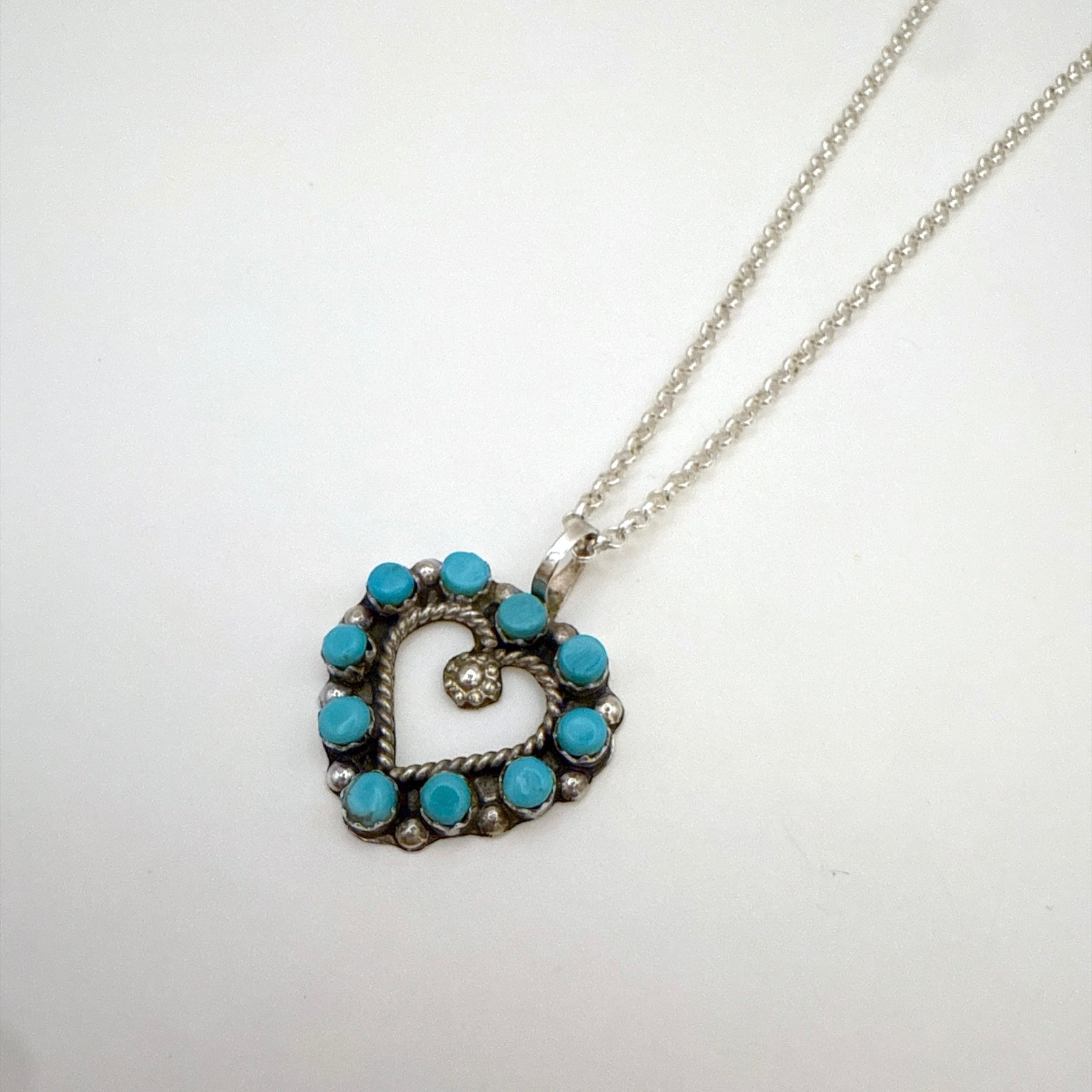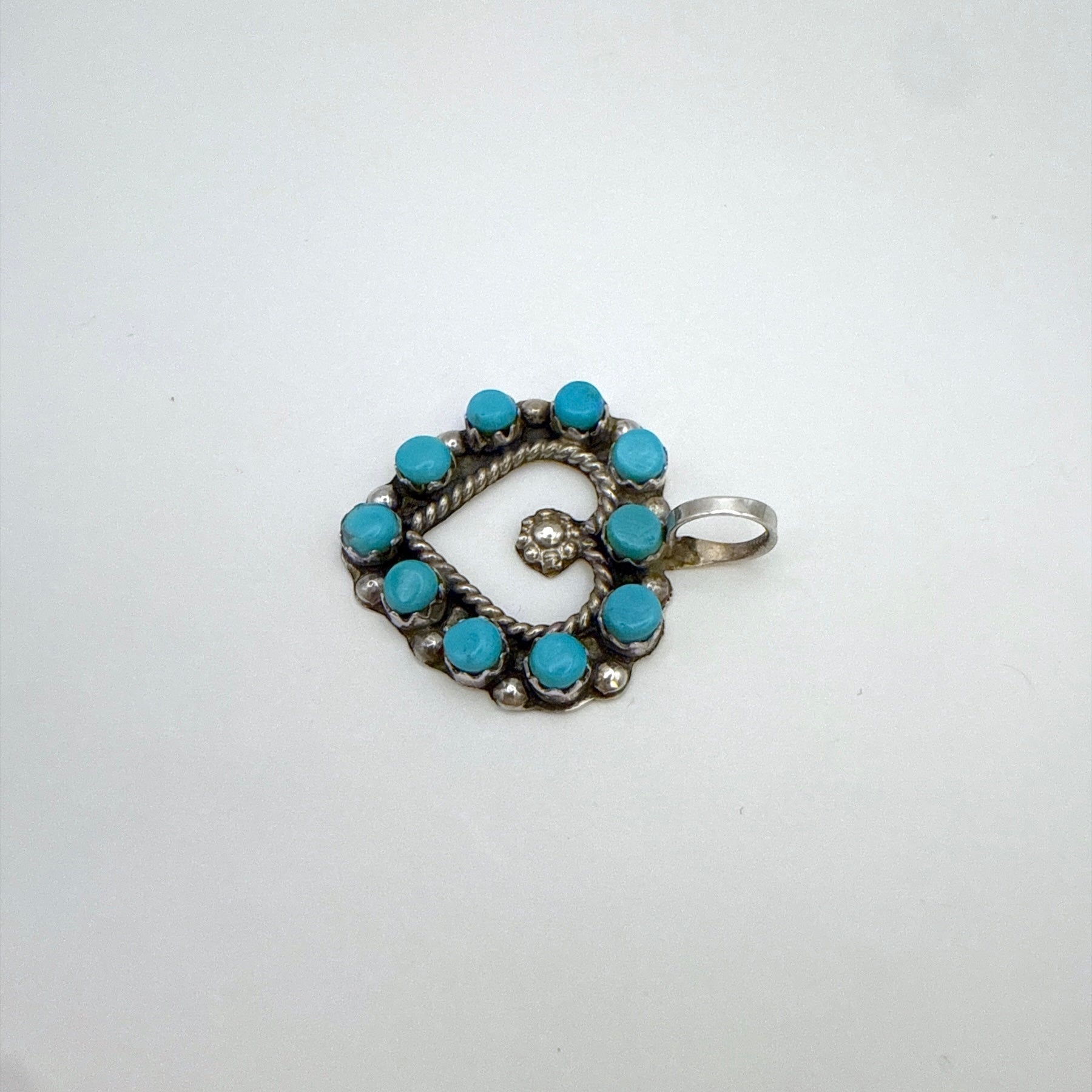 This sterling silver heart pendant is handcrafted by Zuni artist L. Laate. It features vibrant Kingman turquoise stones arranged in a detailed heart design, highlighting the beauty of traditional Zuni craftsmanship. Perfect for layering or wearing on its own, this meaningful piece adds a touch of Southwest artistry to any collection.