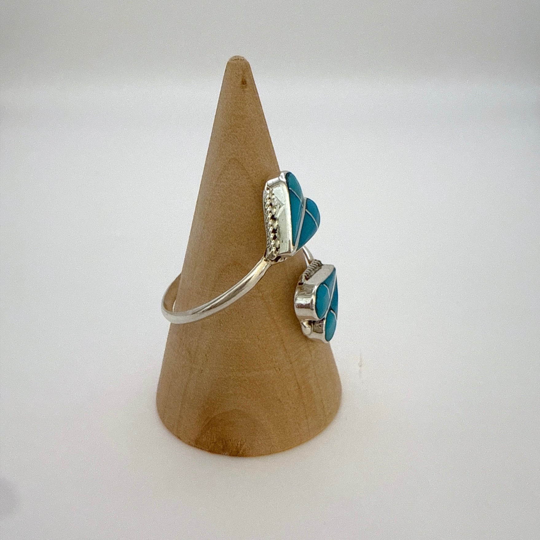 This sterling silver heart inlay ring is set with Sleeping Beauty turquoise and handcrafted by Zuni artist RVN. The open front heart design features beautifully arranged turquoise inlay work that reflects traditional Zuni craftsmanship. The ring is adjustable up to two sizes larger or smaller, making it comfortable and versatile for everyday wear.