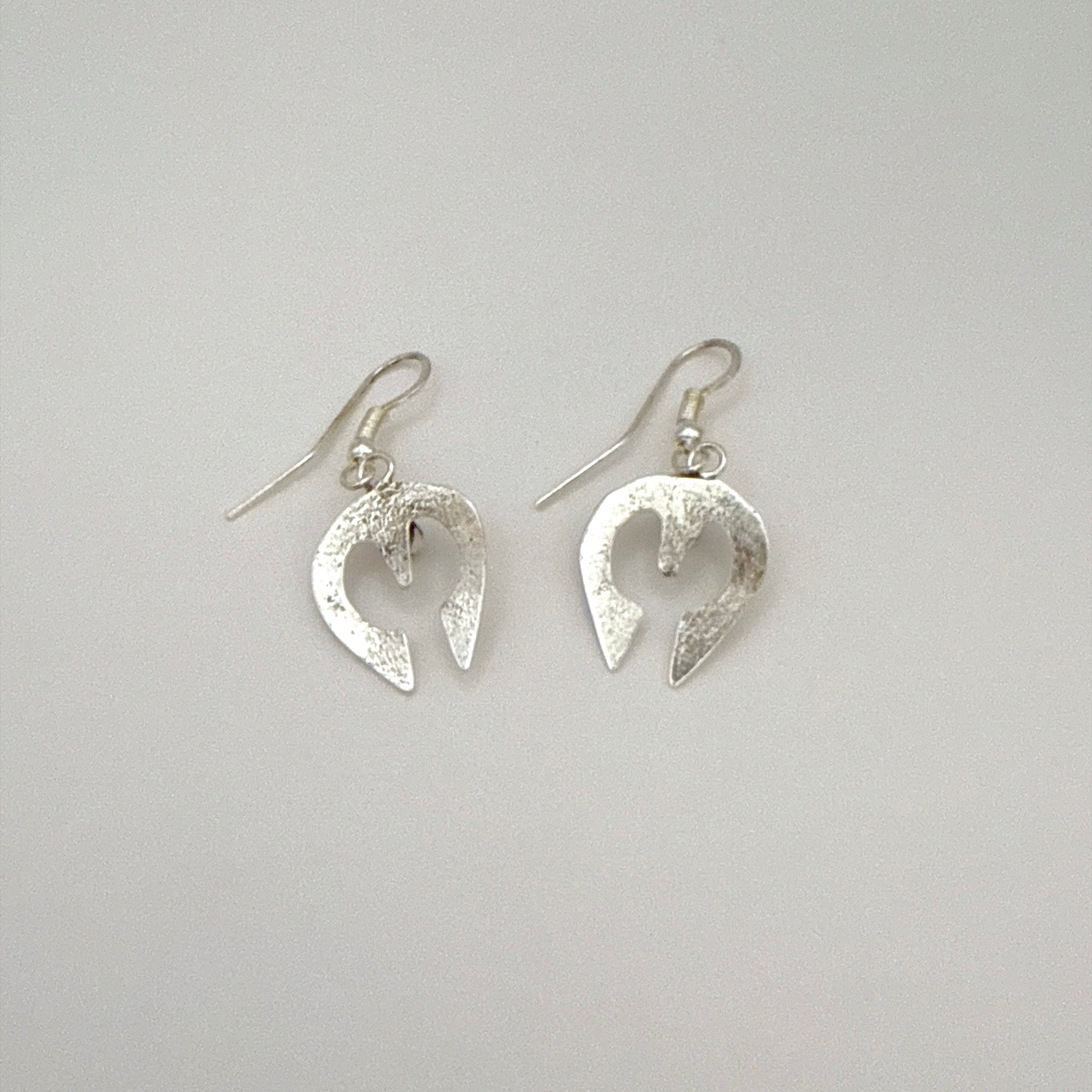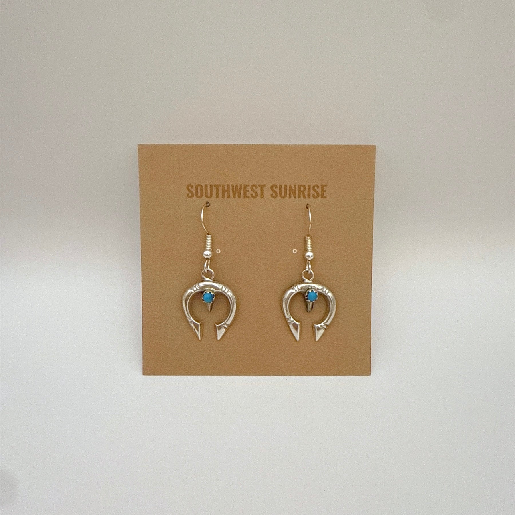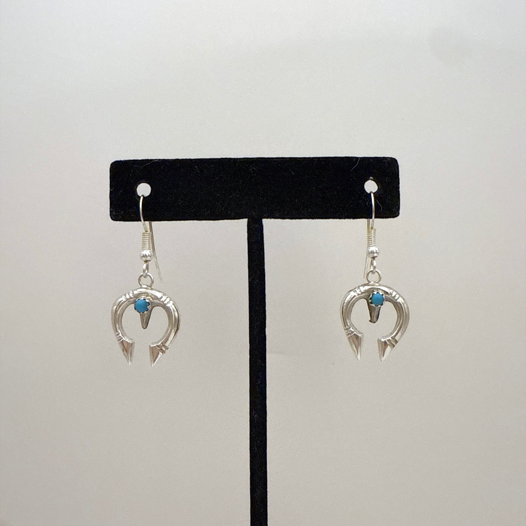 These sterling silver Naja dangle earrings feature a classic Navajo design set with genuine Kingman turquoise. Handcrafted by Navajo artist Lorraine Chee, each piece showcases detailed silverwork and a traditional Naja silhouette. Lightweight and easy to wear, they hang from French wire hooks for a comfortable fit.