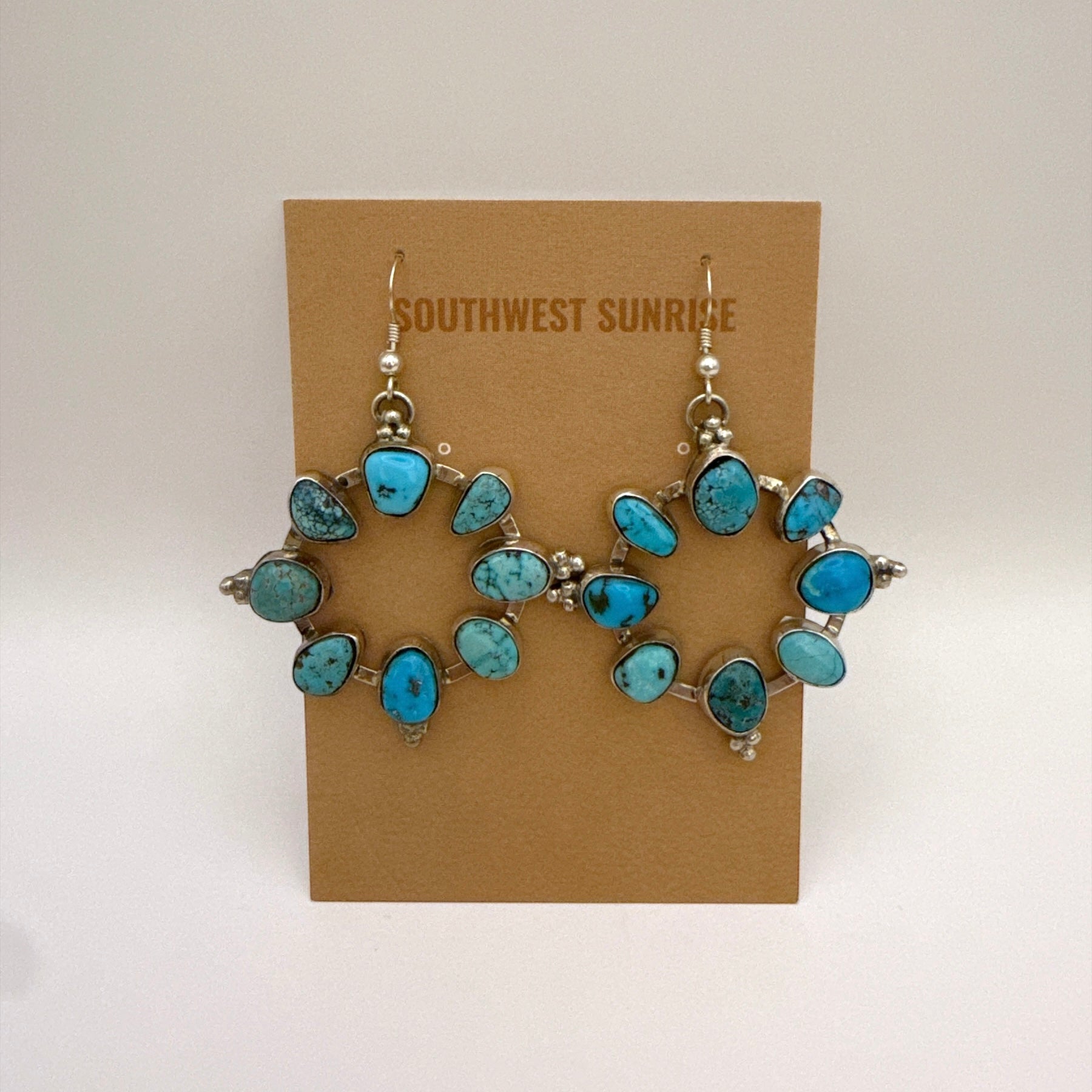 These Turquoise Round Dangle Earrings are handcrafted by Navajo silversmith Geraldine James. Each earring features eight natural Arizona turquoise stones set in sterling silver, arranged in a circular cluster that creates a bold and eye catching silhouette. Their vibrant color and detailed craftsmanship make them a beautiful accessory for both everyday wear and special occasions.