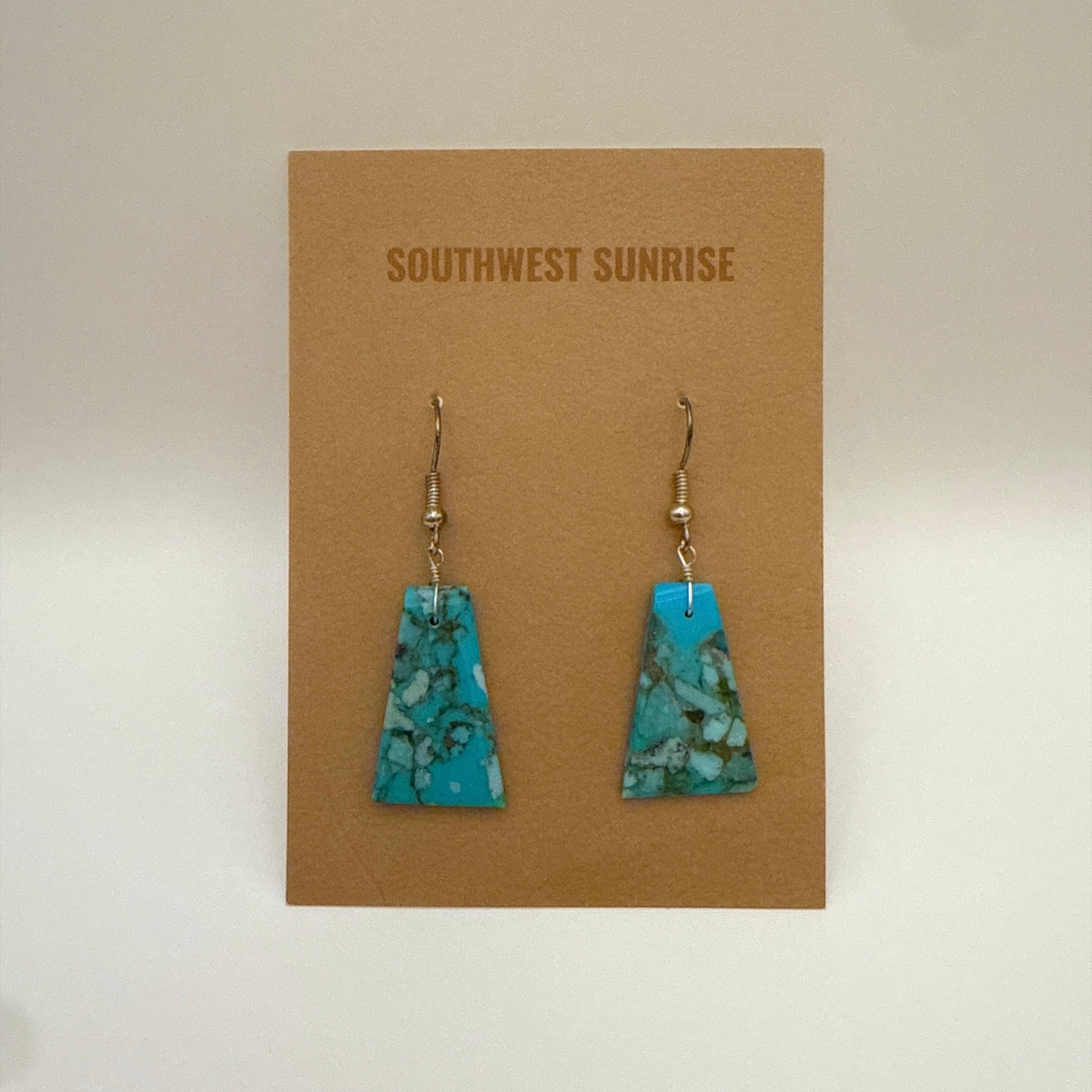 These turquoise slab earrings are handcrafted by Navajo artist Jameson Pete. Each earring features a tapered turquoise slab paired with sterling silver French wire hooks. The clean, minimal shape highlights the vibrant color while adding a subtle touch of Southwestern style. Lightweight and easy to wear, they bring a simple pop of color to any outfit.