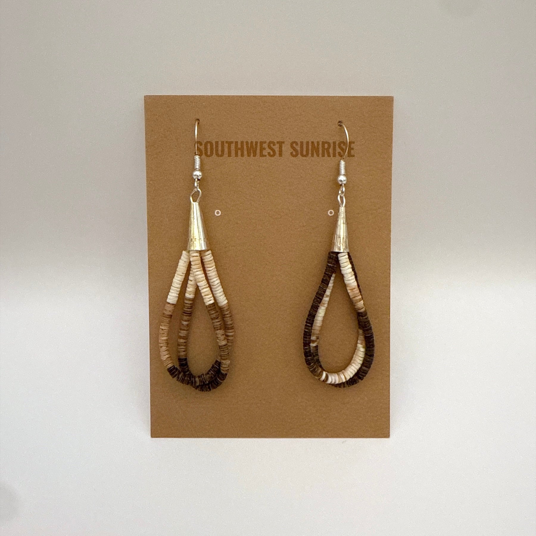Add a touch of authentic Native American artistry to your look with these stunning two strand shell heishi earrings, handcrafted by Santo Domingo artist Ramona Bird. Featuring a beautiful blend of brown and beige shell beads, each strand is carefully strung to create a timeless design, complemented by sterling silver accents. Lightweight and comfortable, these earrings are perfect for daily wear or special occasions, adding a subtle, earthy elegance to any outfit.
